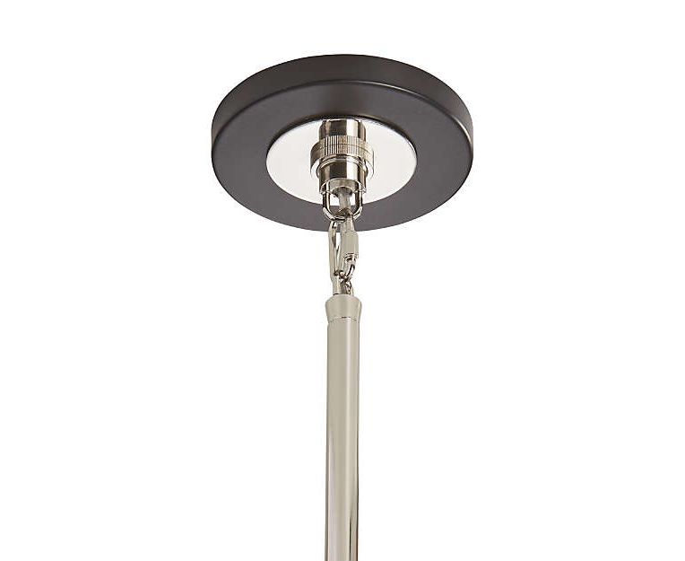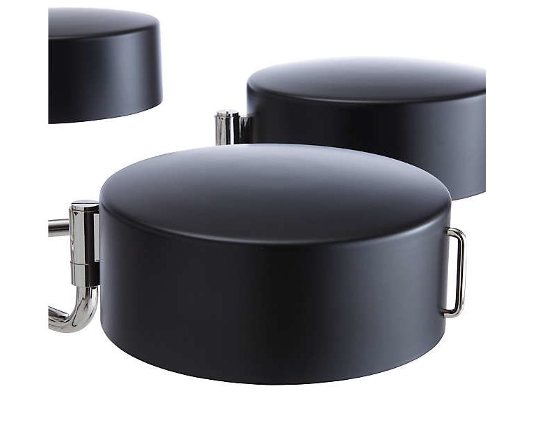 Эта низкопрофильная, ударопрочная люстра отличается гладкой полированной никелевой рамой и обтекаемыми плафонами. Покрытые роскошной черной матовой отделкой, абажуры имеют белые внутренние части для максимального свечения и поворот наружу для увеличения диаметра люстры с 65 до 94 см.