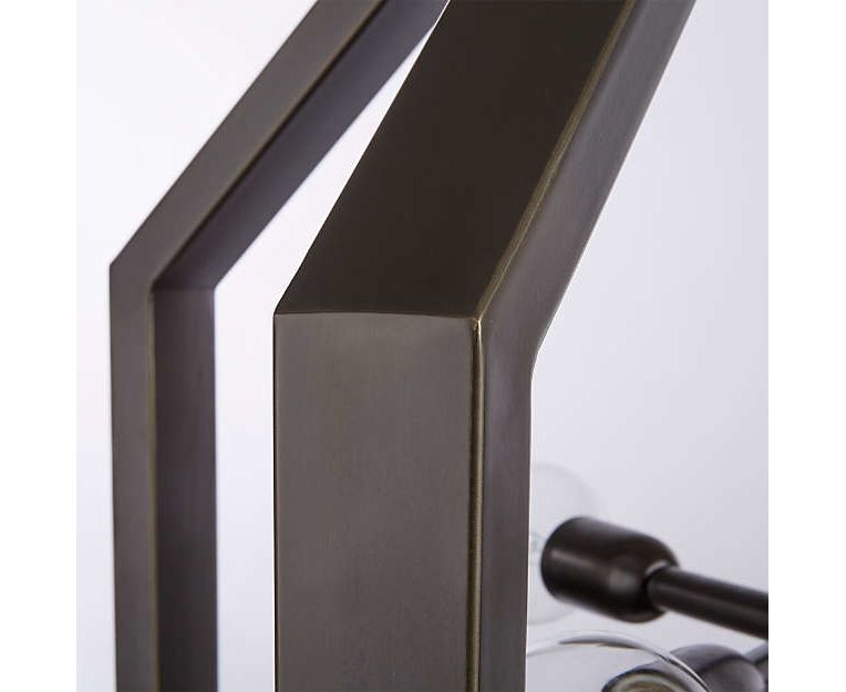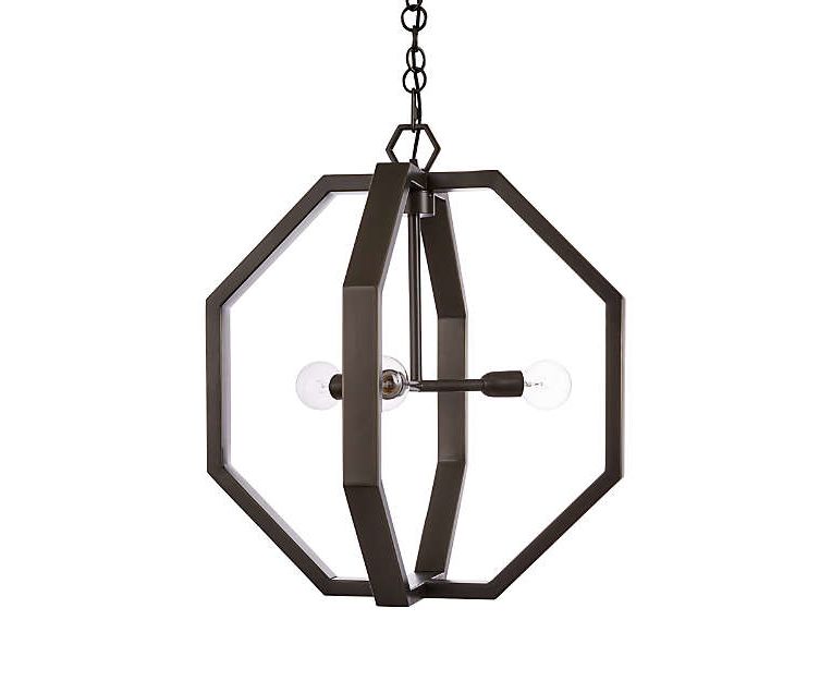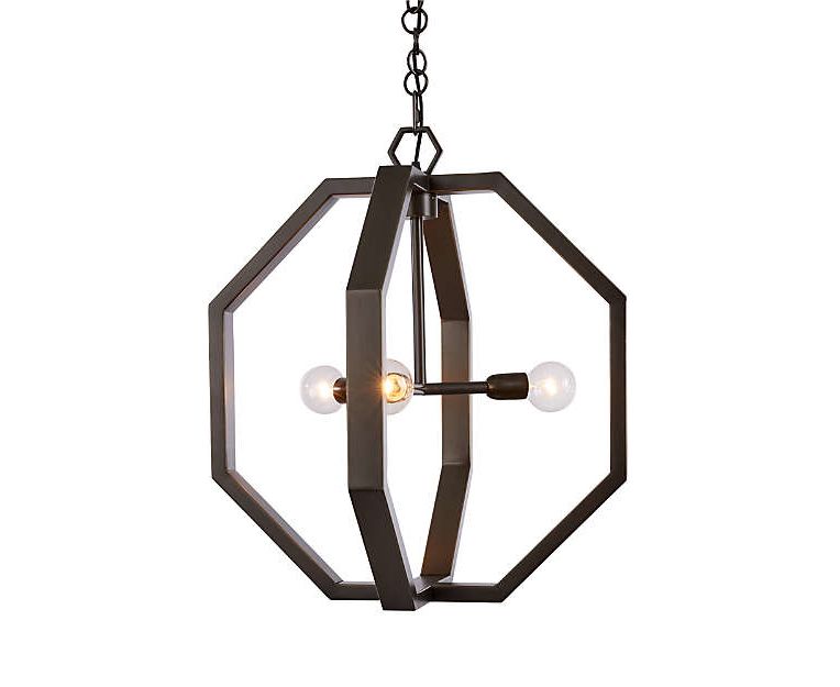 Темная старинная латунь формирует геометрический открытый подвесной светильник, привнося открытые лампочки в элемент дизайна. Два восьмиугольника пересекаются, образуя каркас для трех огней, увенчанных миниатюрным шестиугольником и подвешенных на темной старинной медной цепочке и черном шнуре питания. Для законченного образа осветите латунную люстру тремя прозрачными или тонированными винтажными лампочками.