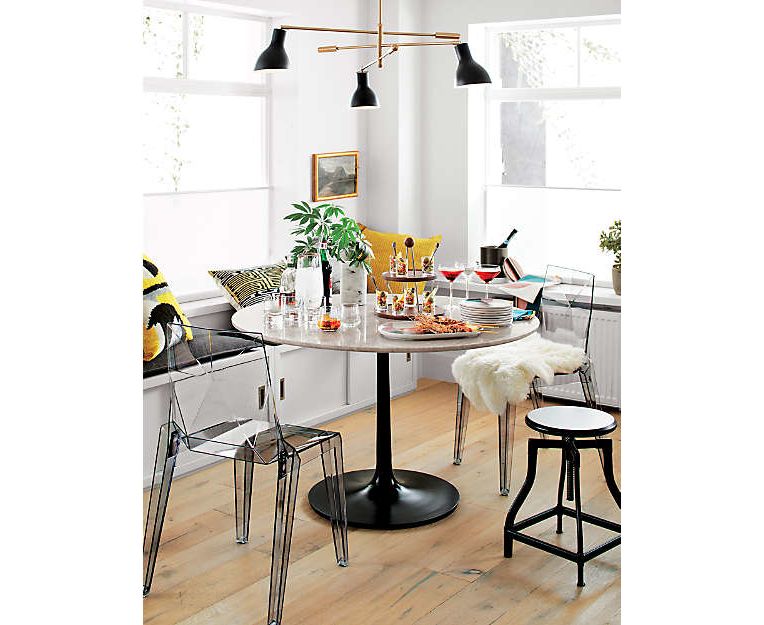 Трехрычажная люстра Crate and Barrel Kace с воздушным изяществом и тактильной привлекательностью мобильности предлагает форму, функциональность и стиль середины века. Чтобы создать идеальную, постоянно меняющуюся конфигурацию освещения в соответствии с вашими потребностями, три тонких матовых латунных рычага поворачиваются горизонтально, каждый из которых украшен абажуром, который поворачивается вертикально. Матовый черный цвет завершает внешнюю поверхность оттенков, а глянцевый белый интерьер ярко отражает свет.