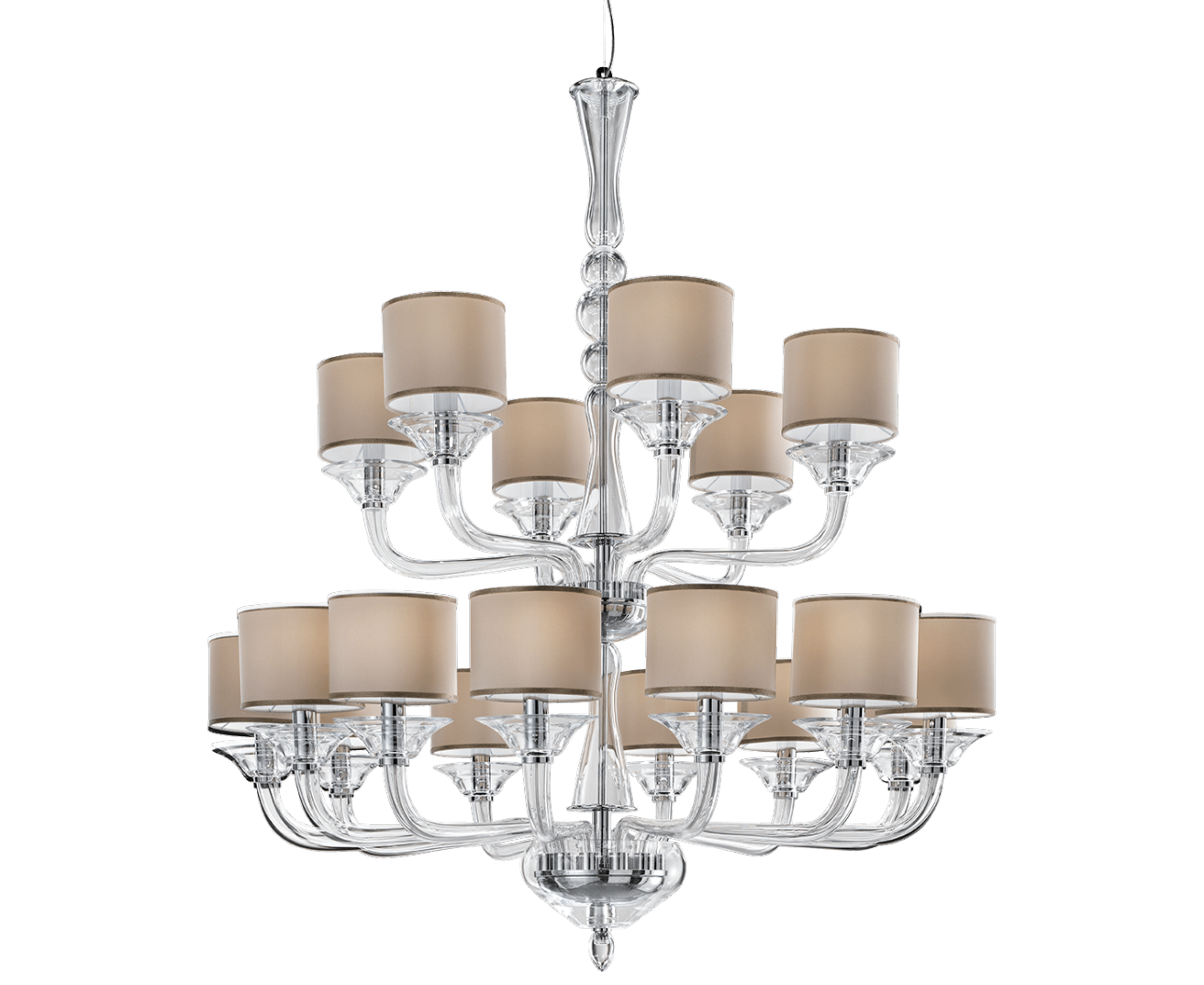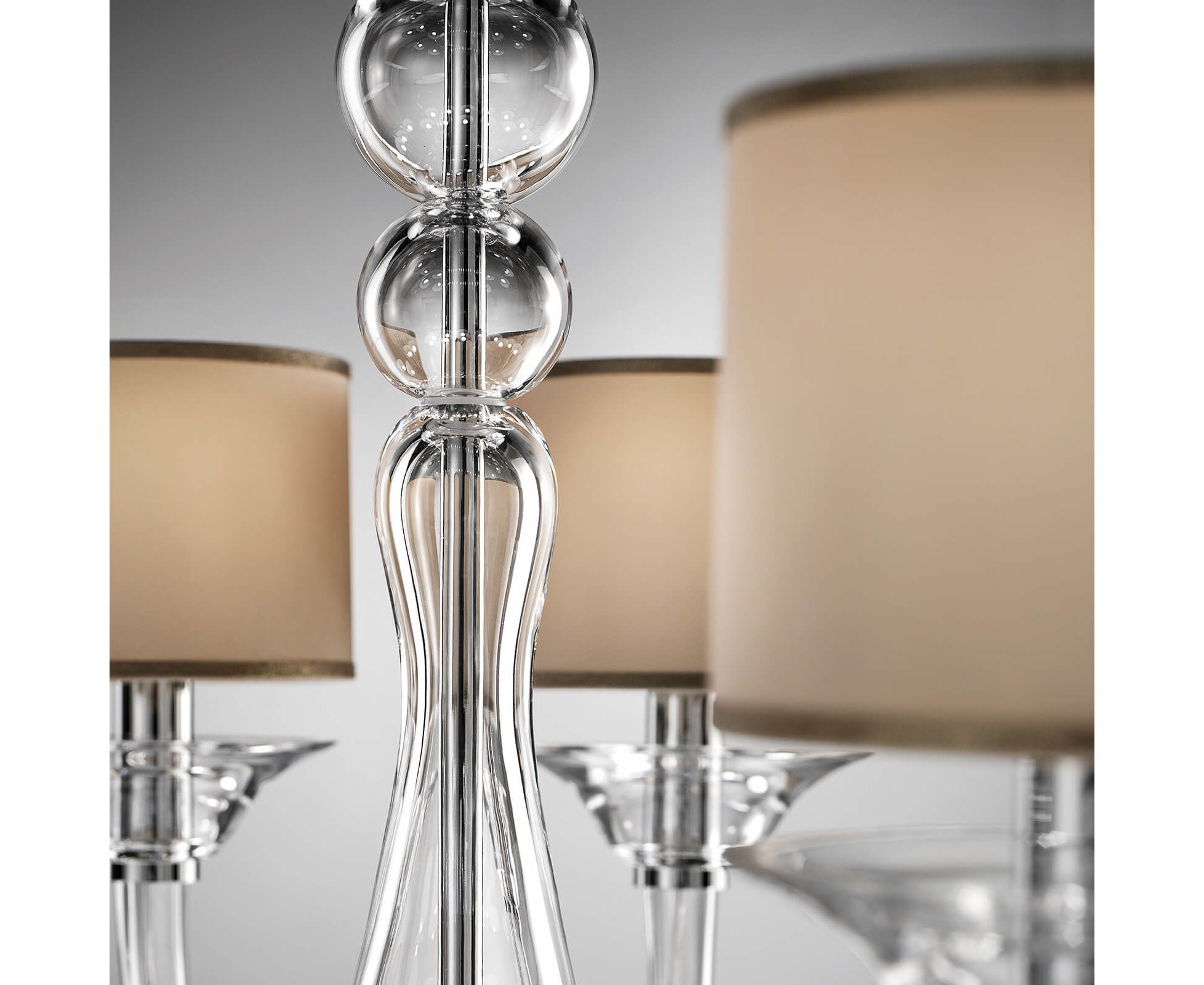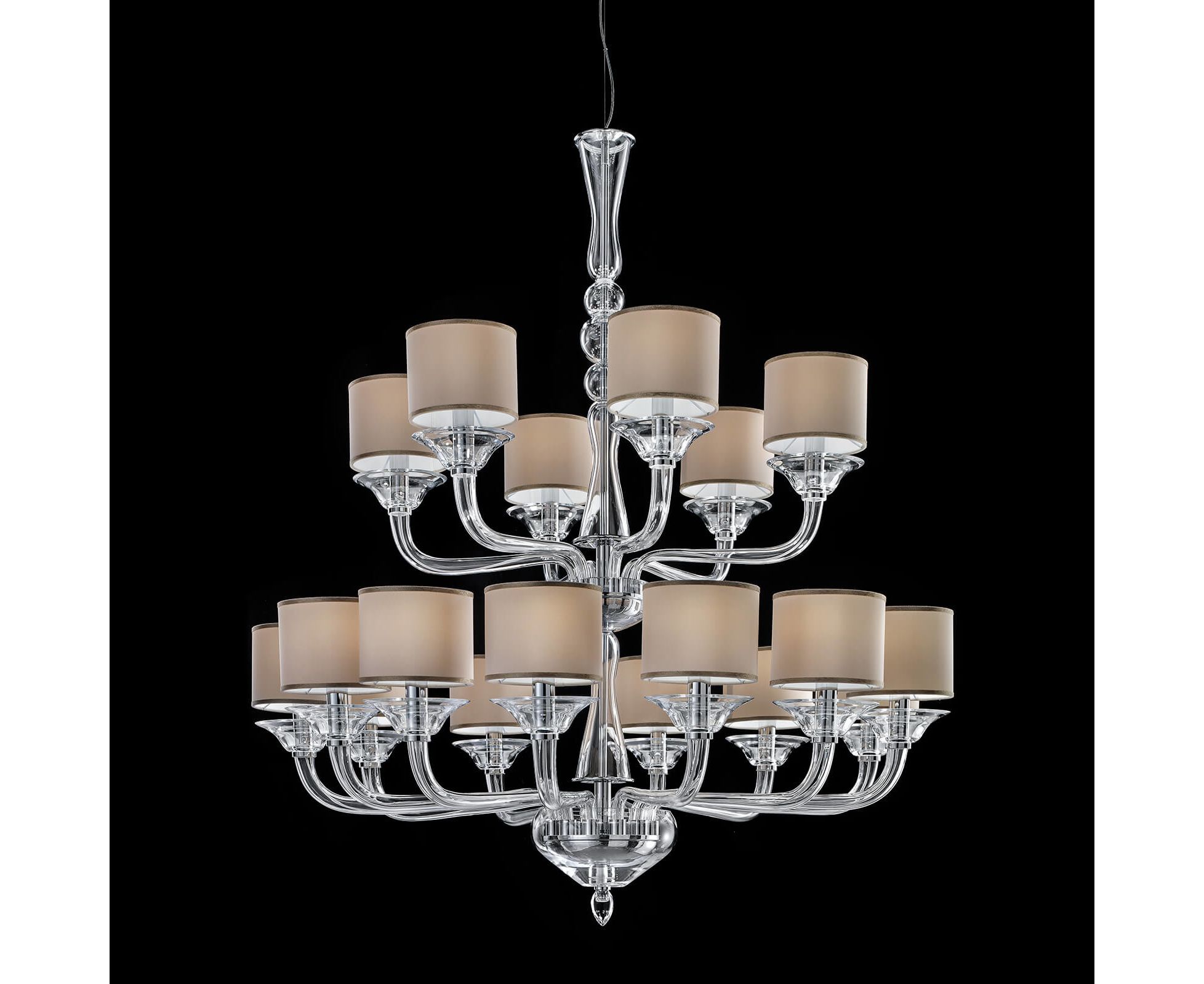 Люстра из хрусталя, с металлическим хромированным покрытием, бежевые тканевые абажуры. Доступны в разных размерах. Коллекция Opera Classic.