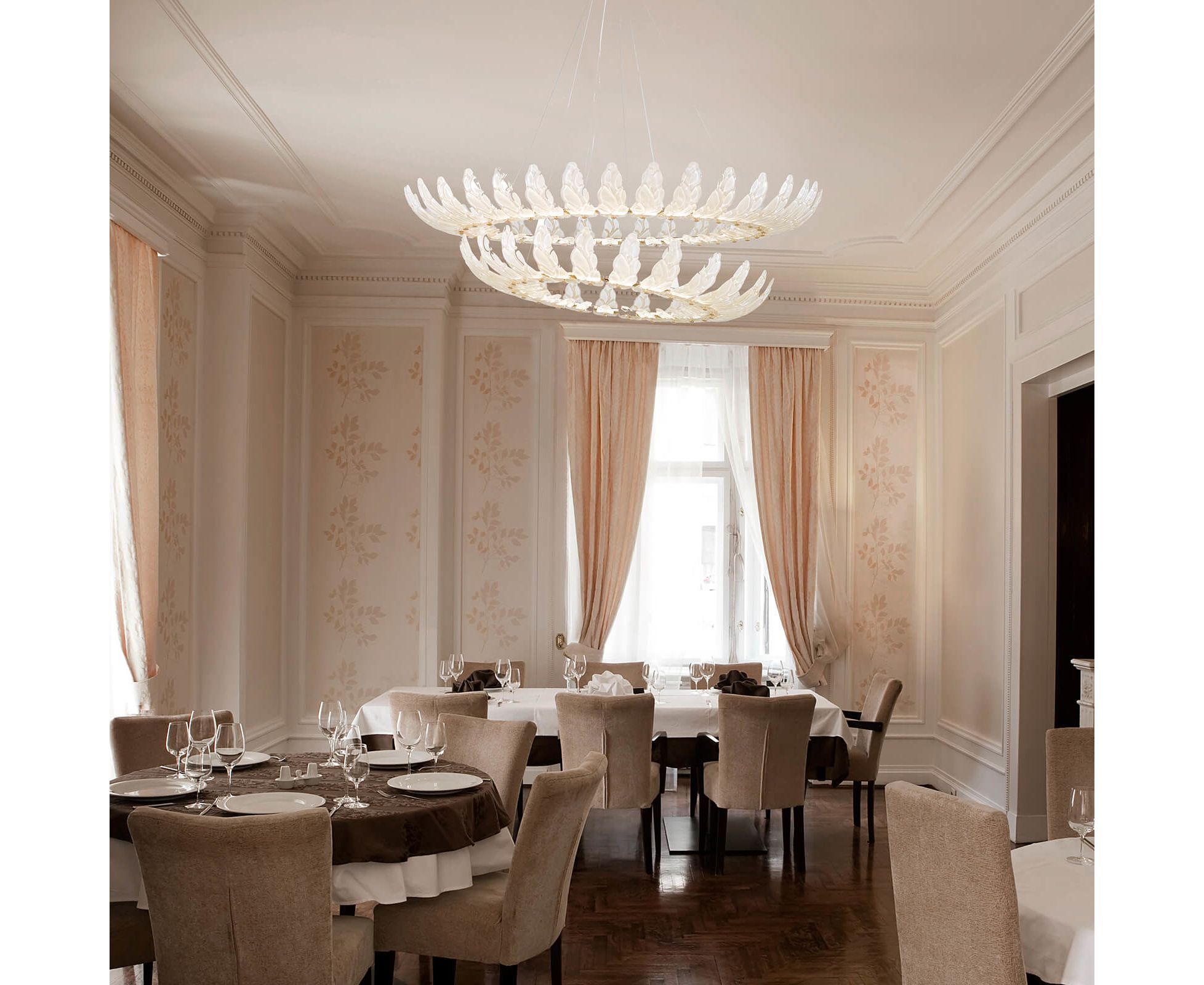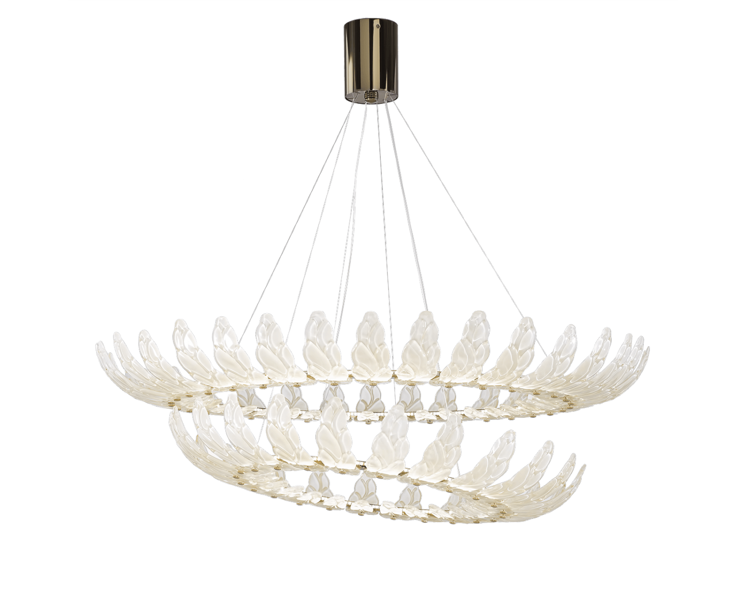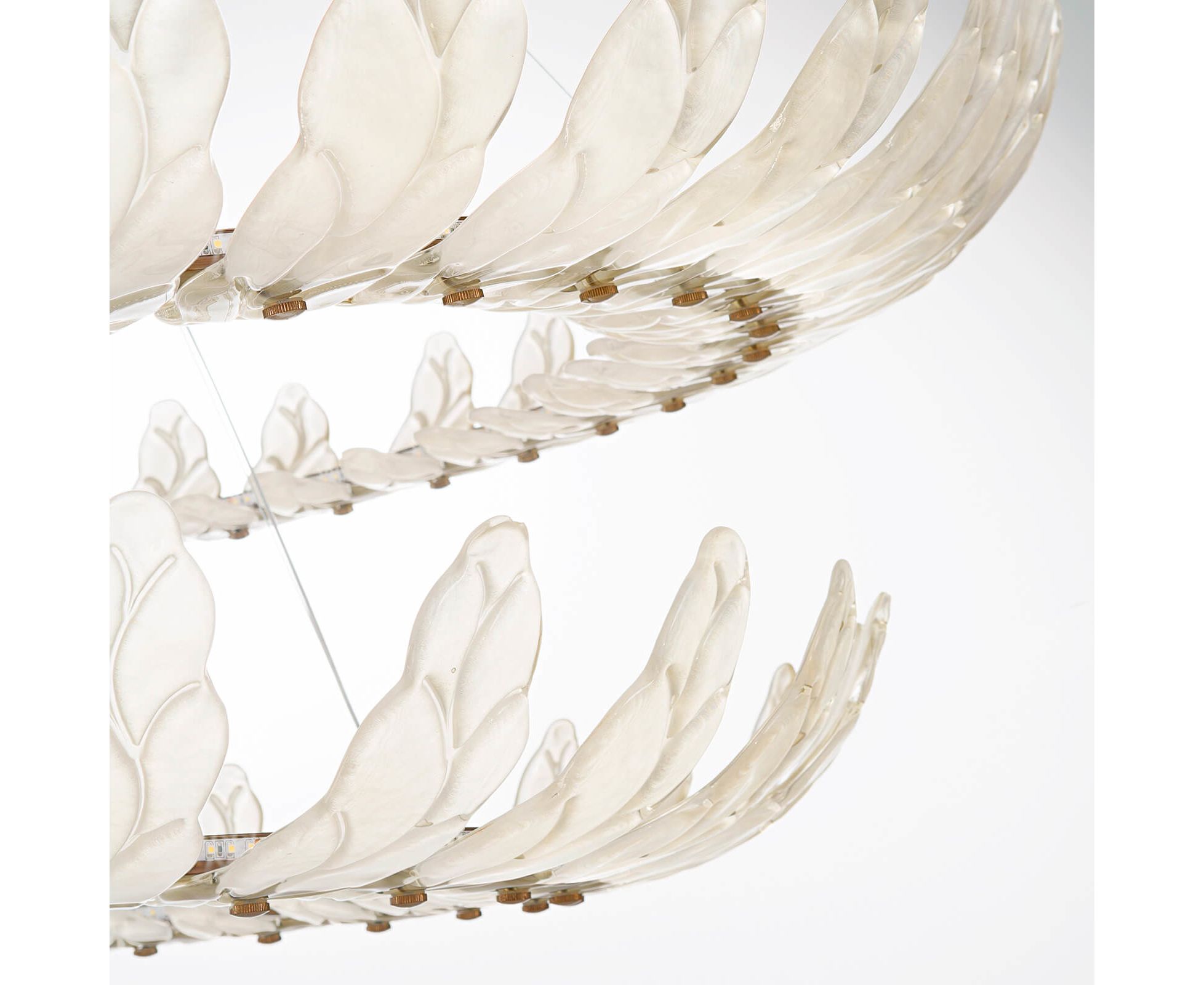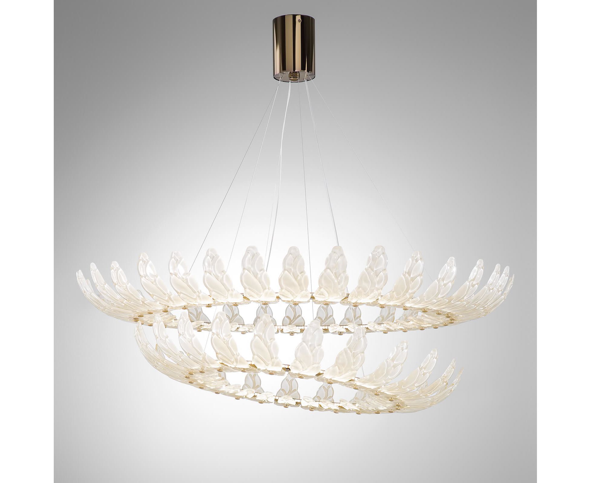 Люстра из золотисто-никелевого сплава с листами из сатинированного тикового стекла. Доступны в разных размерах и цветах. Современная коллекция Incanto.