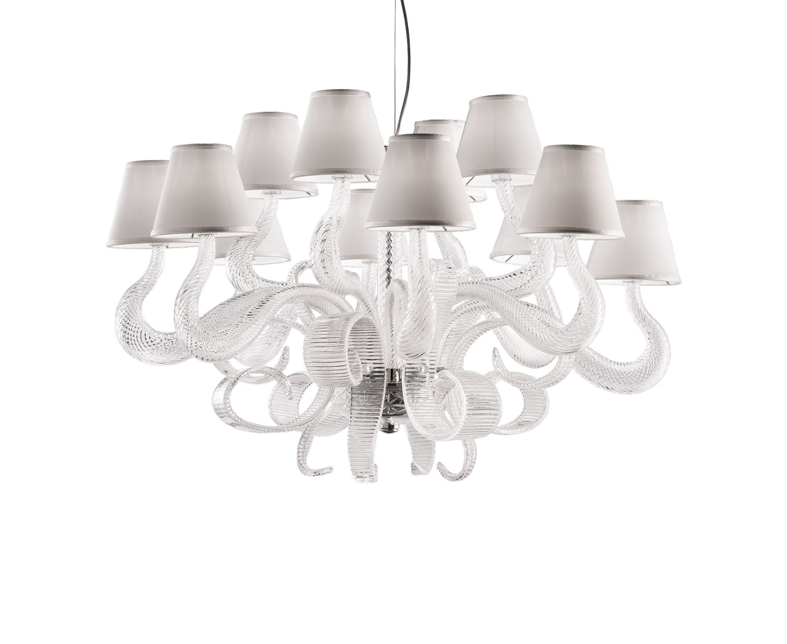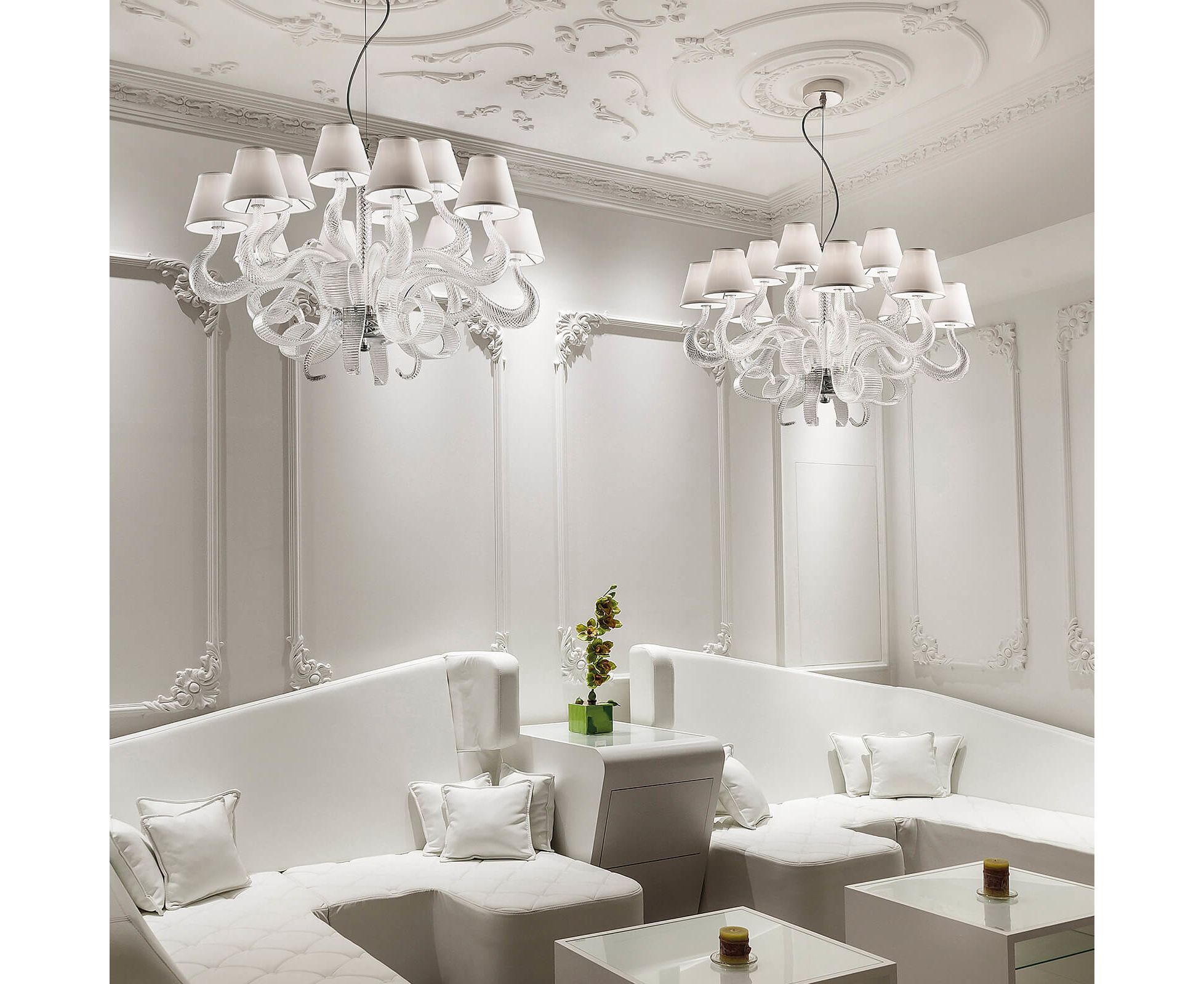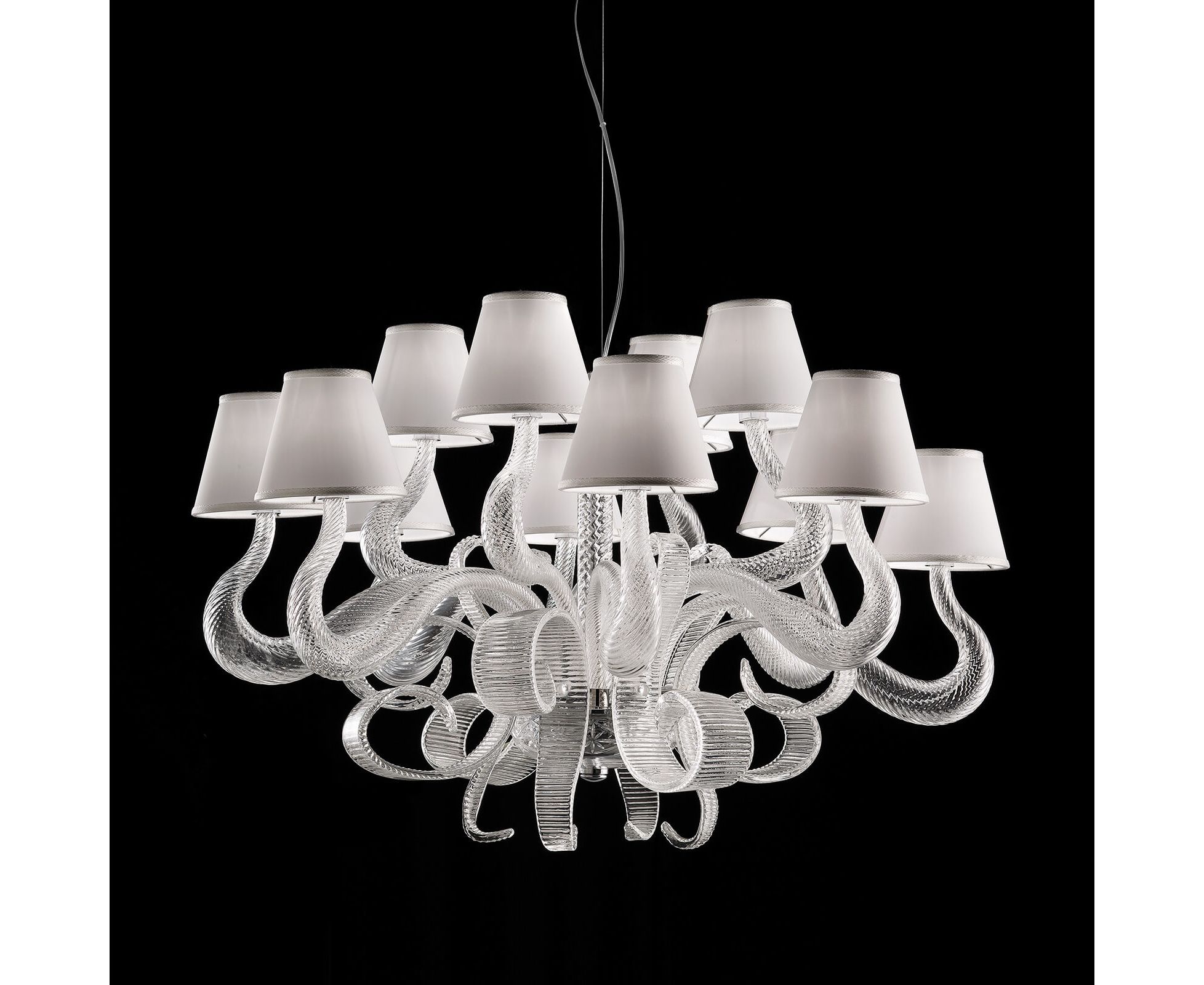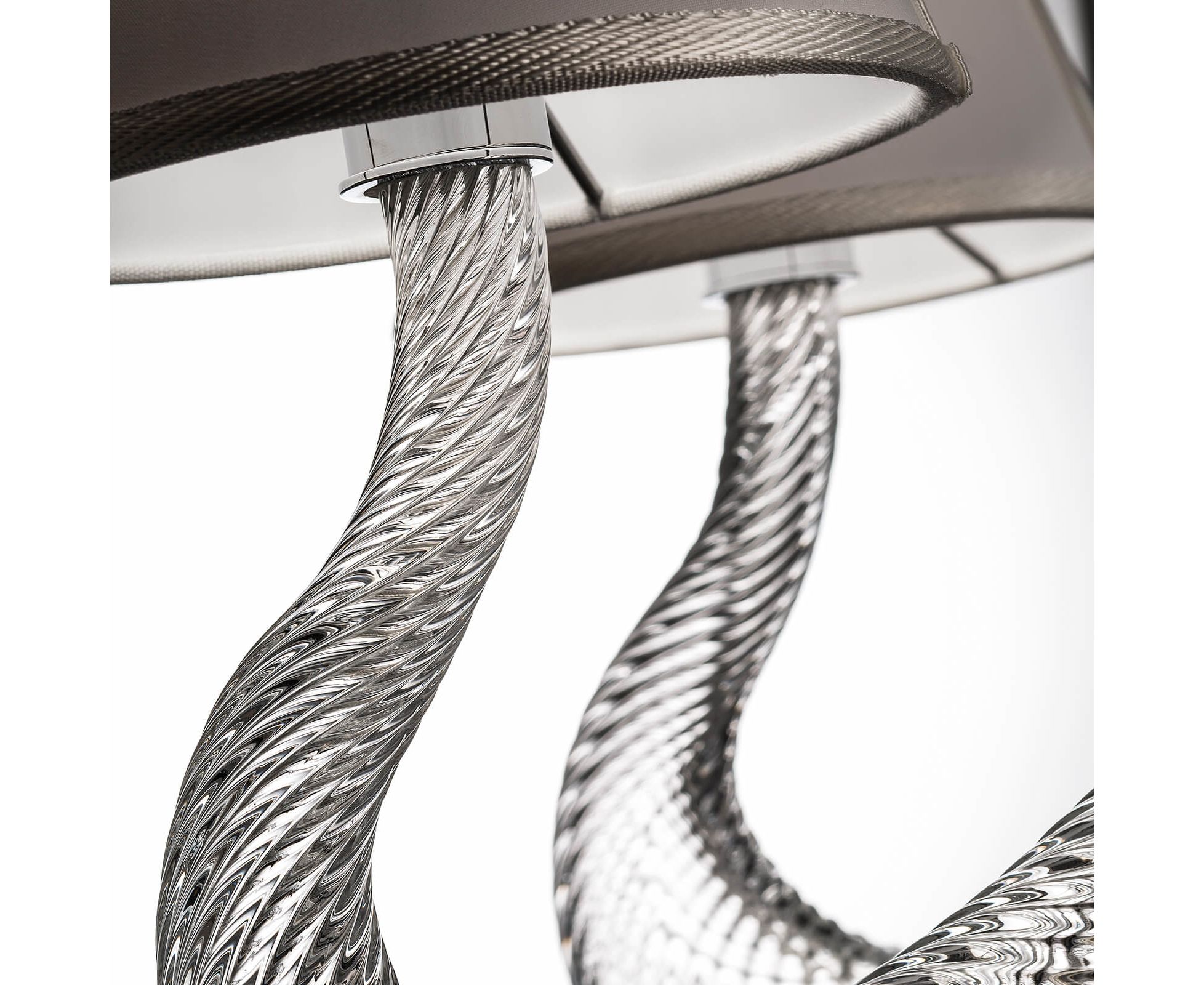 Люстра из стекла с витыми стеклянными кронштейнами, металлическая структура с хромированной отделкой и абажурами слоновой кости. Доступны в разных размерах. Коллекция Opera Classic.