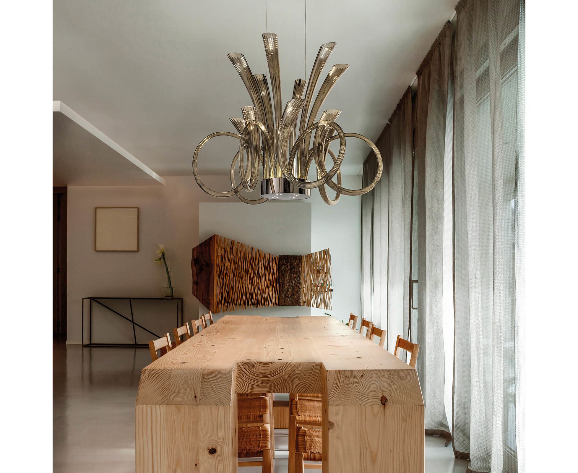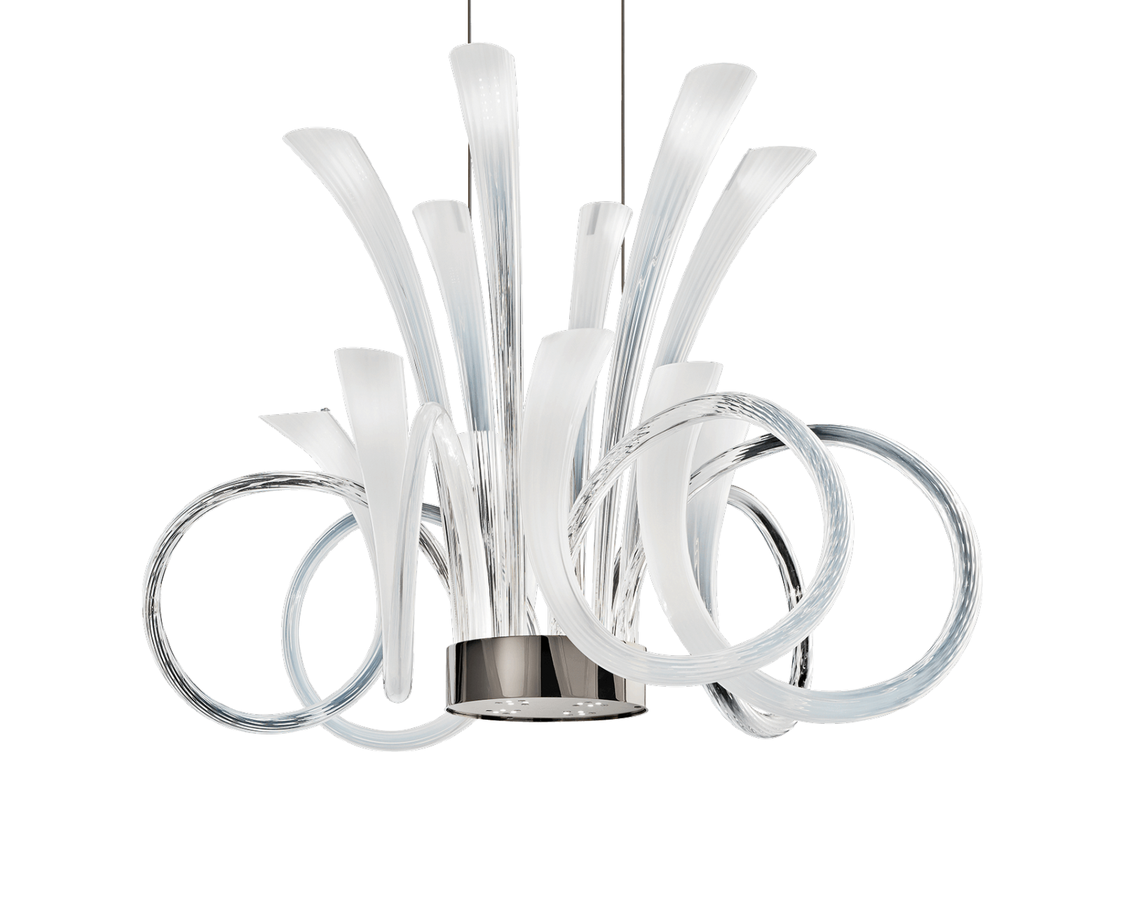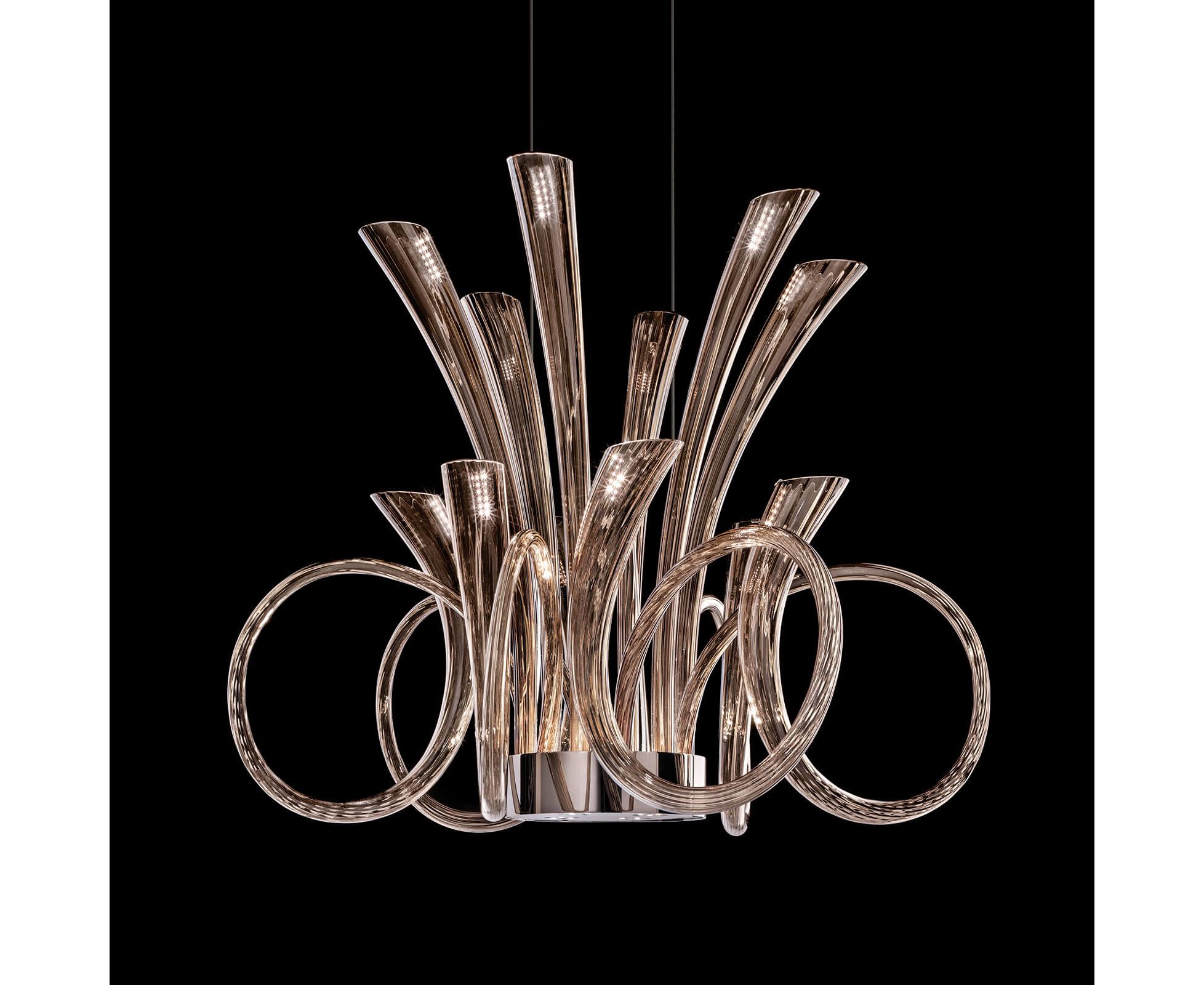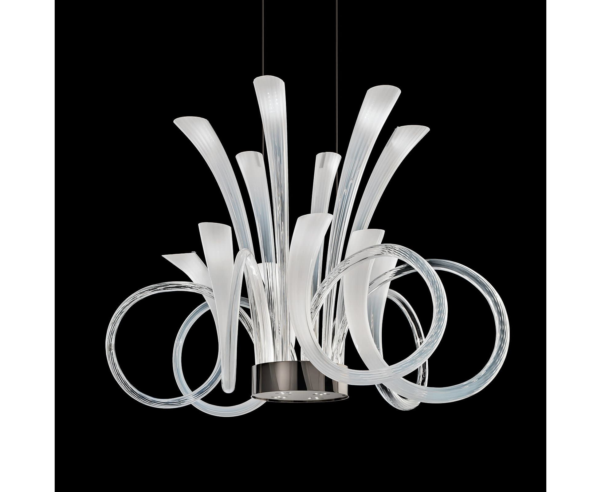 Люстра в цвете серое железо или матовой светло-золотой металлической отделкой и выдувным стеклом в тонированном белом или голубоватом цветах.