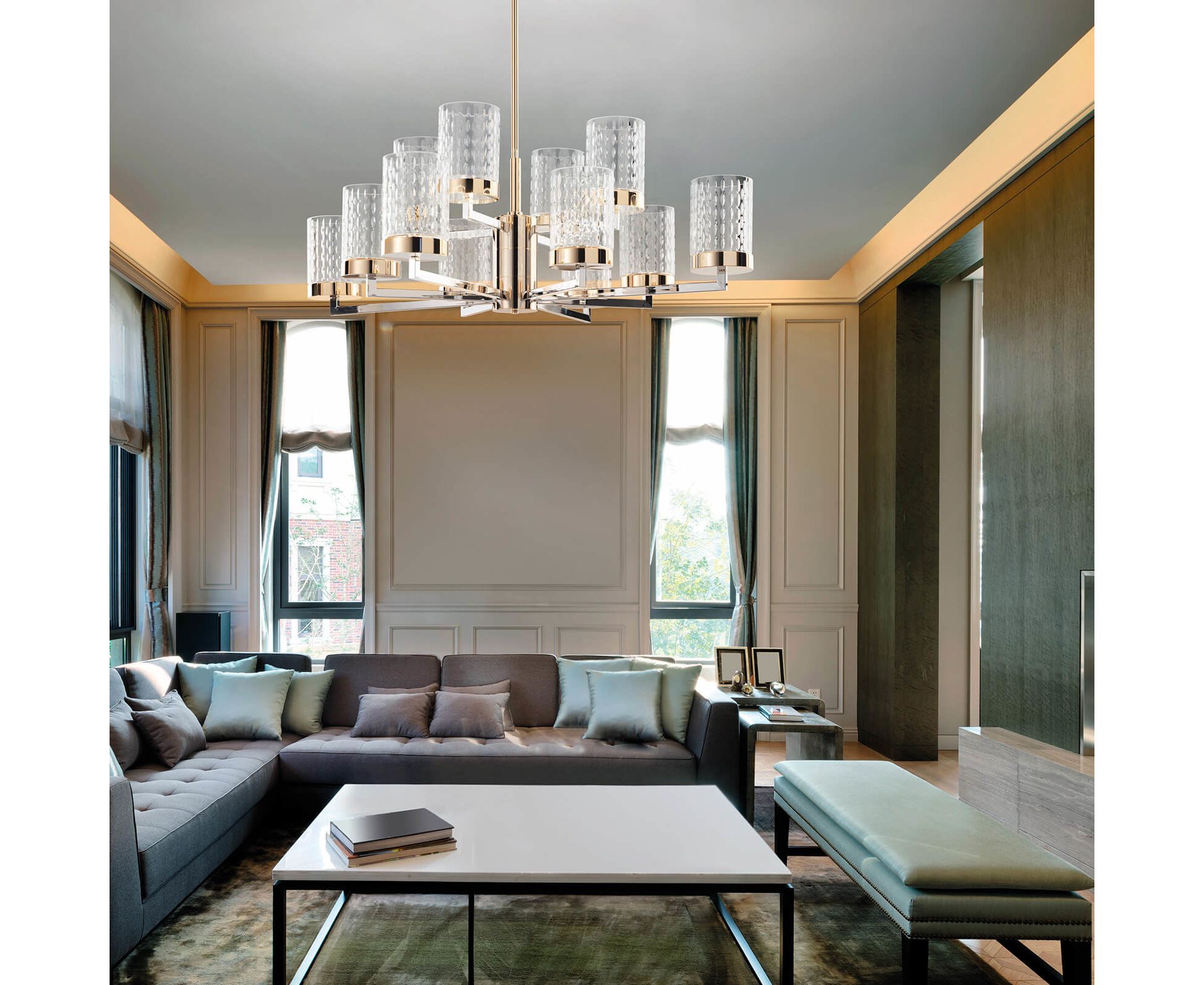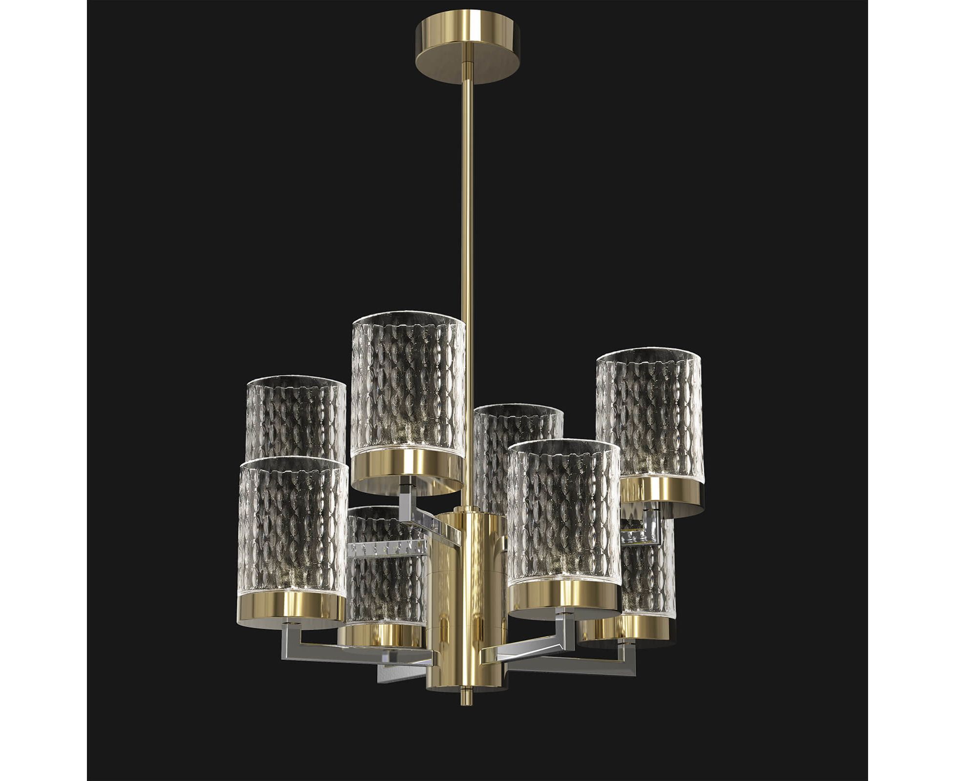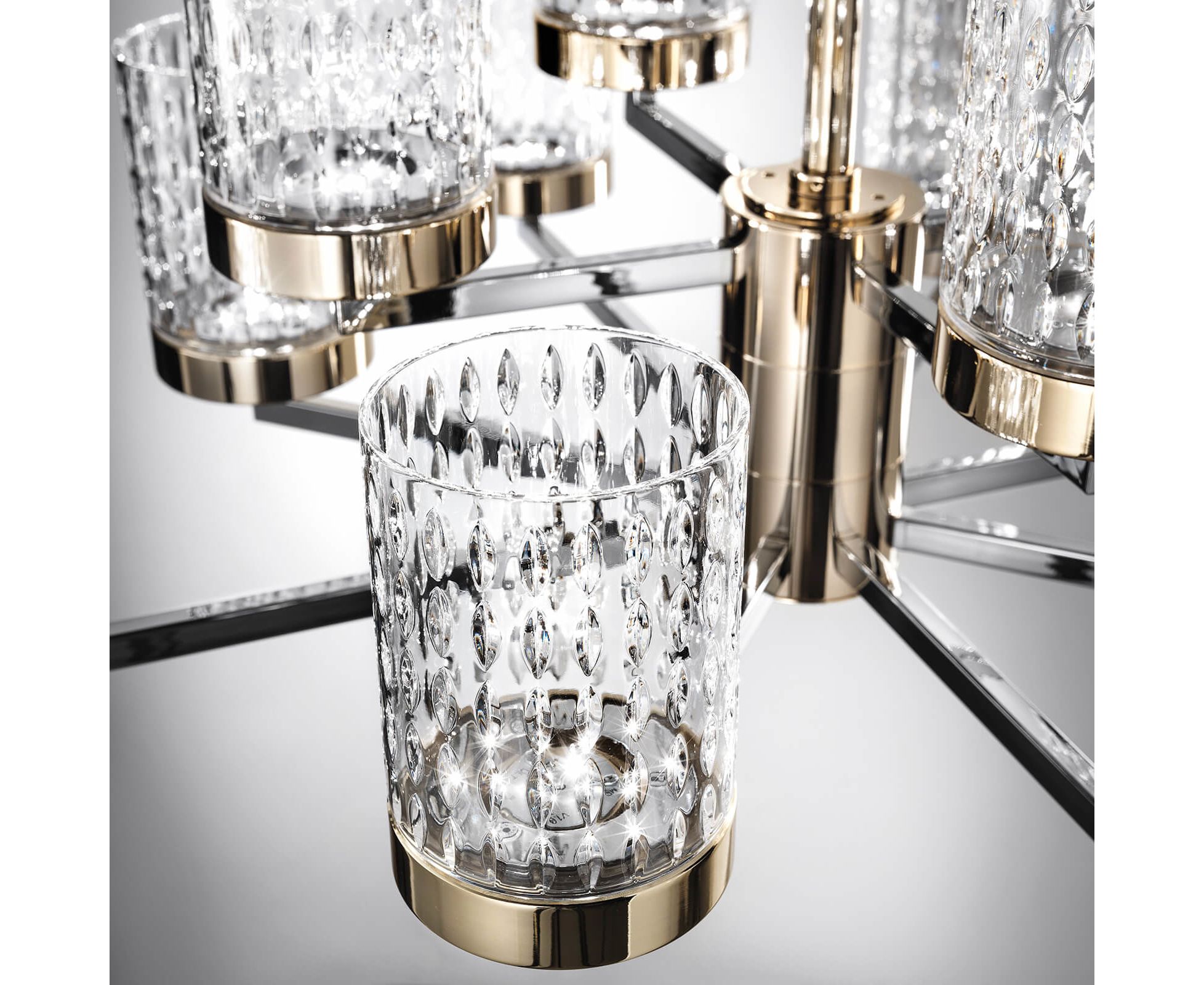Люстра с хромированной и отделкой из светлого золота металлической структуры и диффузорами из резного хрусталя. Доступны в разных размерах.