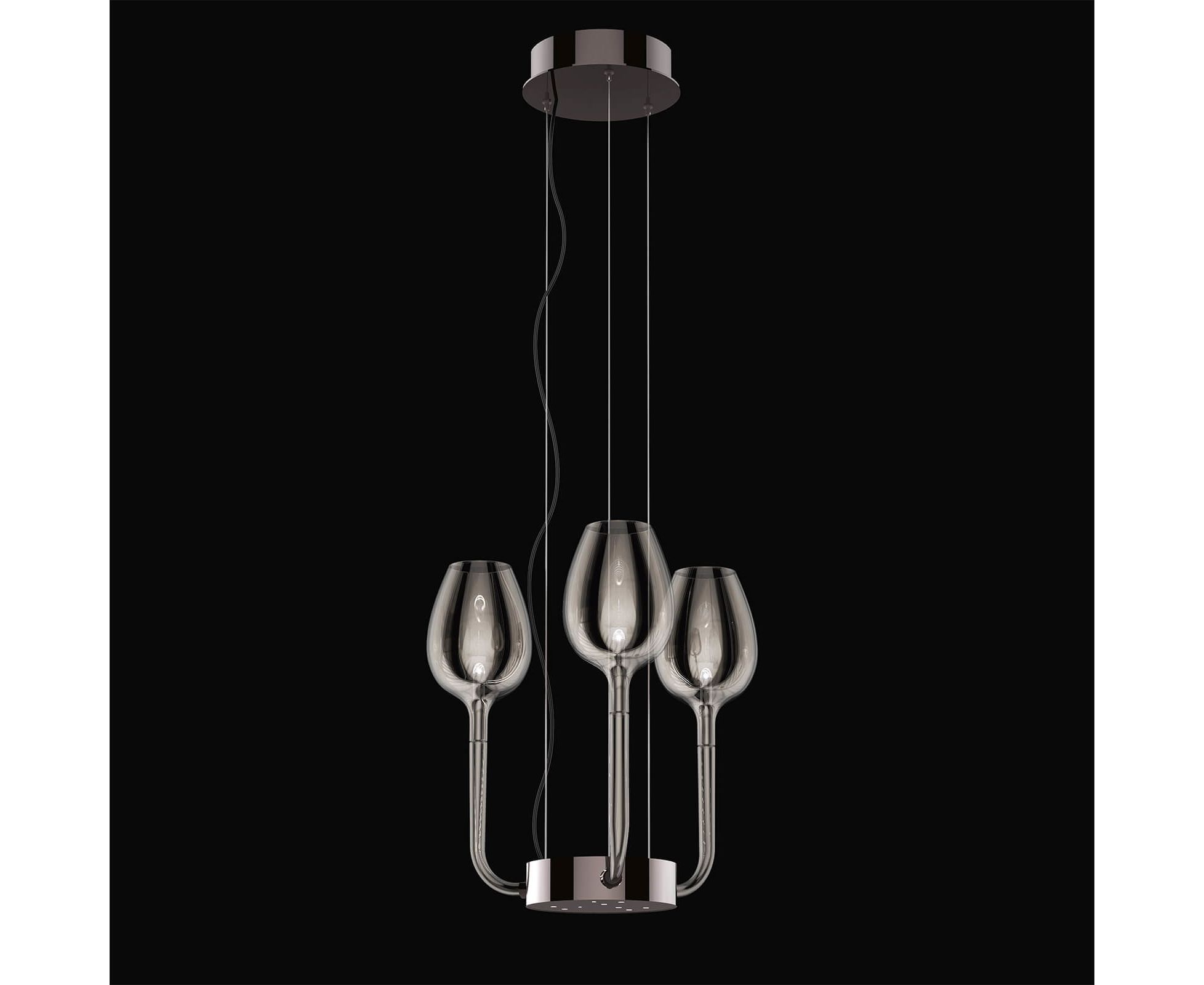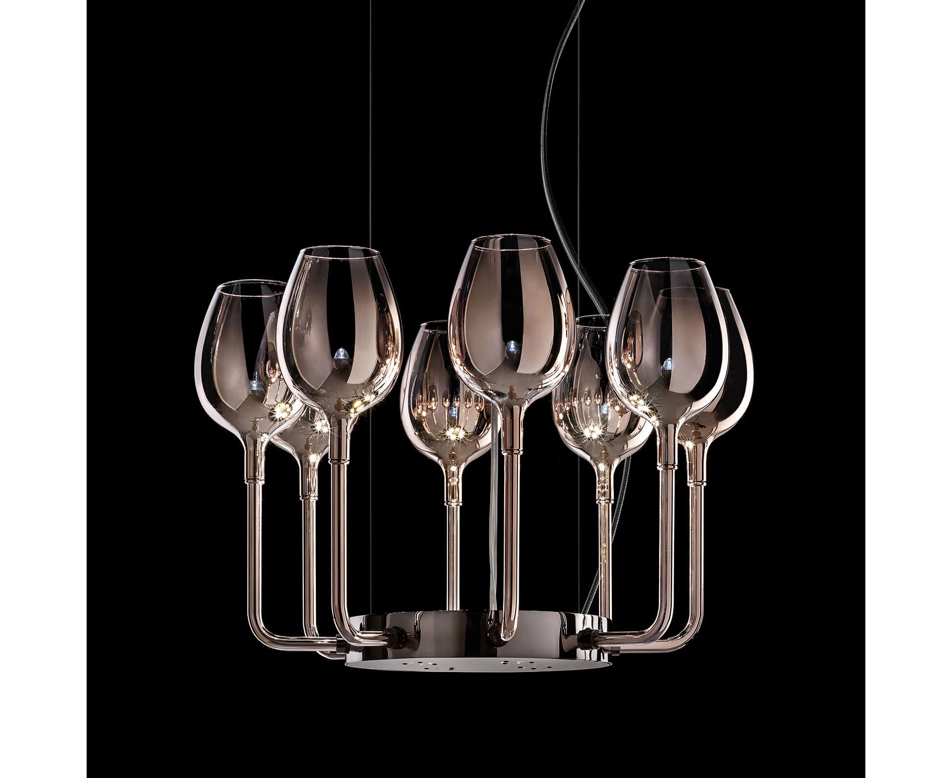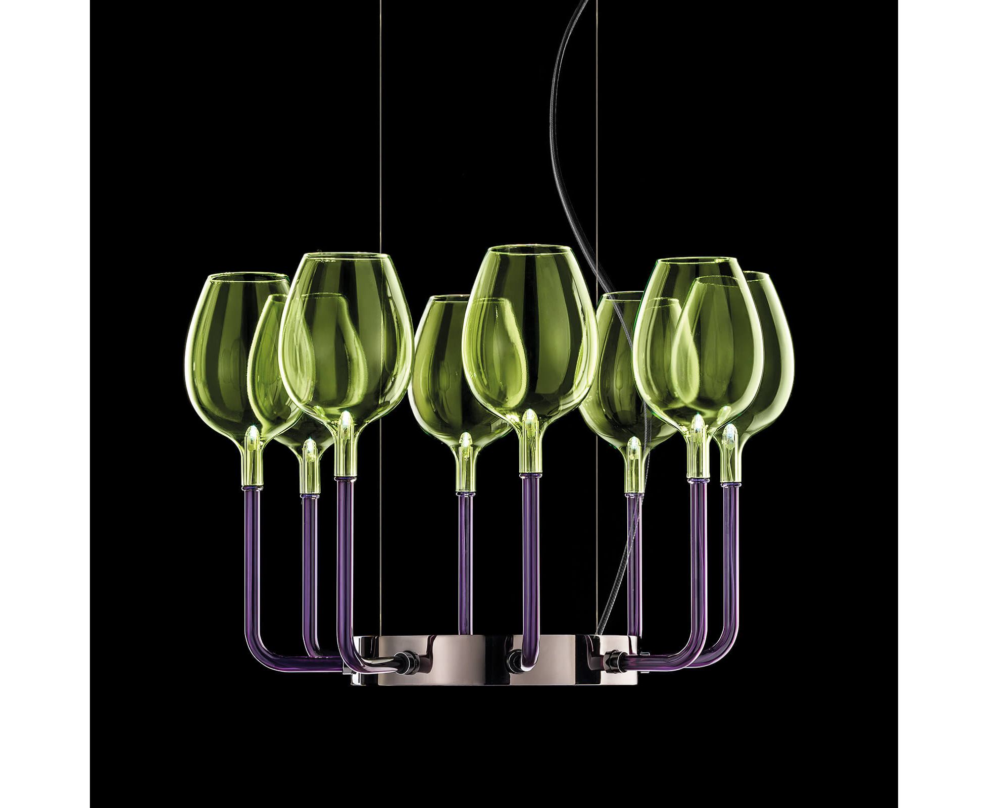 Люстра с рассеивателями из выдувного стекла и металлической структурой с хромированной отделкой. Доступен в разных цветах.