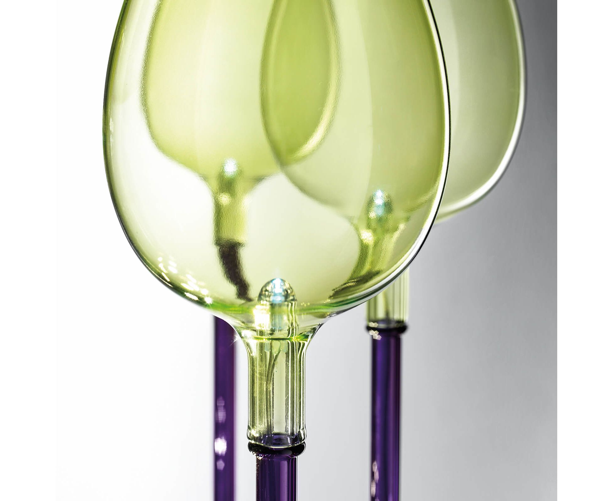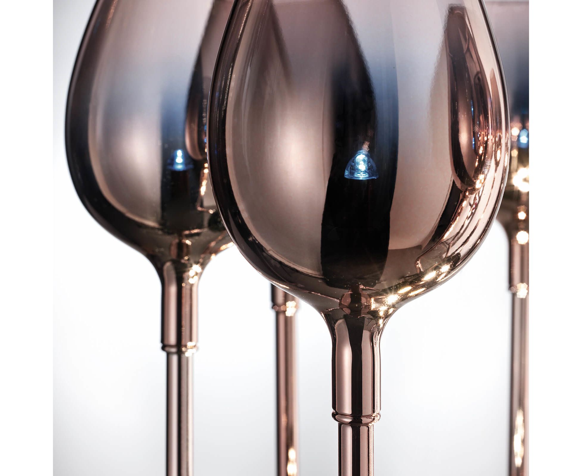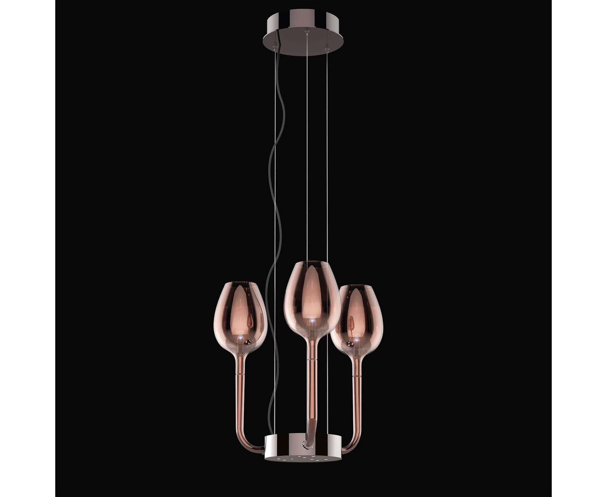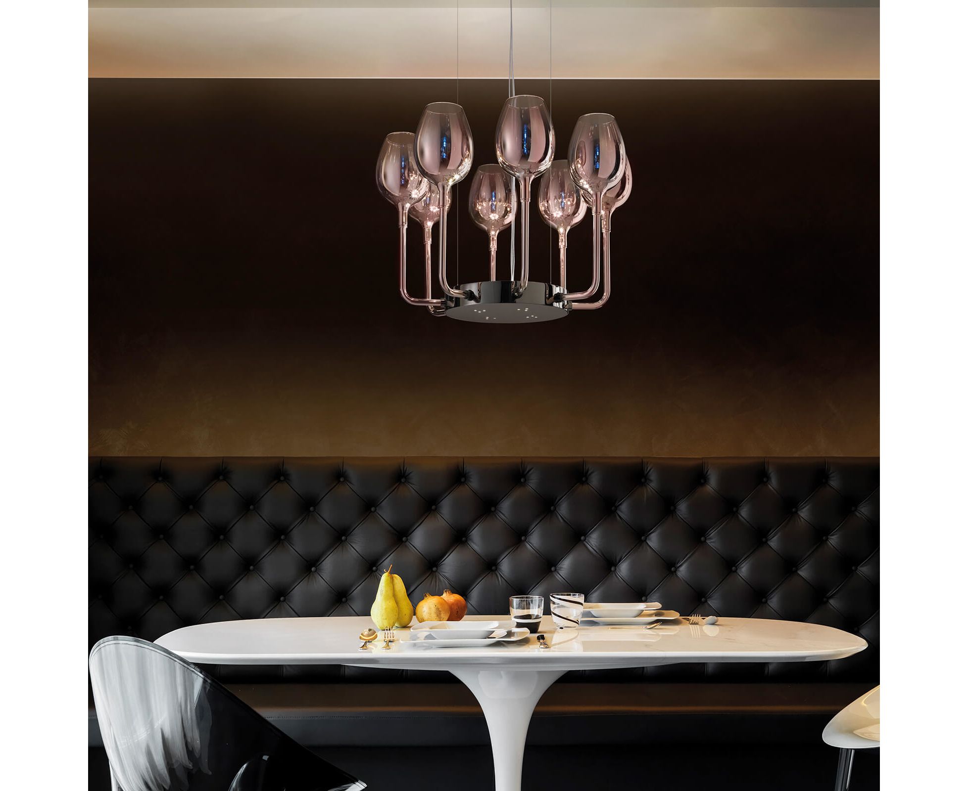 Люстра с рассеивателями из выдувного стекла и металлической структурой с хромированной отделкой. Доступен в разных цветах.