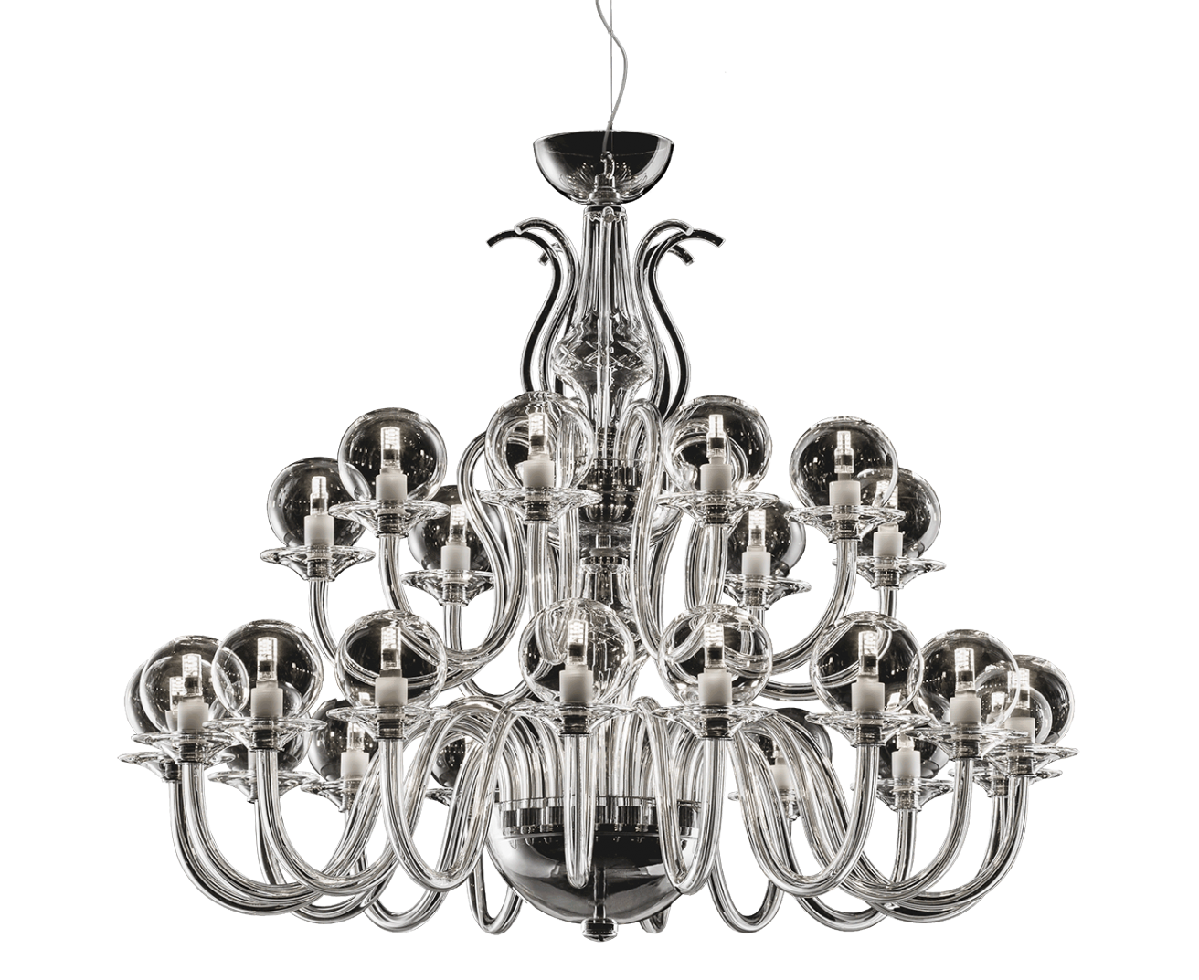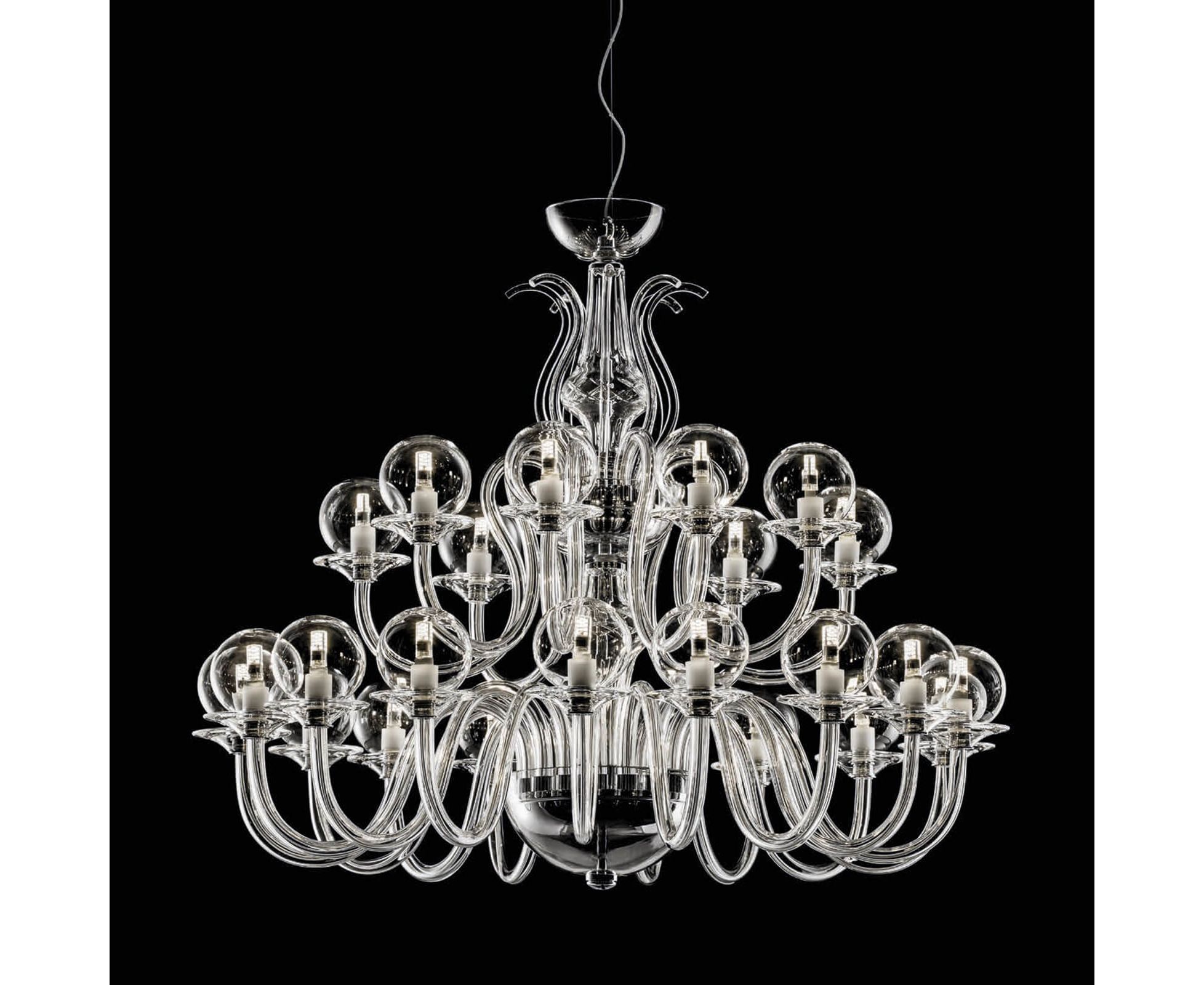 Люстра из прозрачного хрусталя, металл с хромированной отделкой и диффузоры из выдувного стекла. Доступны в разных цветах и размерах. Классический каталог Opera.