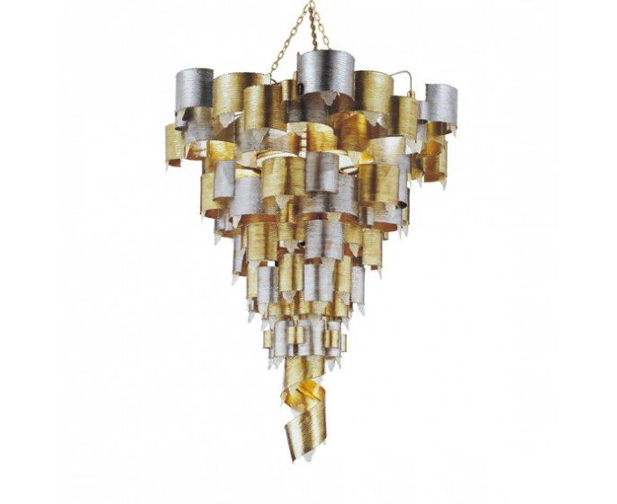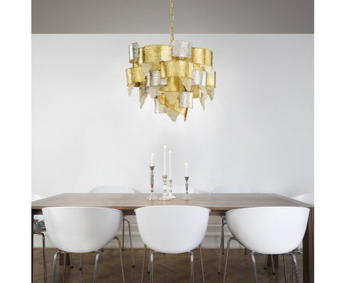 Коллекция светильников CITY выполнена с металлическими листами разного размера, установленными для создания круглой или квадратной формы. Эти же листы обрабатываются вручную и украшены сусальным золотом и серебром. Чтобы создать движение и различные игры света, рамка дополняется стеклянными вставками, которые также выдуваются вручную.