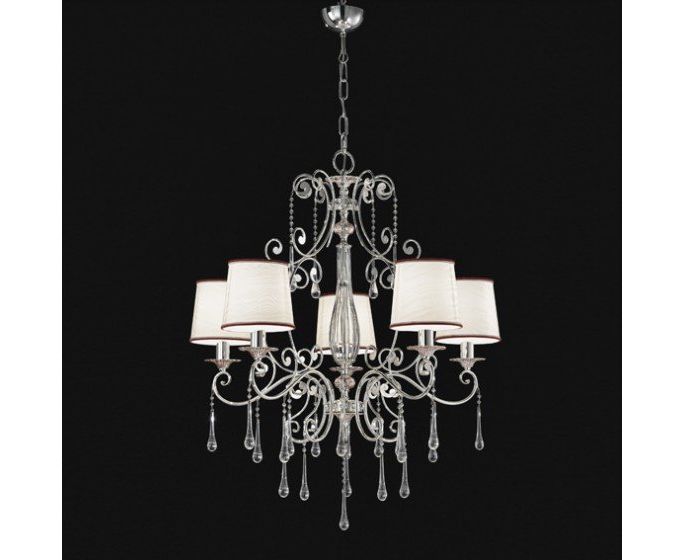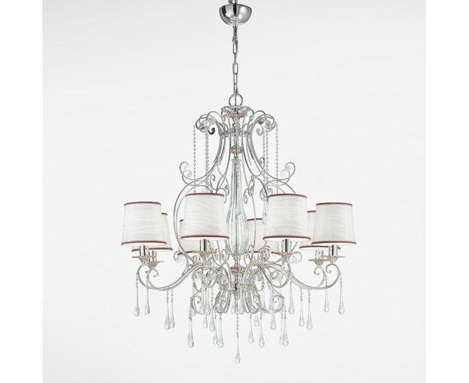 Коллекция светильников, изготовленных в металле с серебристым покрытием и абажурами белого цвета с красным / серебряным краем. Стеклянные капли и детали.