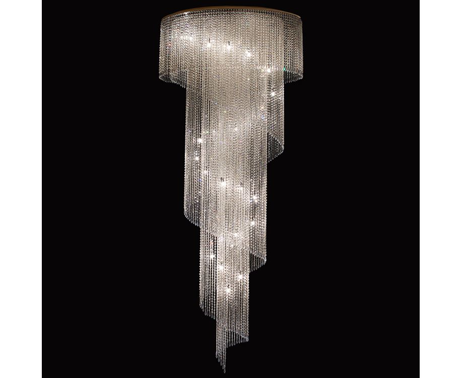 Спираль из хрустальных гирлянд спускается с потолочной конструкции, напоминает драпировку из ткани. Spyral может быть реализован в двух вариантах: потолочный светильник или подвесной светильник. Это осветительная работа с большим эффектом, которая дает лучшее в сверхлегких версиях; Это идеальное решение для украшения великих событий и для украшения больших общественных зданий.
