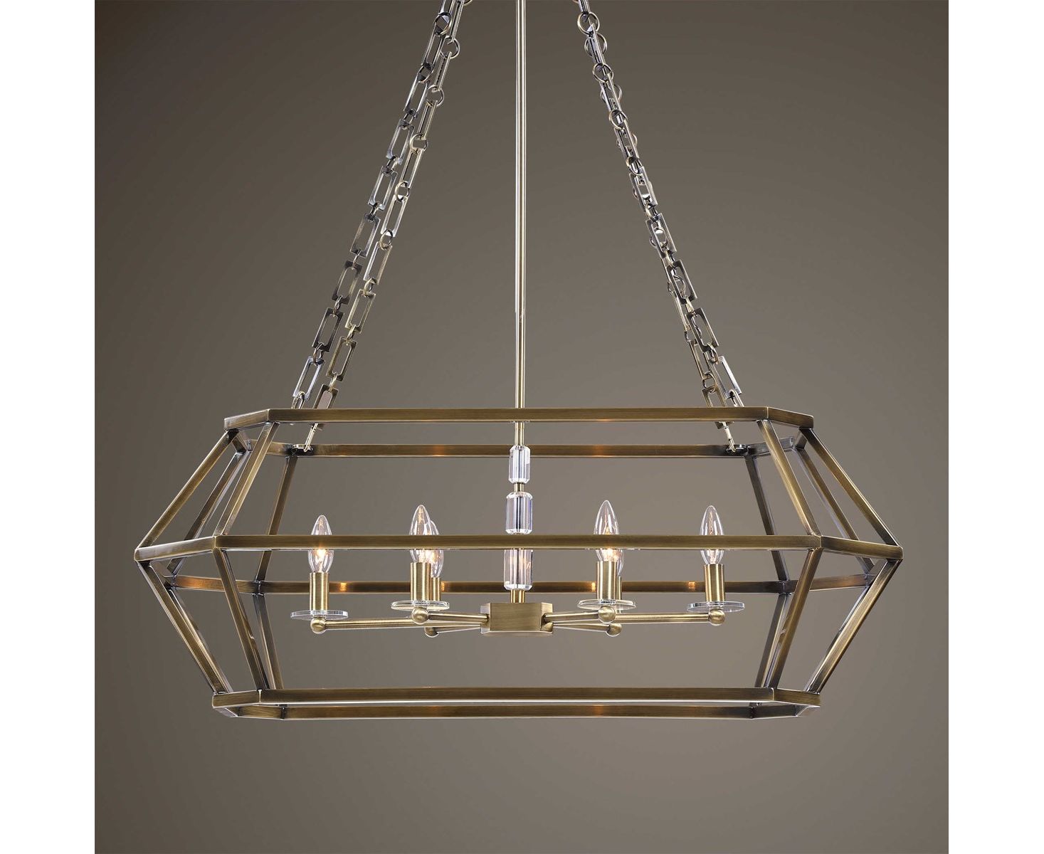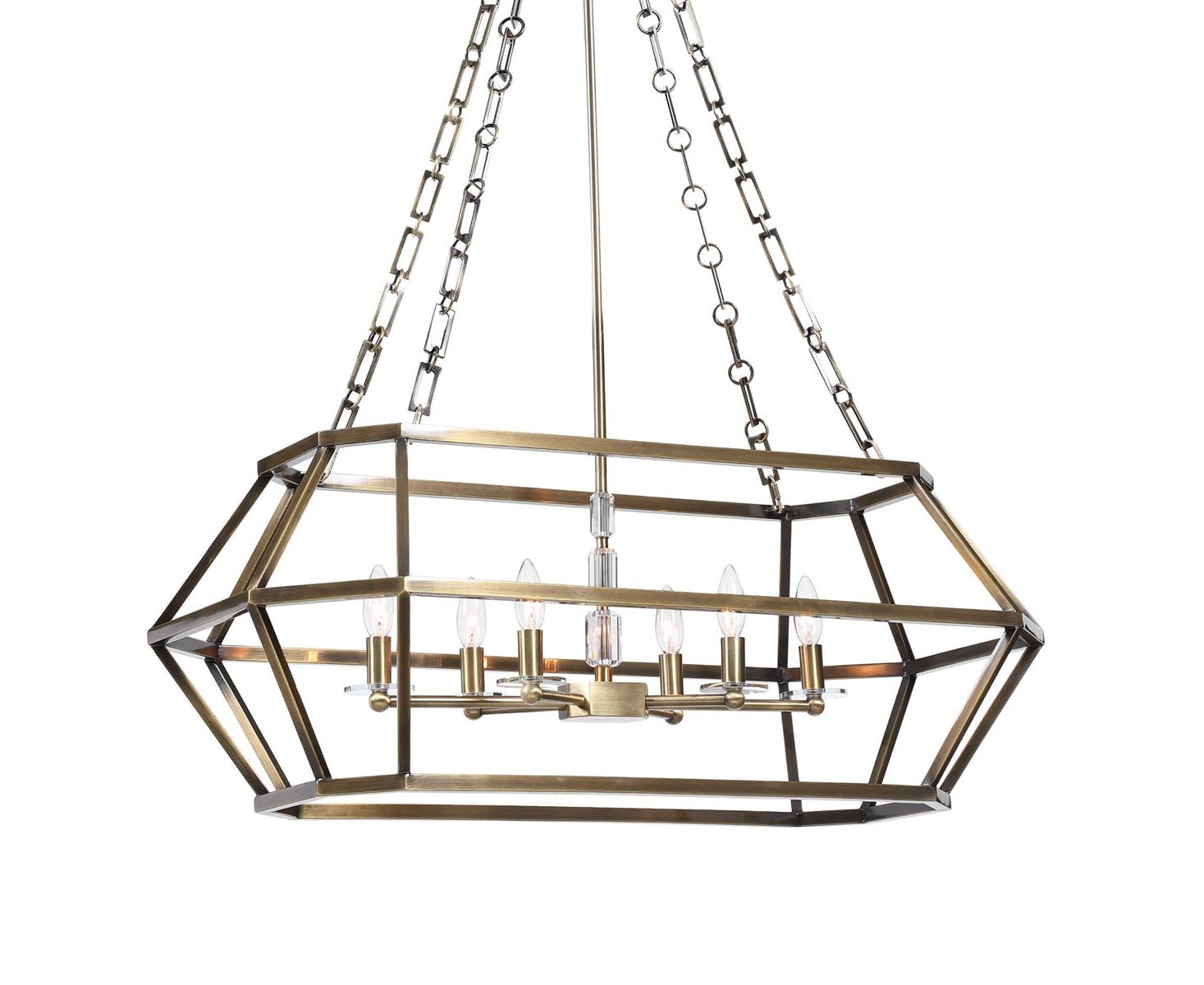 Уникальная удлиненная восьмиугольная форма этой люстры на 6 ламп становится чрезвычайно элегантным переходным дизайном с богатой окисленной состаренной латунной отделкой и хрустальными акцентами.