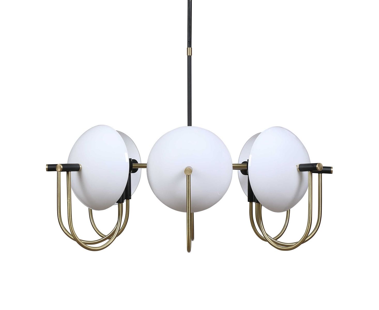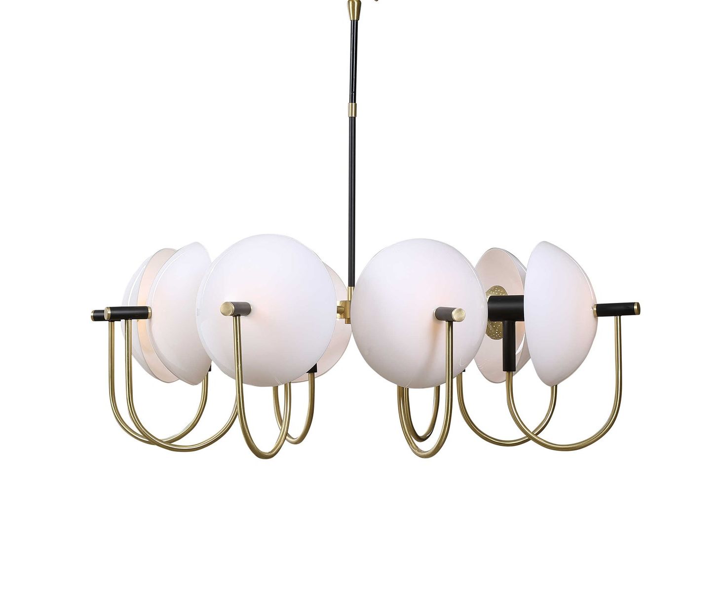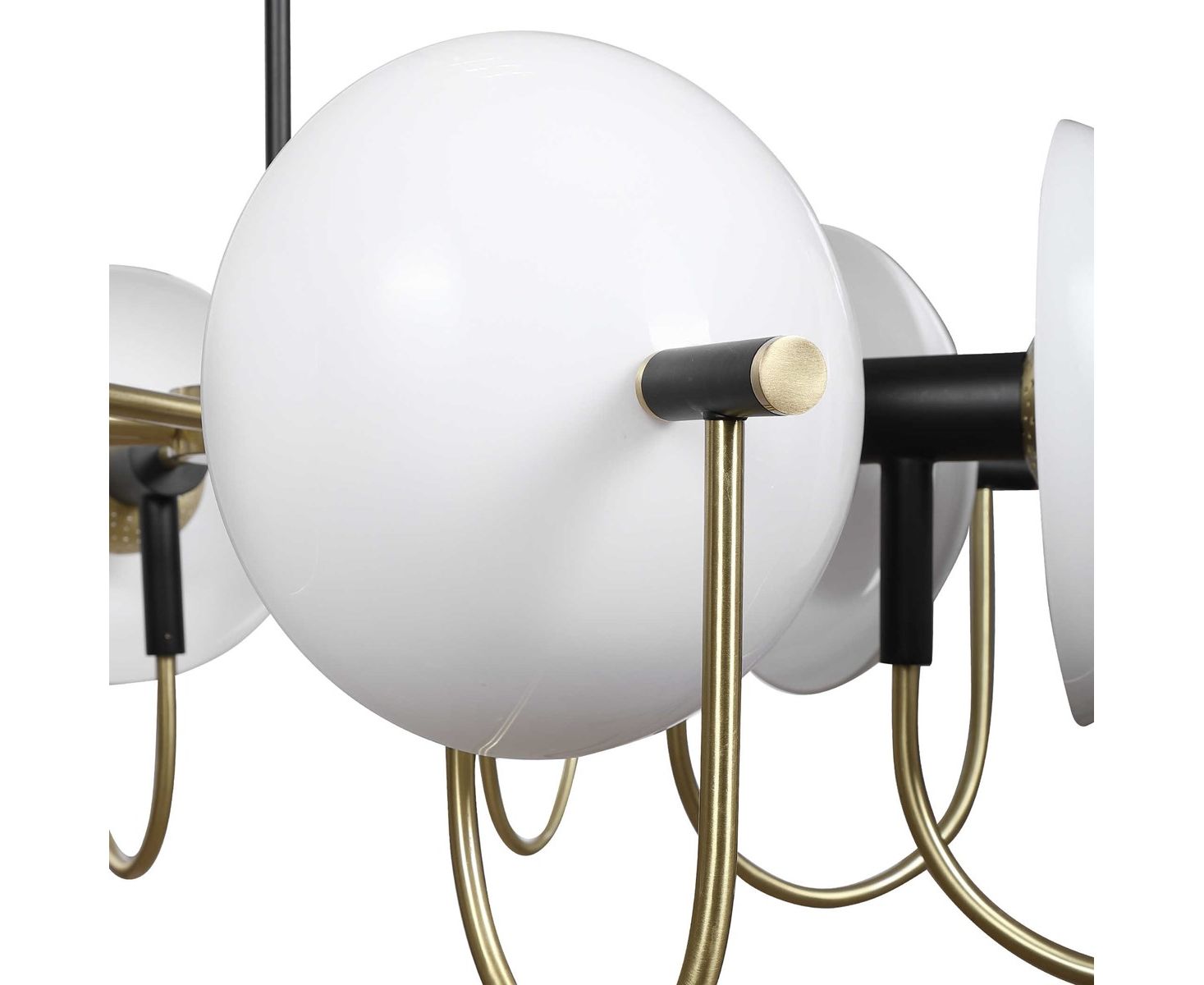 Люстра Ear Muff сочетает в себе чистый и изысканный дизайн с игривой прихотью. Восемь ламп плавающих рассеивателей белого опалового стекла подвешены на латунных стержнях с акцентами из черной эмали, которые обеспечивают мягкий рассеянный свет, создавая комфортную и приятную обстановку.