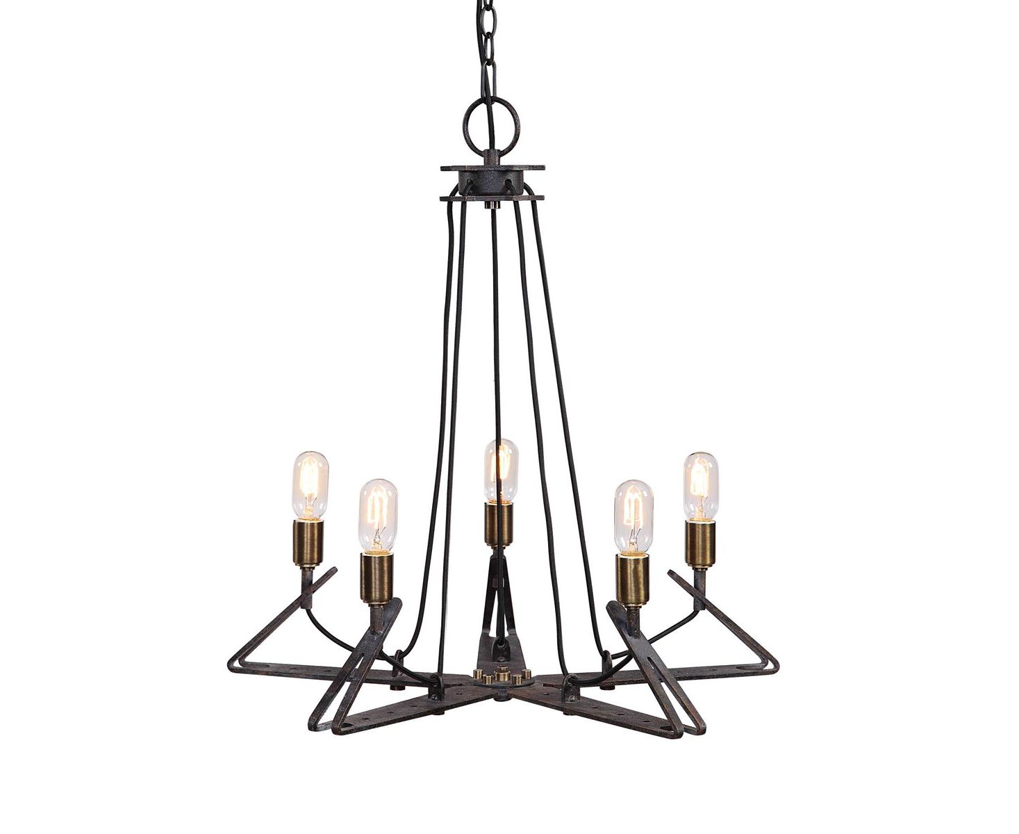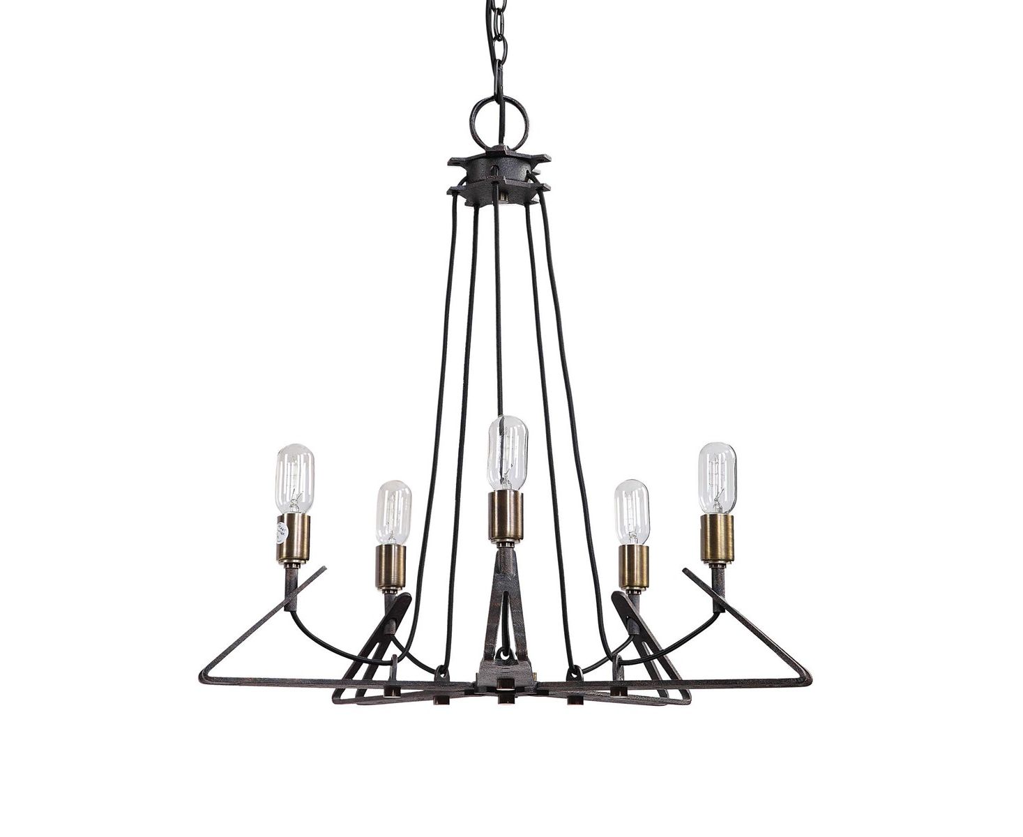 Индустриальный стиль исходит из этой уникальной люстры на 5 ламп. С кронштейнами из толстых стальных заводских кронштейнов, изготовленных из глубоко выветрившейся бронзы с гальваническим античным латунным акцентом.
