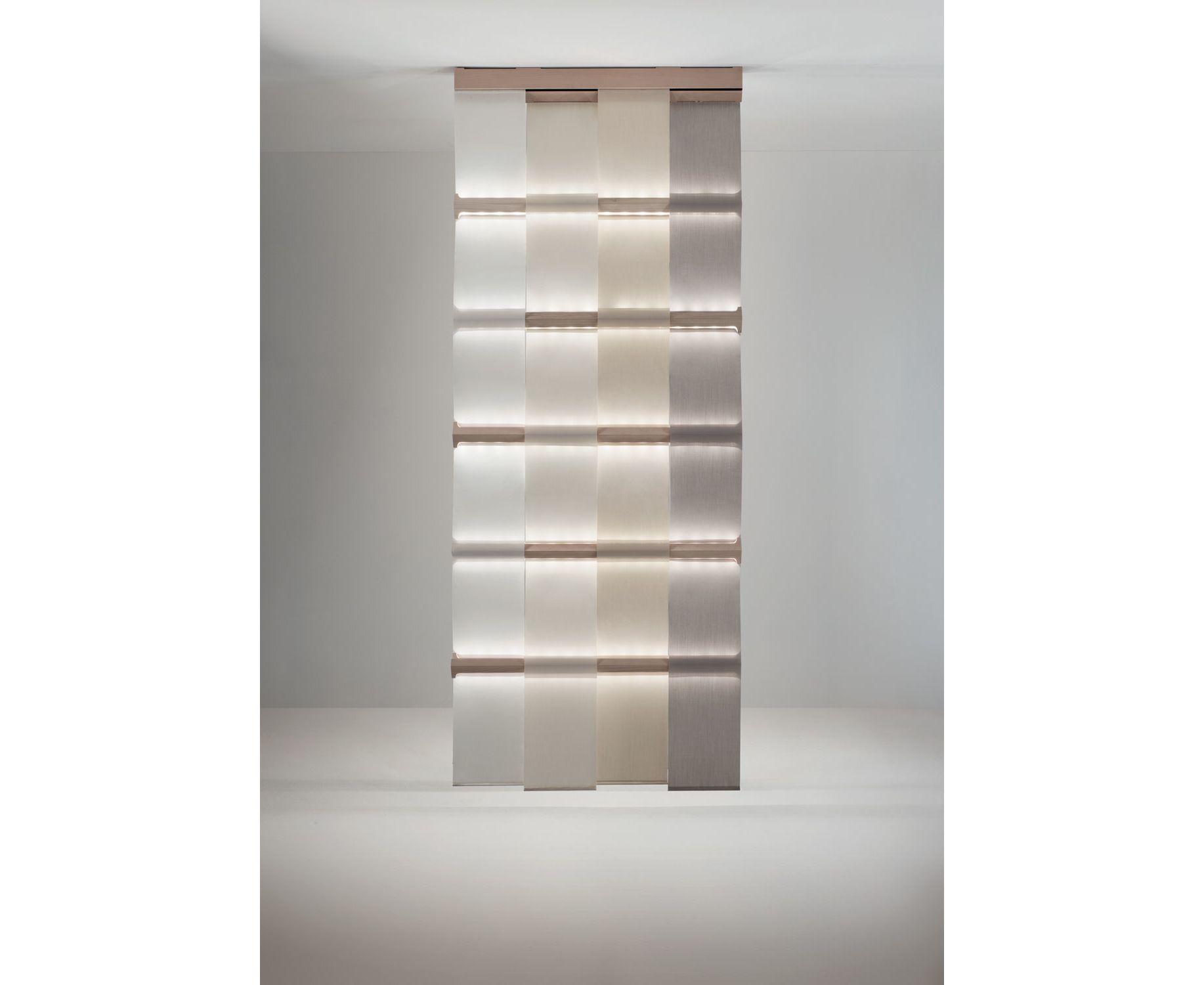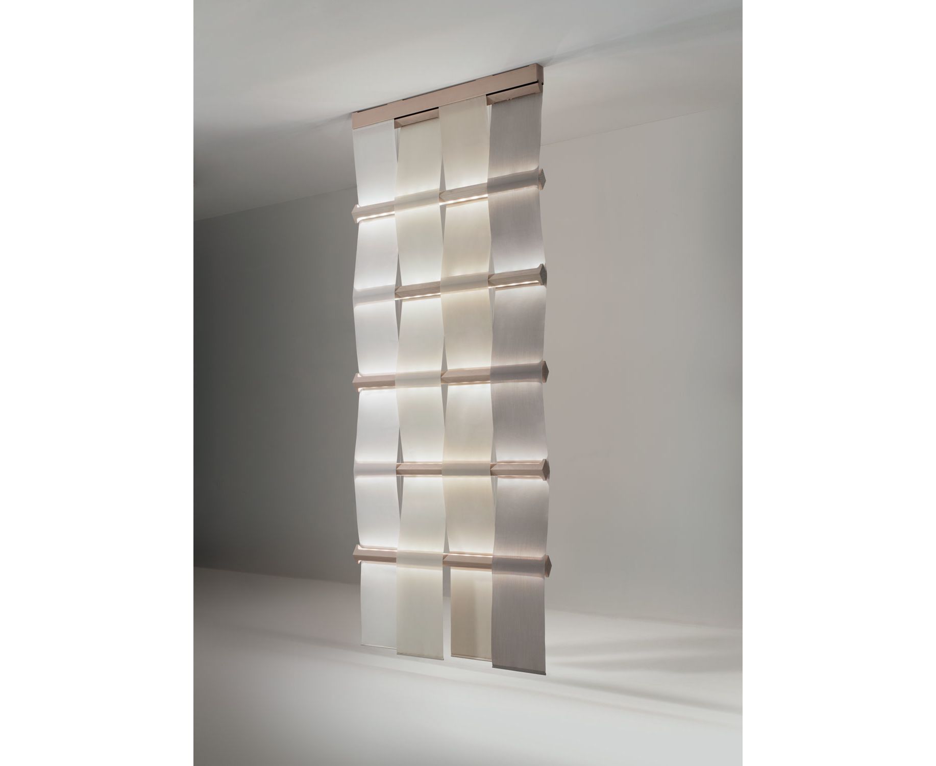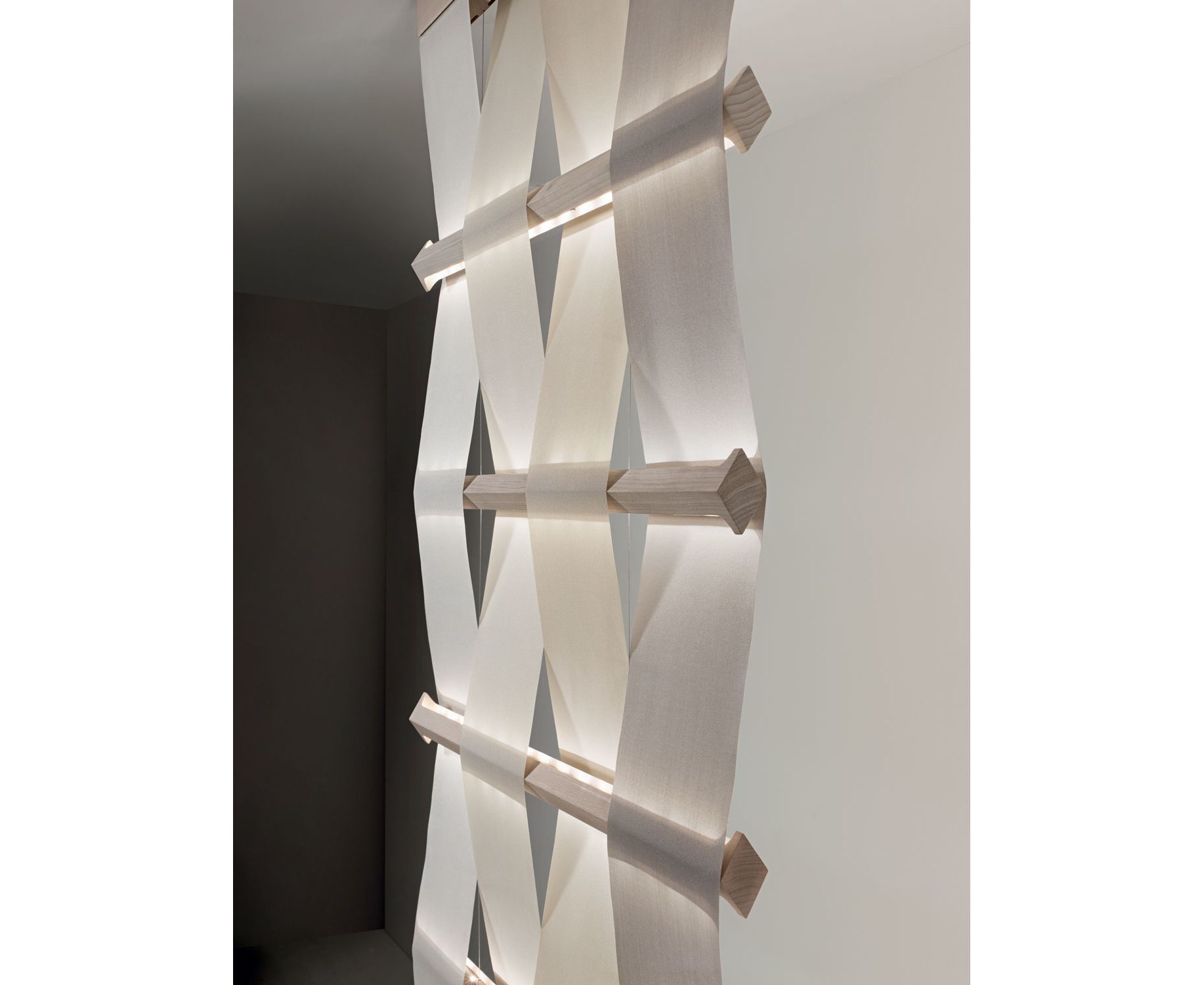 Городской шум и хаос заглушаются природными материалами Metropole - древесиной и звукопоглощающей тканью, которые, смешиваясь в модульных элементах, делят пространство, украшая его светом. Благодаря своим техническим и эстетическим характеристикам, Metropole идеально подходит для освещения больших пространств, таких как лобби в отеле или рестораны с открытым пространством. Эта модульная система включает в себя натуральные планки из буковой древесины, чередующиеся с звукоизоляционной и огнестойкой тканью. В планках содержится светодиодный источник света, который может быть двух- или однонаправленным, в зависимости от световых эффектов, которые вы хотите создать.
