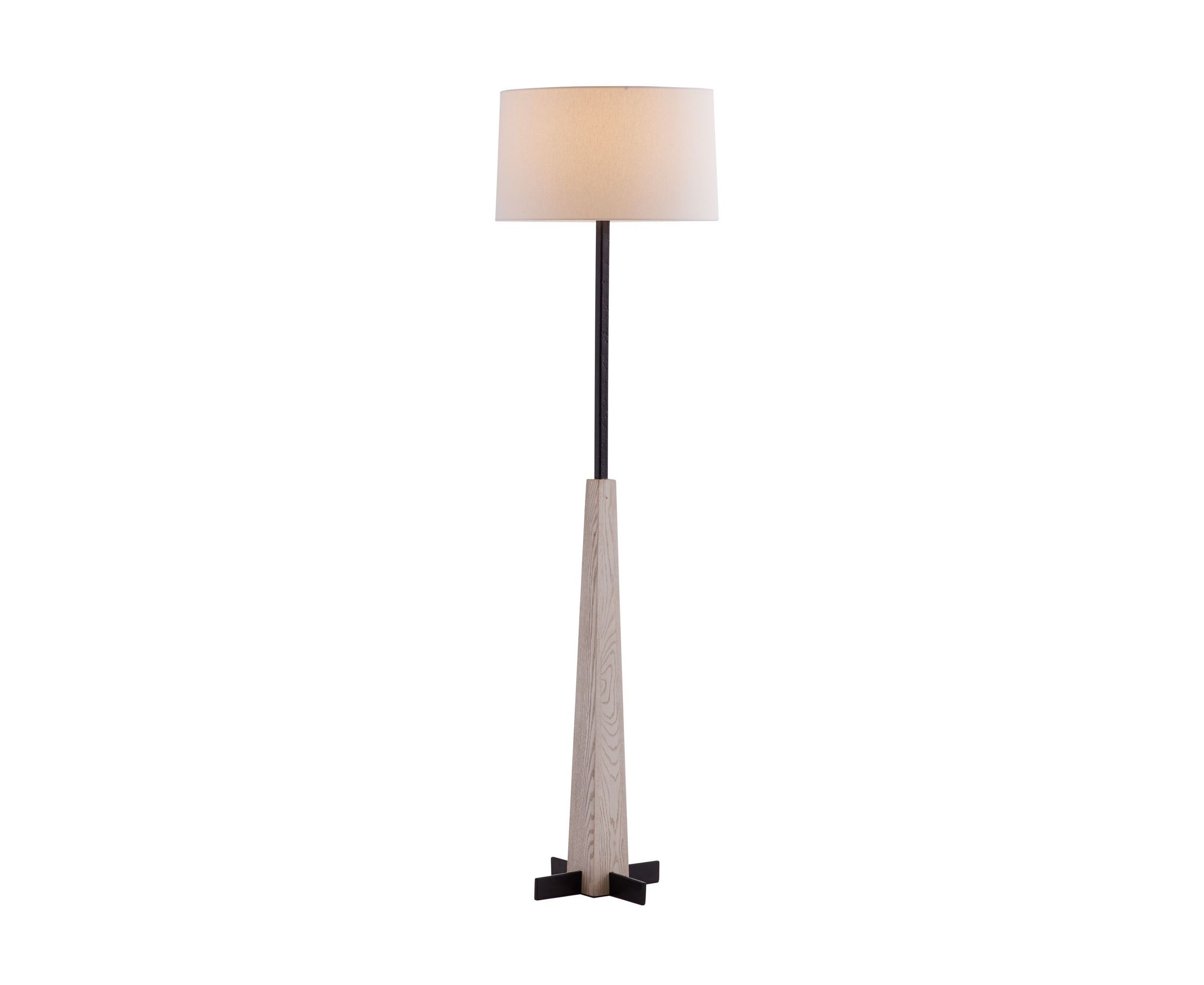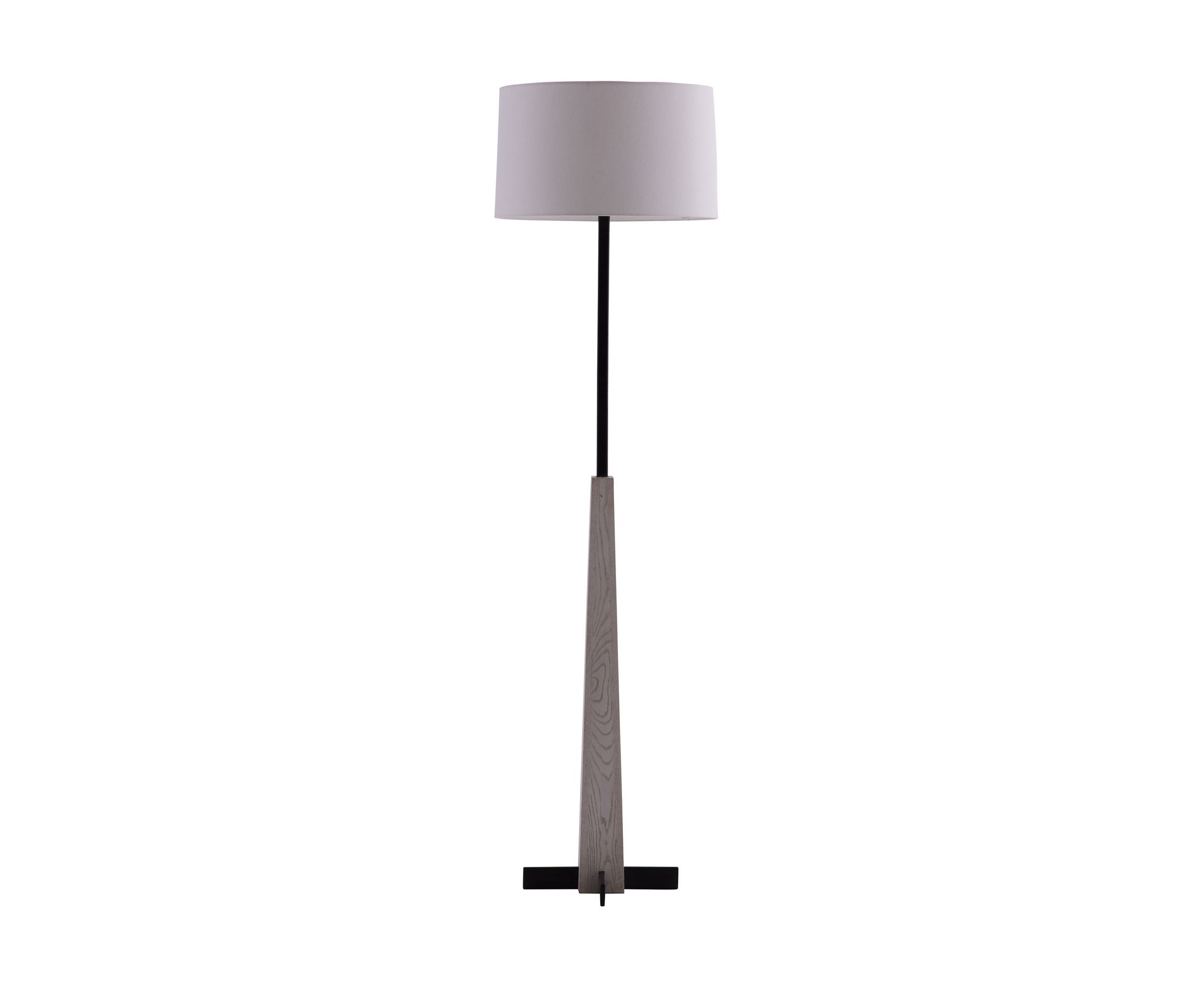 Nassau предлагает визуально простое сочетание смешанных материалов. Простой, прямой силуэт имеет основание из почерневшего железа, которое частично заключено в большую коническую деревянную колонну с серой отделкой. Сверху - белоснежный льняной барабанный абажур с белоснежной хлопчатобумажной подкладкой и навершием в виде бронзовой сферы.