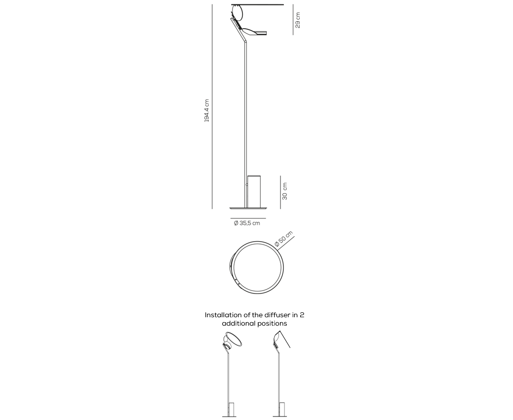 Коллекция состоит из стальных и алюминиевых подвесных, напольных и настольных светильников. Доступен в черном цвете. Источник освещения можно установить в трех разных положениях. Встроенный диммируемый светодиодный источник света.