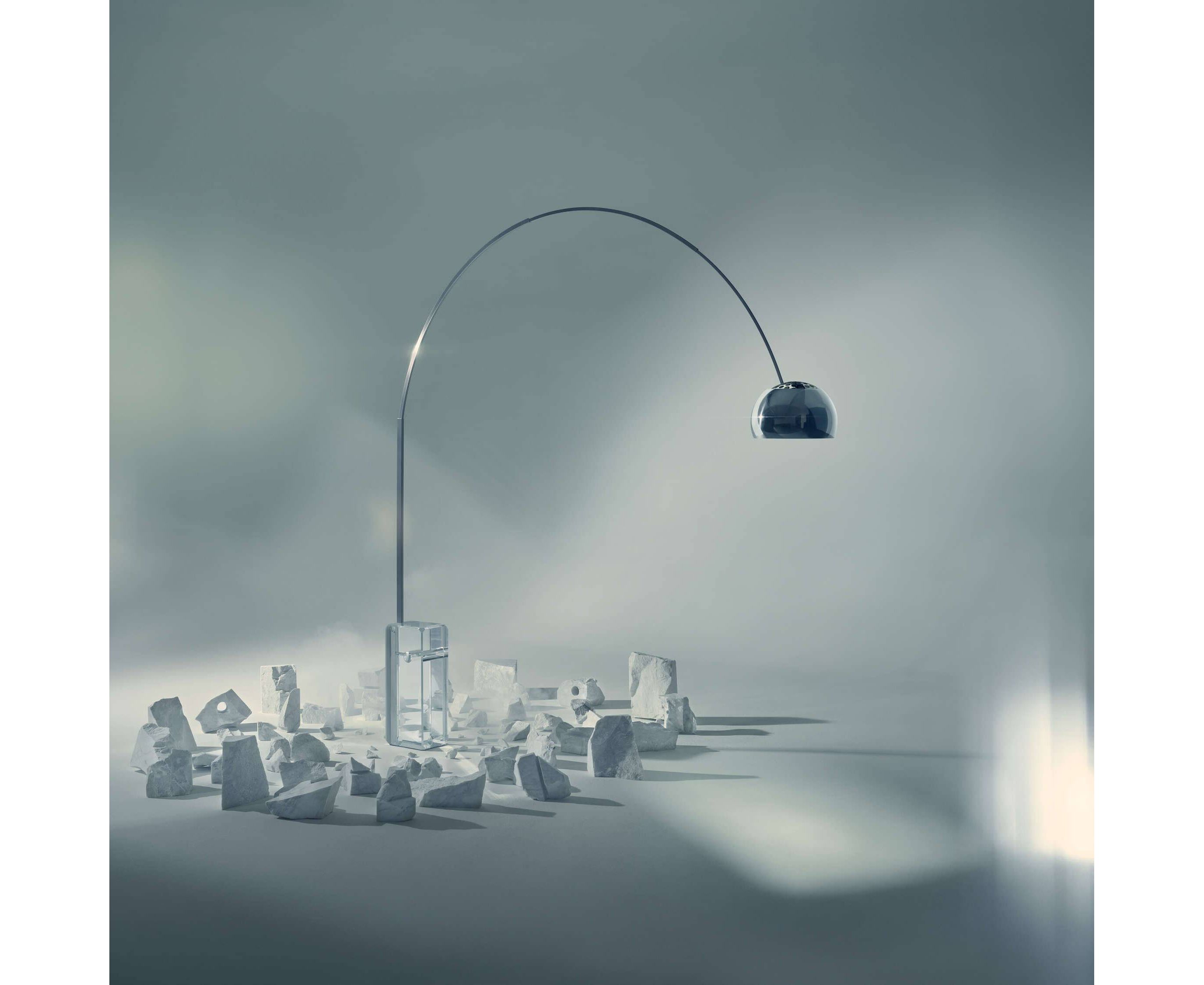 Торшер, обеспечивающий прямой свет. Бессвинцовая стеклянная основа. Телескопический шток из нержавеющей стали с сатиновым покрытием. Прессованный, полированный и покрытый лаком алюминиевый поворотный и регулируемый по высоте отражатель. Arco K - ограниченная серия.