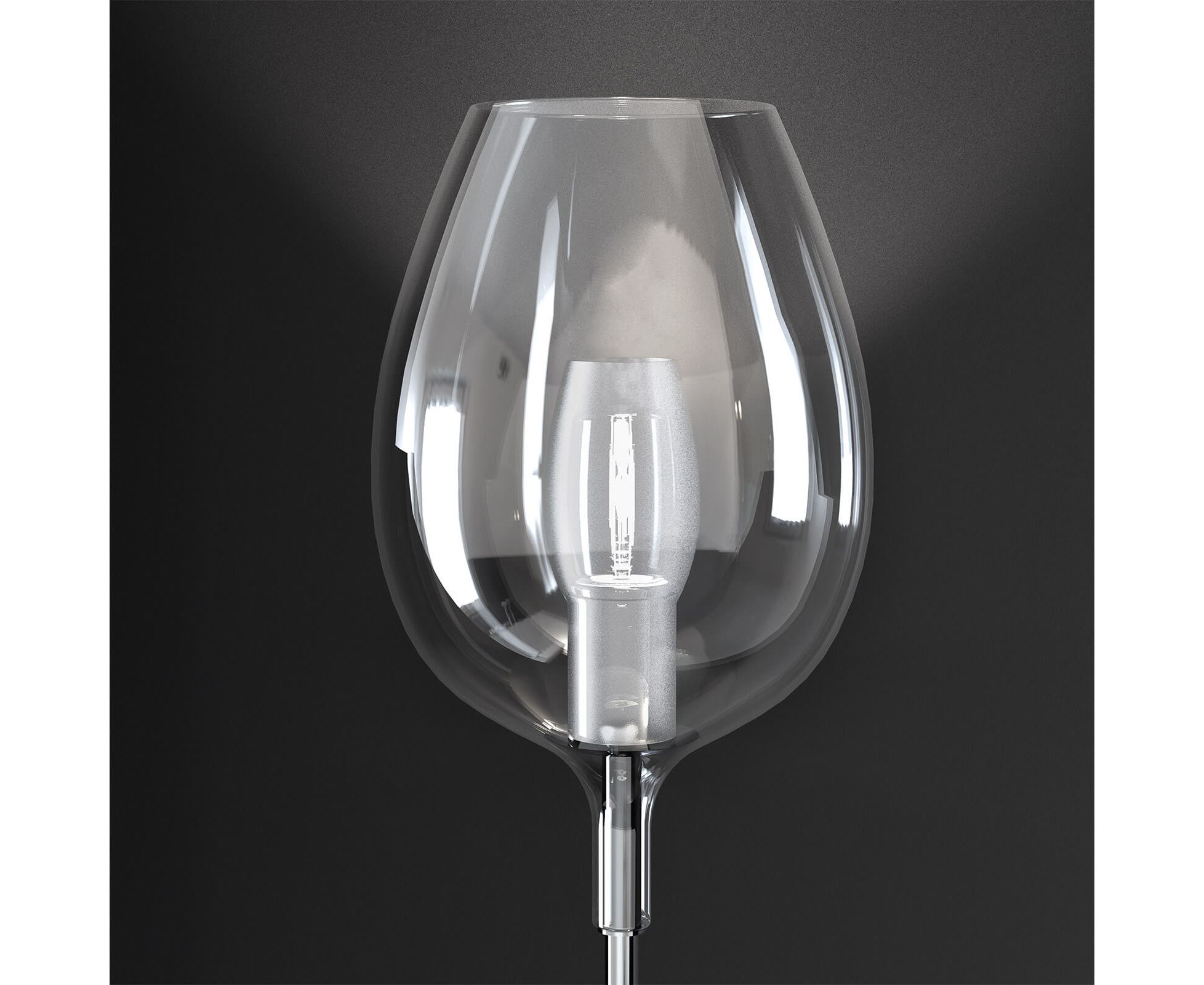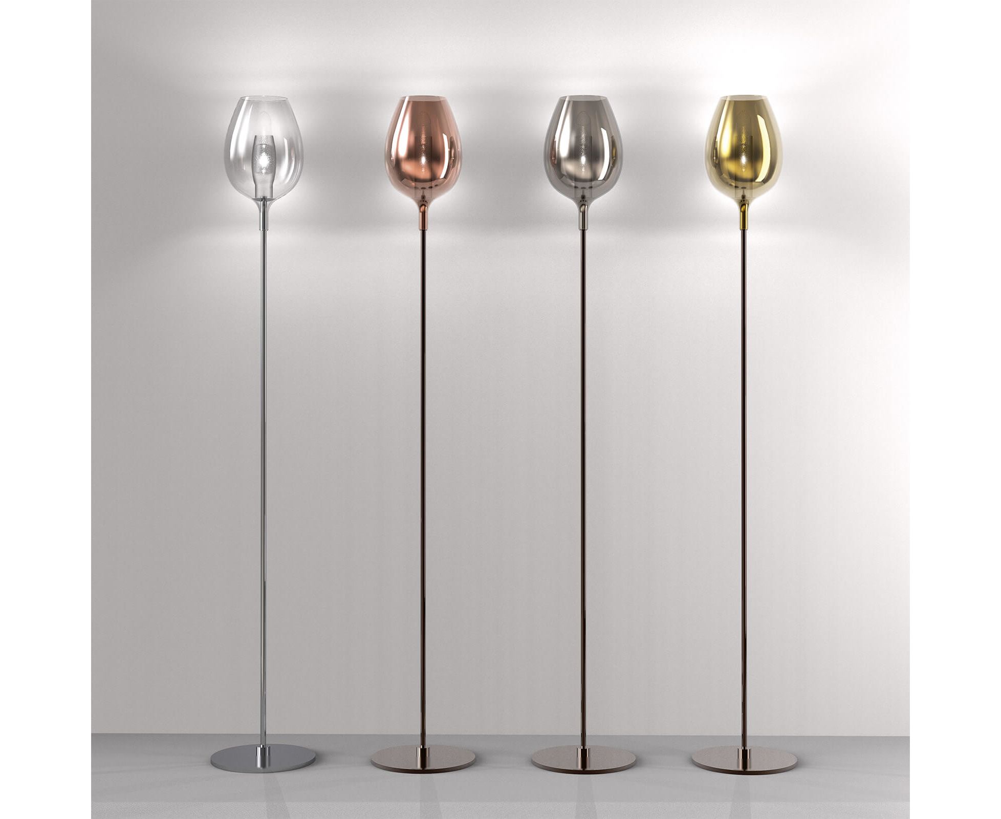 Напольный светильник с рассеивателем из выдувного стекла и металлической структурой с хромированной отделкой. Доступен в разных цветах.