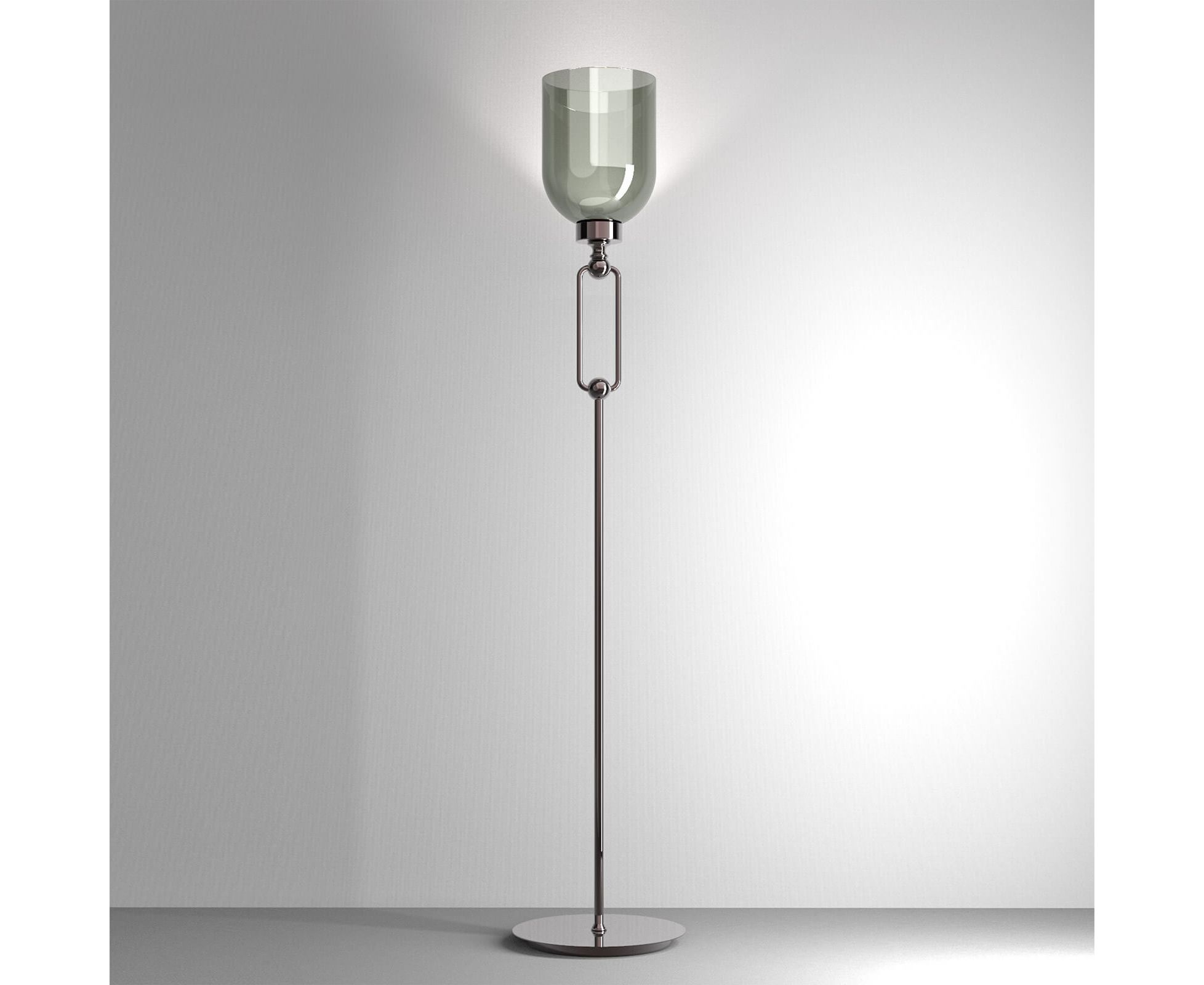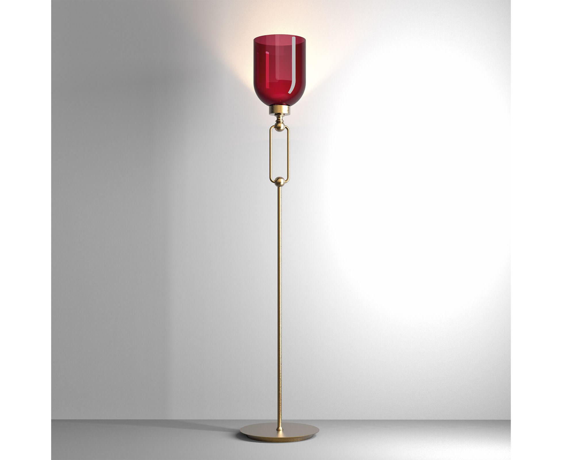Торшер из металла с отделкой из матового золота или серого железа с рассеивателем из красного или дымчатого стекла.