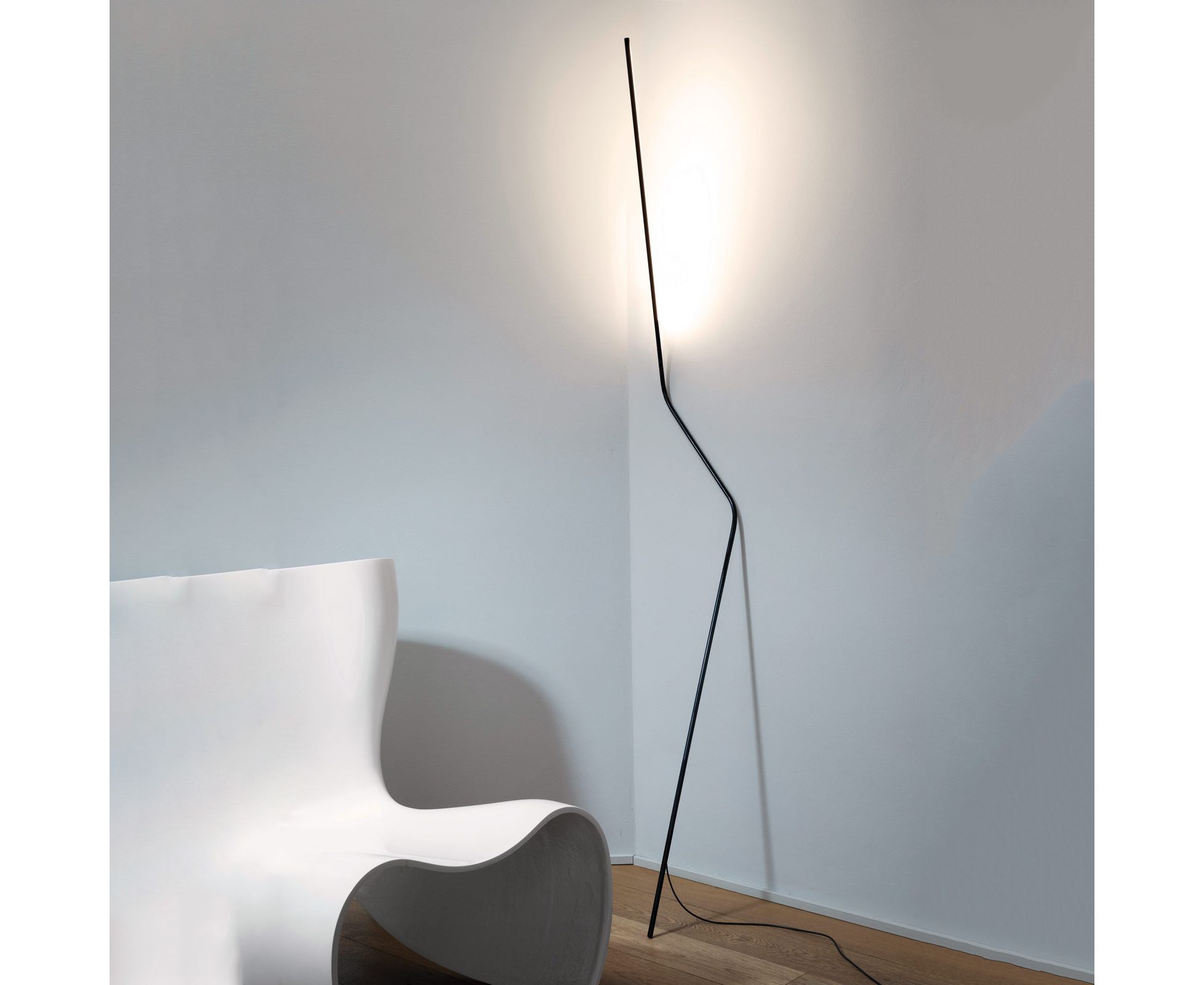 Светодиодный торшер, опирающийся на стену, изогнутая стальная конструкция и осветительный блок из алюминия, окрашенного в черный матовый цвет Терминал осветительного устройства вращается сам по себе для непрямого света. Педаль для включения/выключени с диммером.