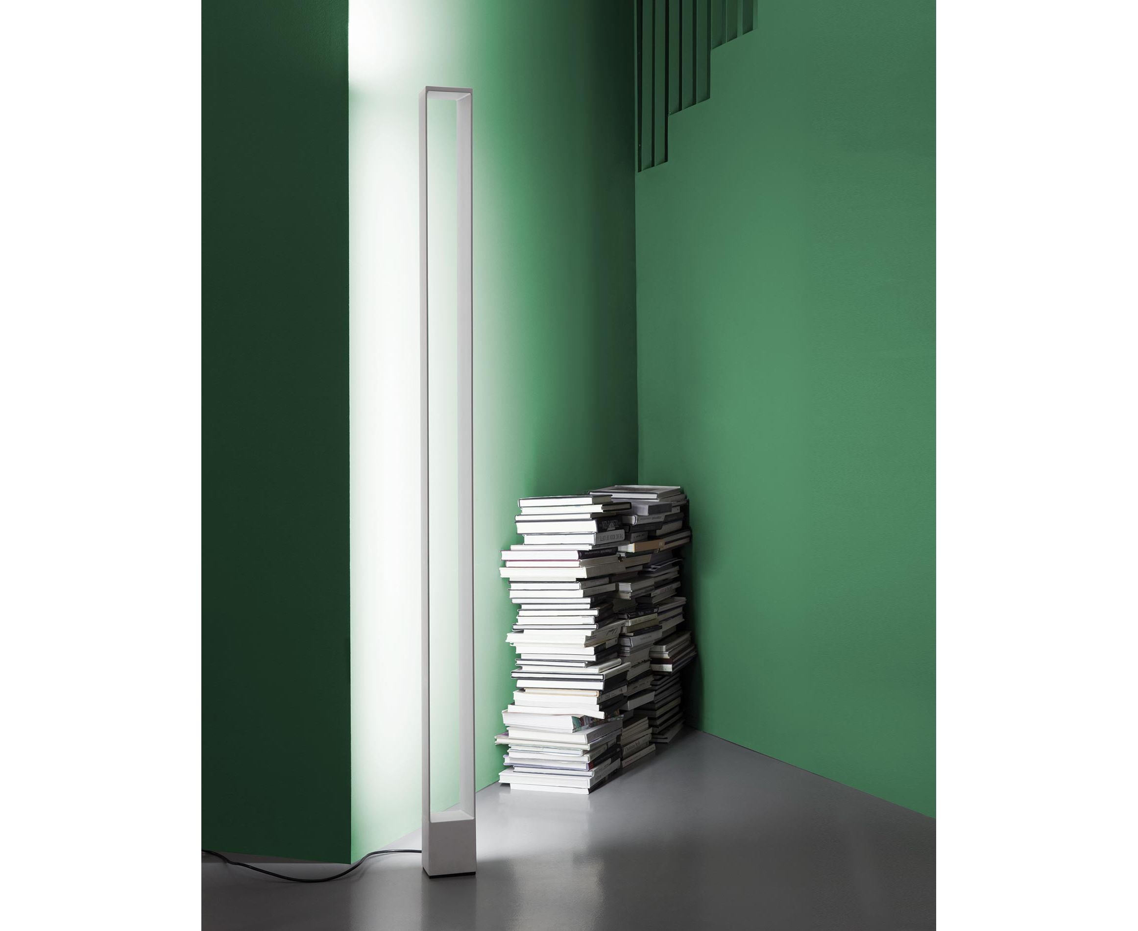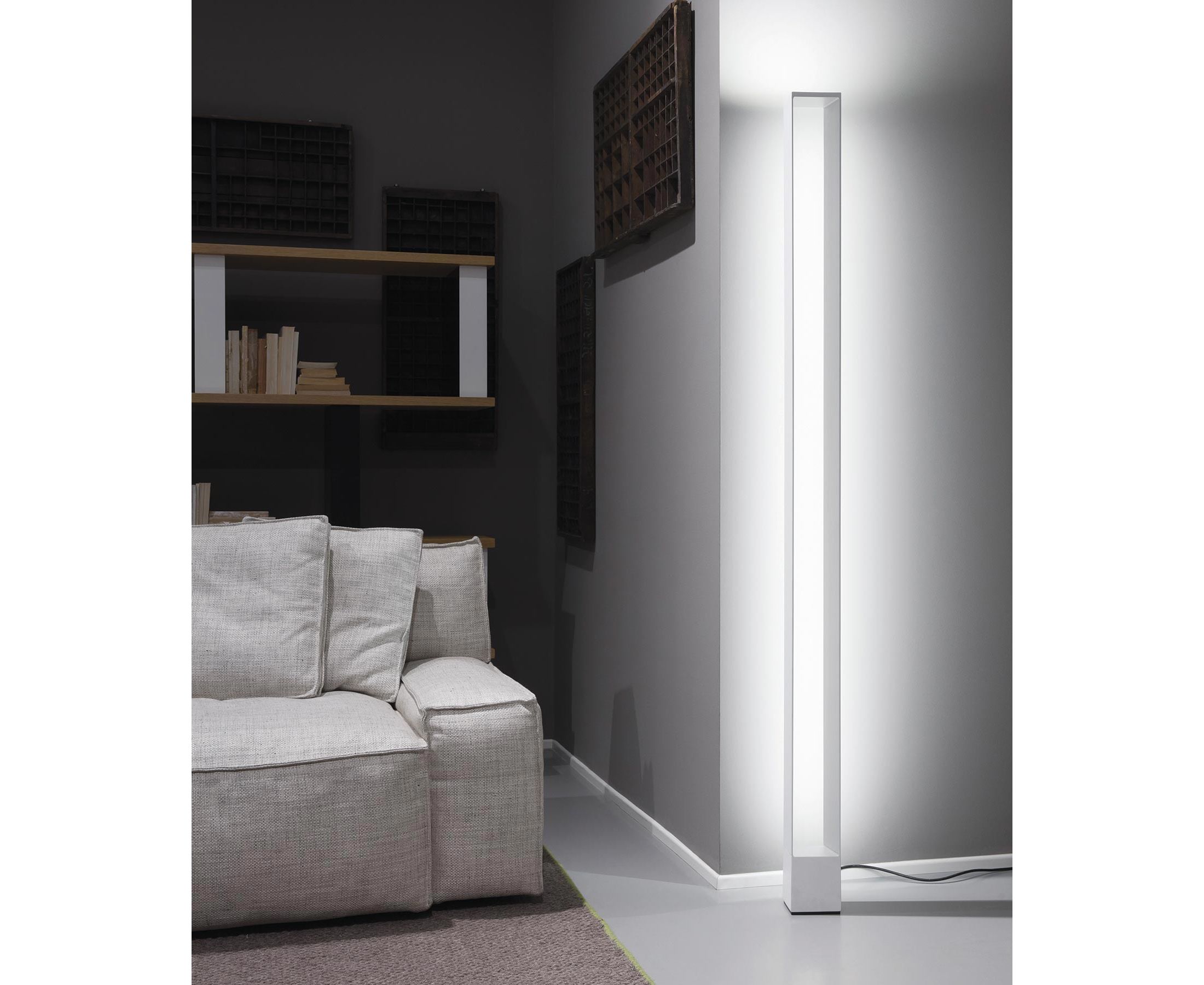 Торшер с корпусом из экструдированного алюминия, головки и цоколь из литого под давлением алюминия, рассеиватели из опала и прозрачного метакрилата. Структура окрашена в белый матовый, черный матовый, серый титан или полуглянцевое золото. Светодиодный источник света верхнего света обеспечивает теплое рассеянное освещение, а задний светодиод создает непрямое окружающее освещение. Двойное затемнение.