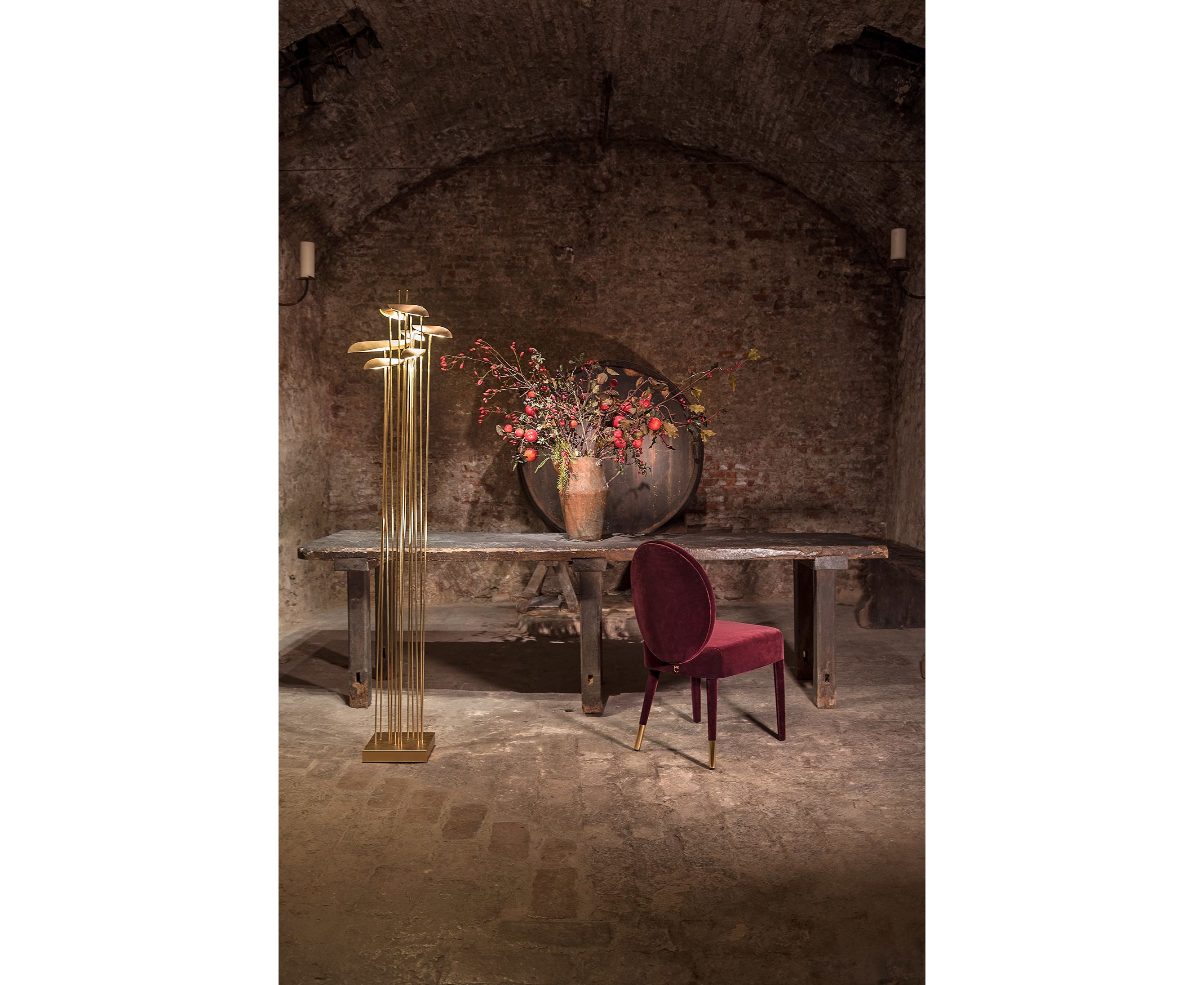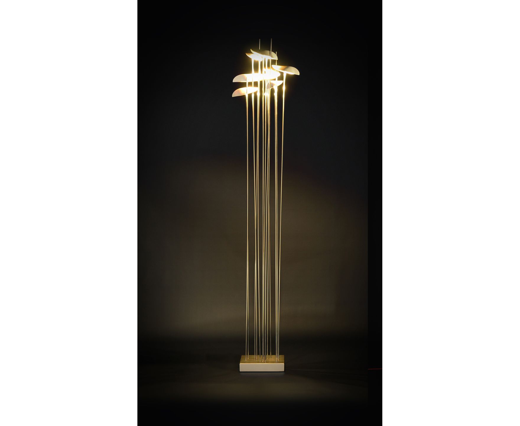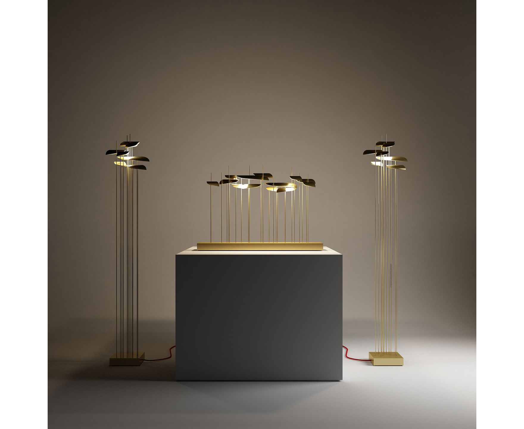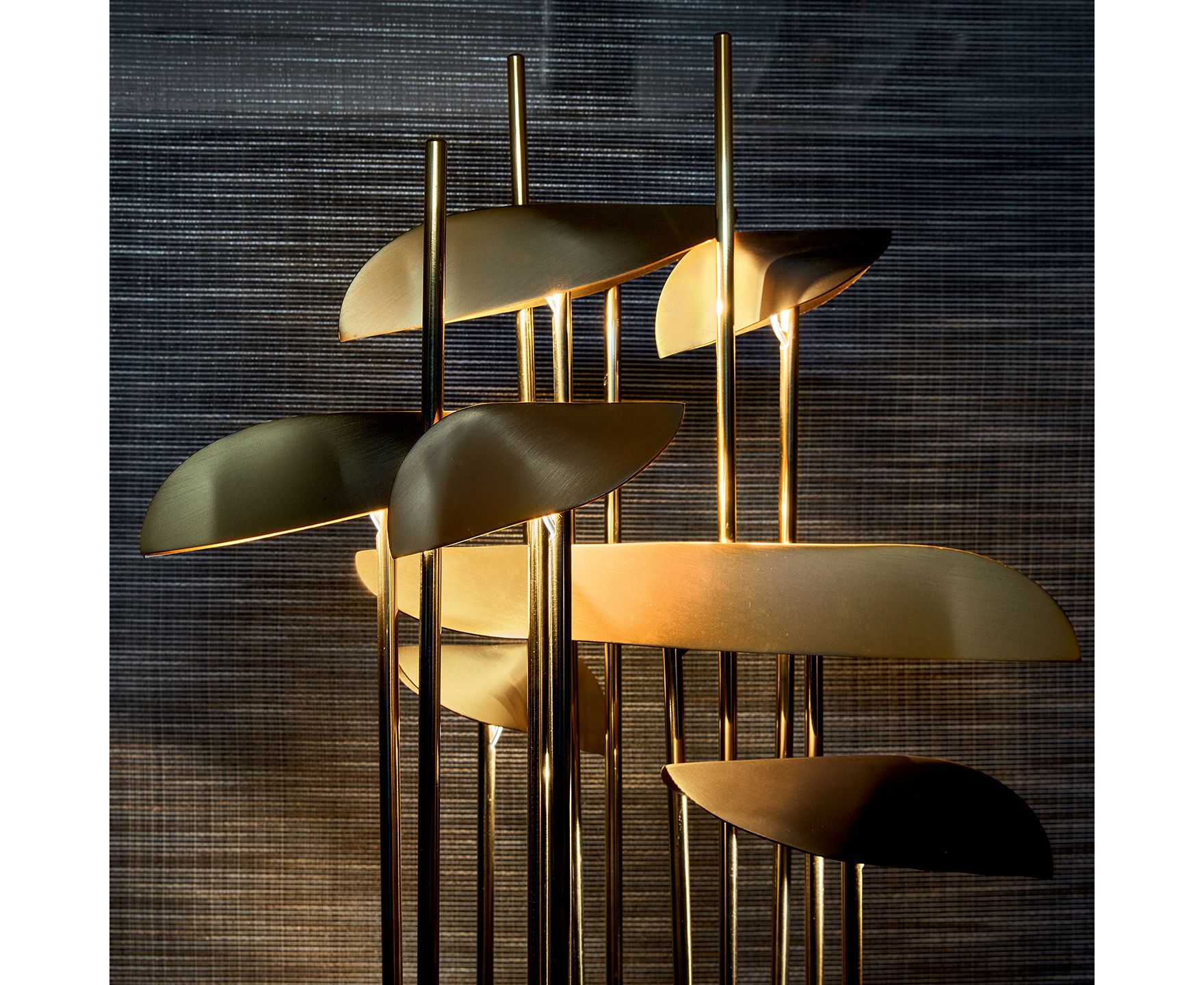 Anodine Floor - это отдельно стоящая лампа, которая превращает свет в скульптуру, воплощая концепцию «формы, не формы» света, что добавляет художественную атмосферу в интерьер. Она состоит из 13 блестящих латунных стеблей, прикрепленных к квадратной металлической основе, покрытой лаком «матовое золото», некоторые из которых украшены металлическими листьями, все они асимметричны и изготовлены вручную опытными мастерами с отделкой из гальванического матового золота. Идеально в паре, чтобы создать правильную симметрию в комнате. Благодаря ручным технологиям изготовления, каждая часть коллекции уникальна.