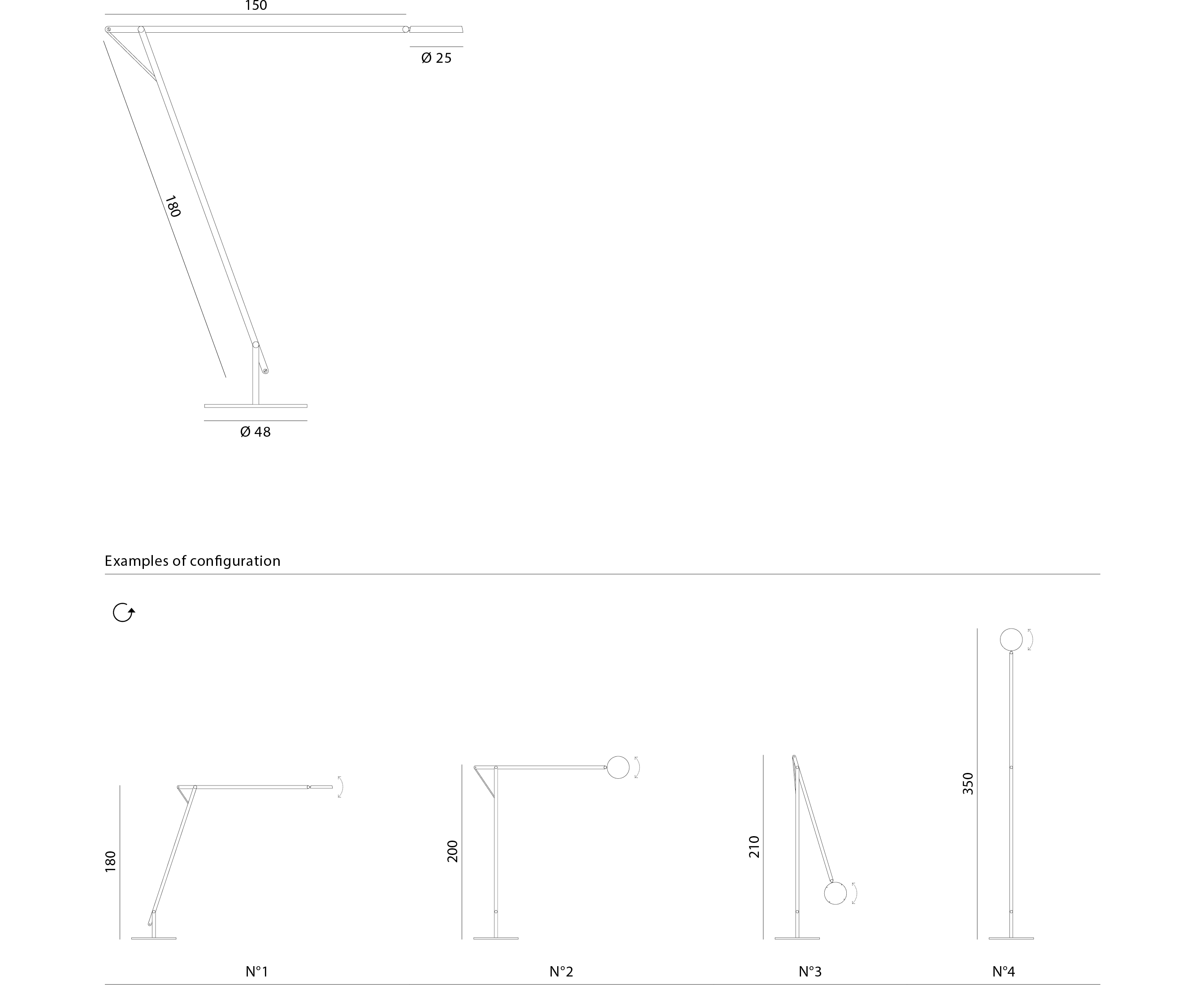 Алюминиевая конструкция опирается на основание с чугунным балластом с цветным эластичным шнуром, который компенсирует движения. Сенсорный диммер встроен в нижний рычаг, а головка с рассеивателем из поликарбоната защищает прямой свет от светодиодов и регулируется.