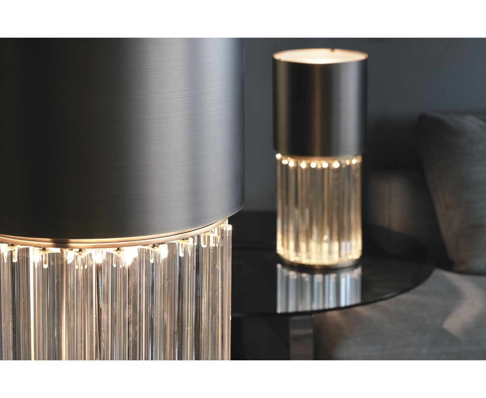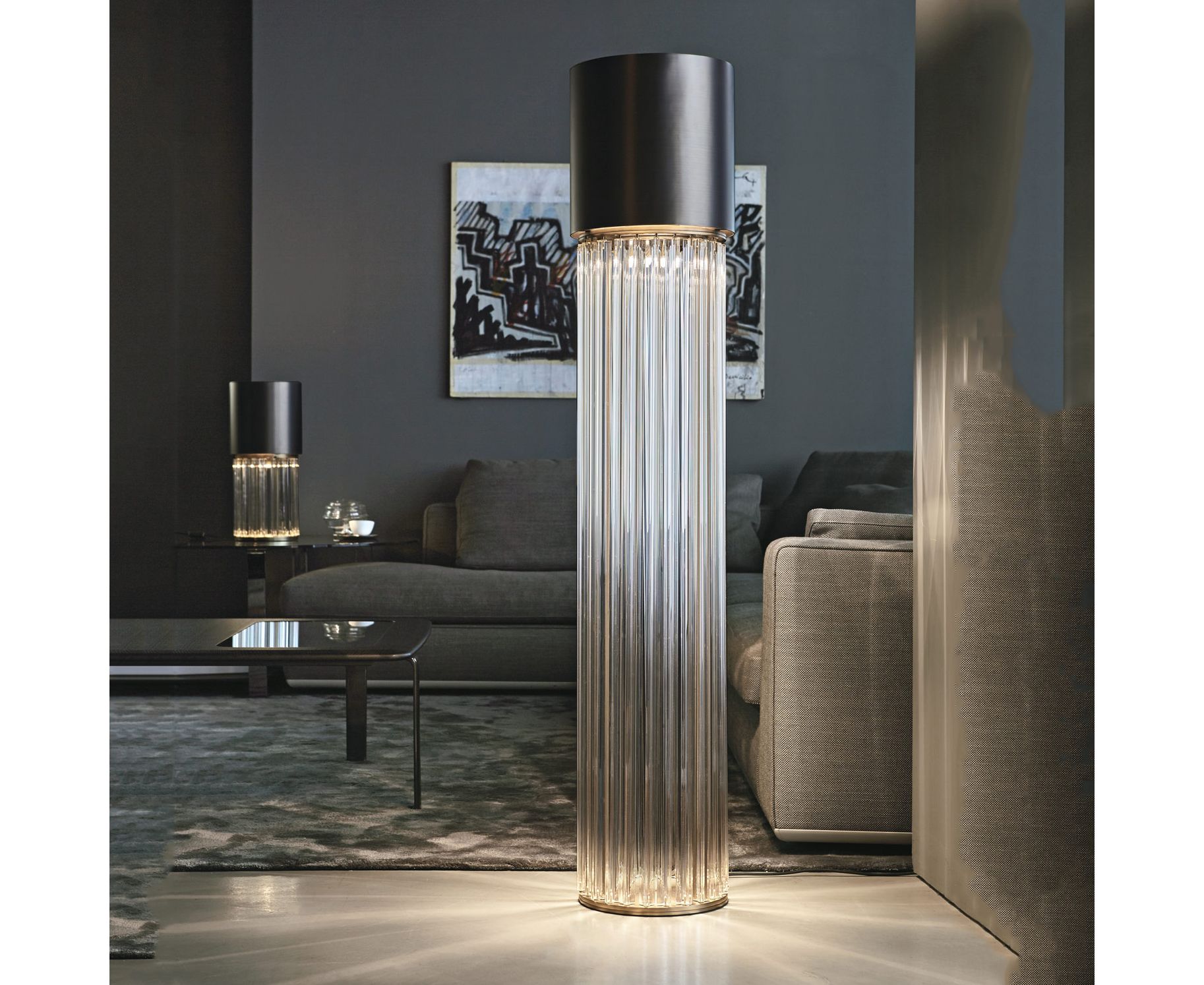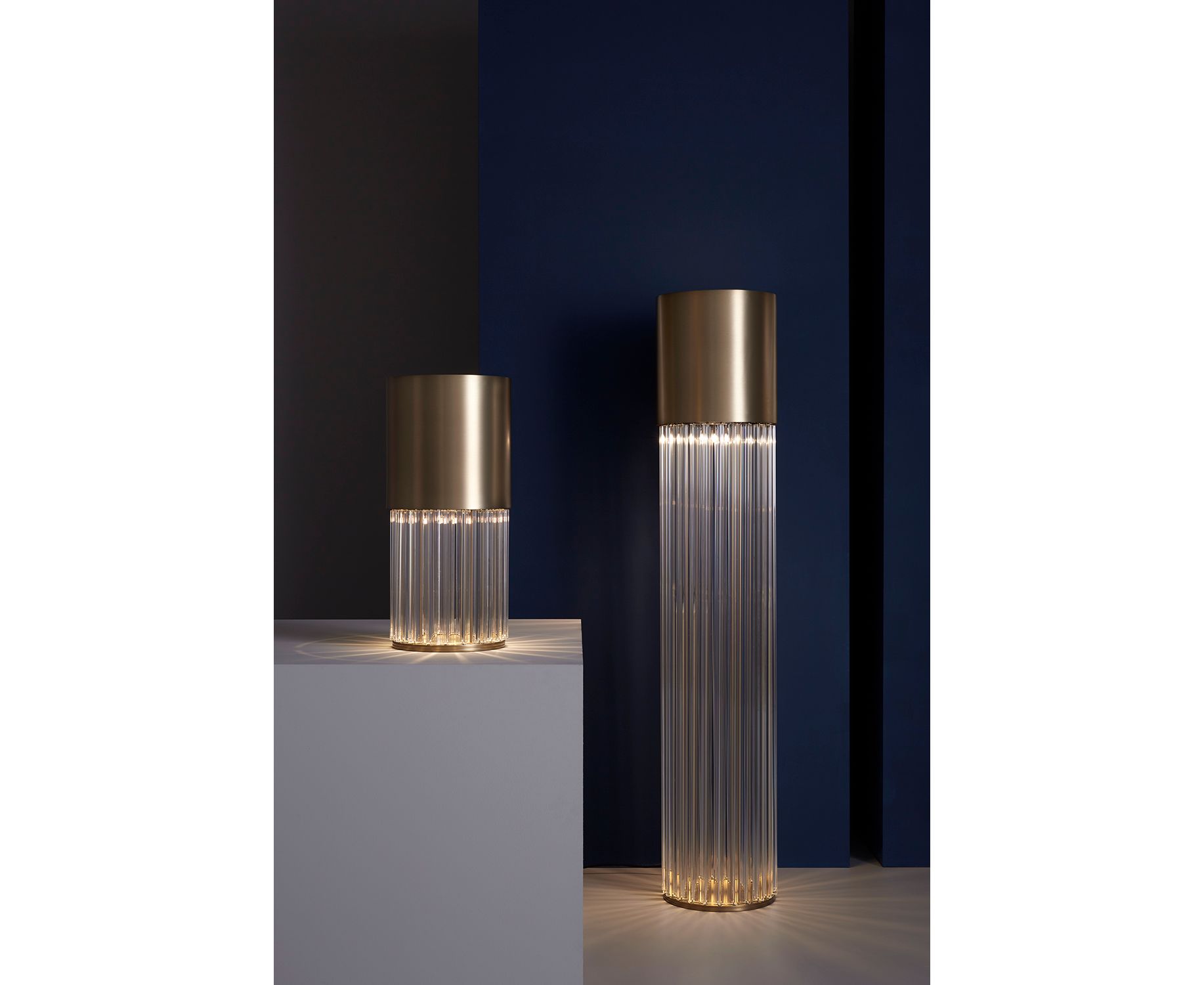 Напольный светильник рассеянного света, вдохновленный элегантностью флакона духов. Легкая полосатая структура из темной бронзы или шелковистой латуни и кристалла, дымчато-серого или янтарного трехгранника из выдувного муранского стекла.