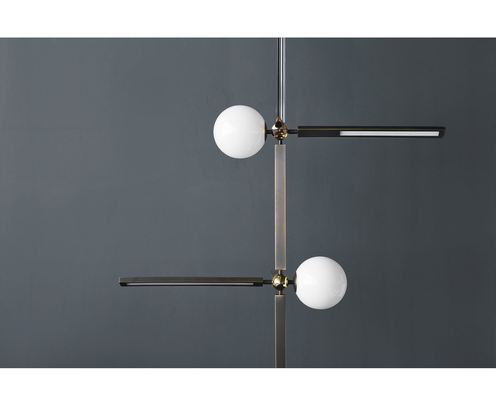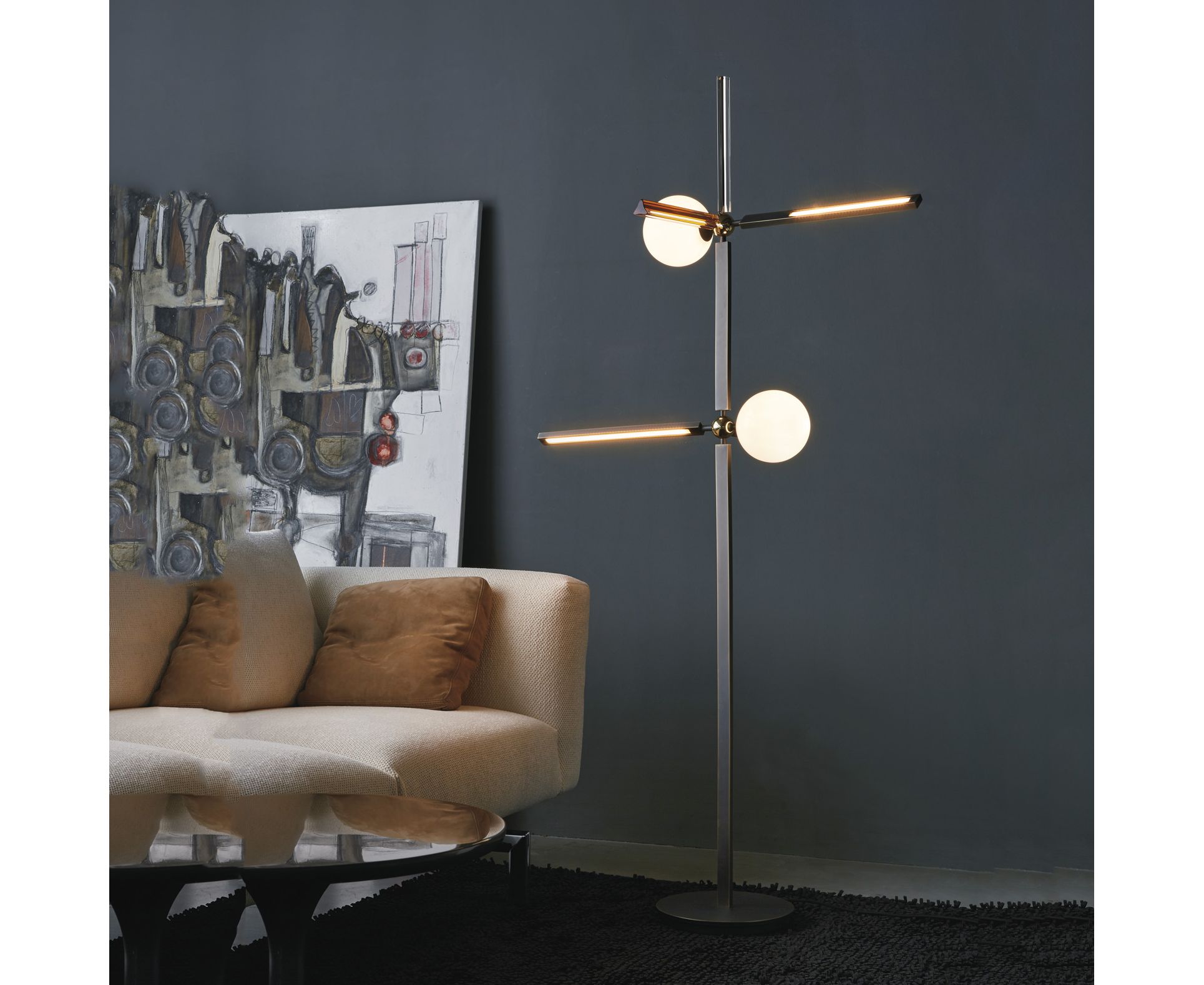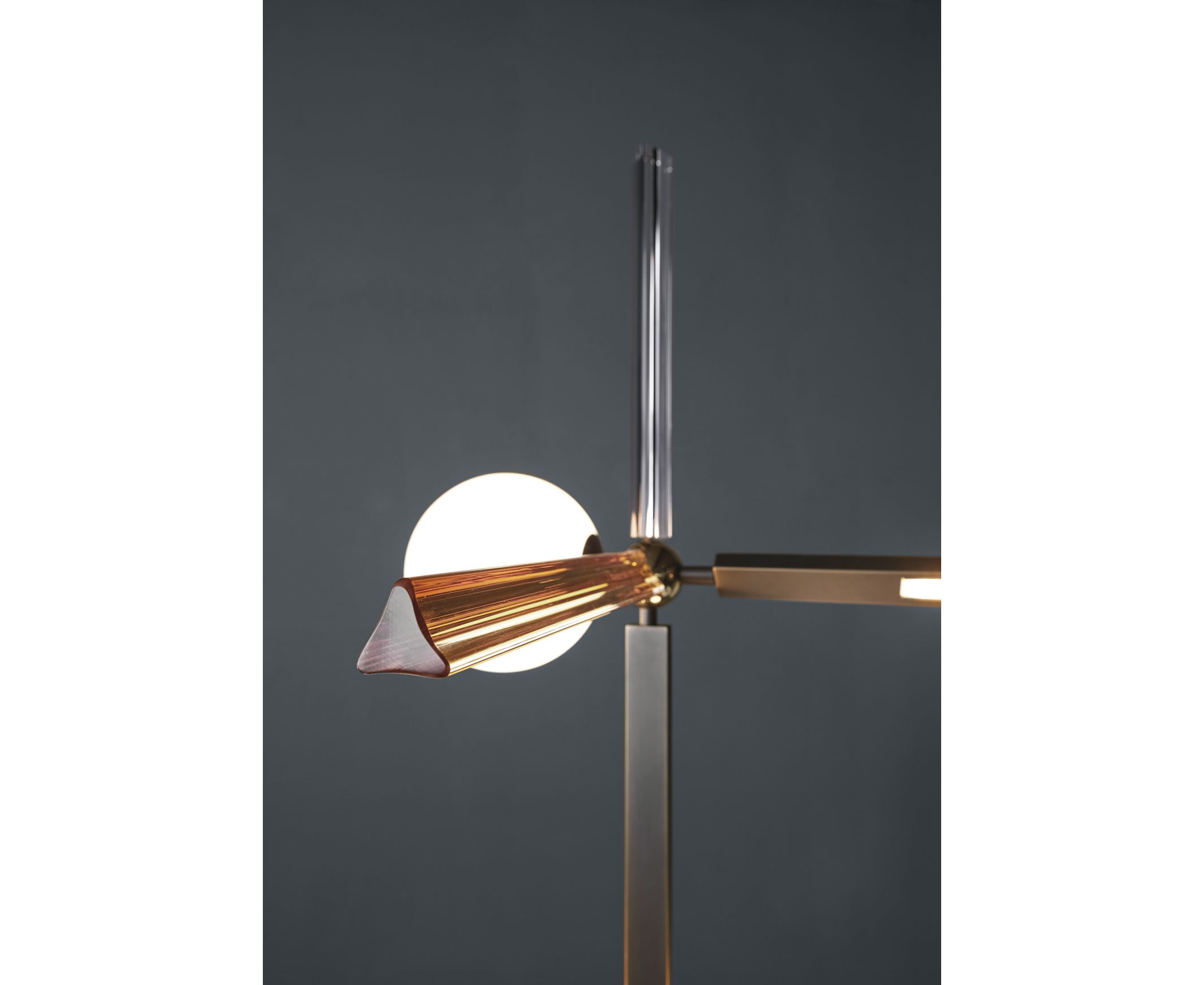 Стилизованные формы и благородные материалы объединяют самые важные элементы бренда в одном объекте. Торшер с темной полированной латунной структурой и полированными золотыми металлическими сферами. Белые диффузоры из выдувного муранского стекла и кристаллические трехгранники из выдувного муранского стекла.