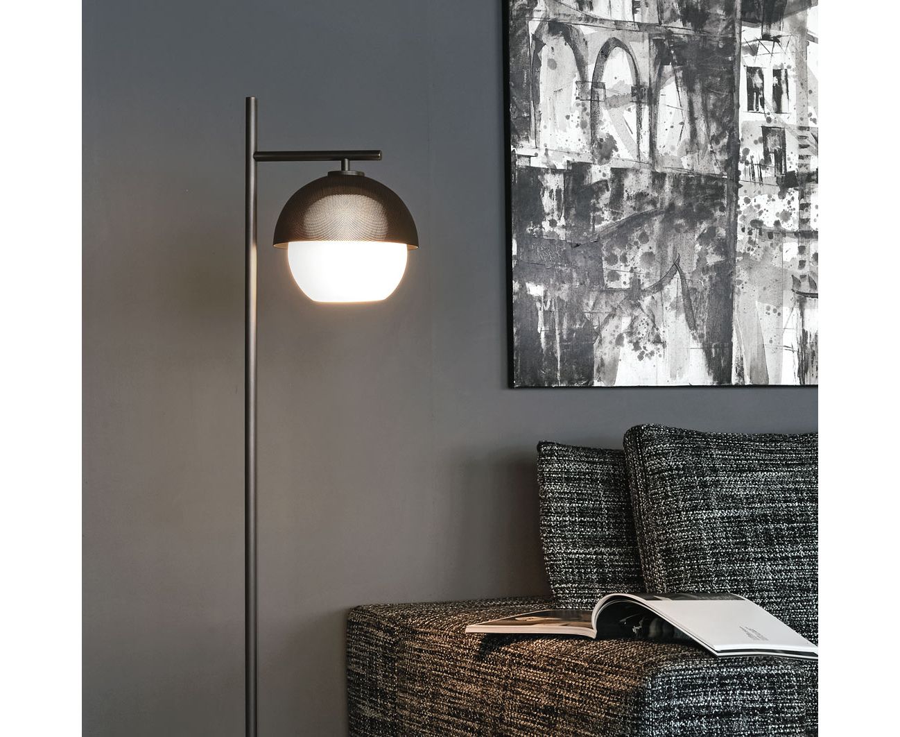 Напольный светильник с рассеянным светом. Его светлая или темная полированная латунная структура идеально подходит для различного использования. Элегантный металлический микроперфорированный абажур, доступный в двух цветах, смягчает яркость диффузора из выдувного стекла.