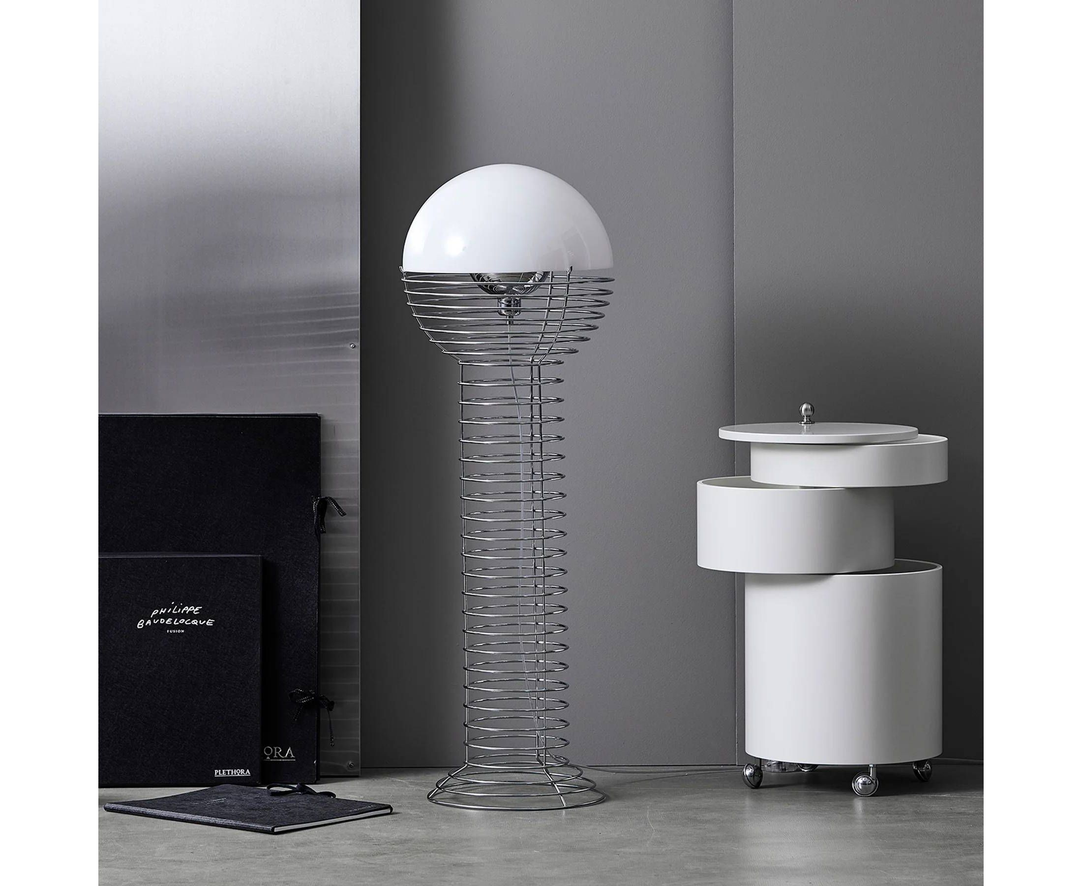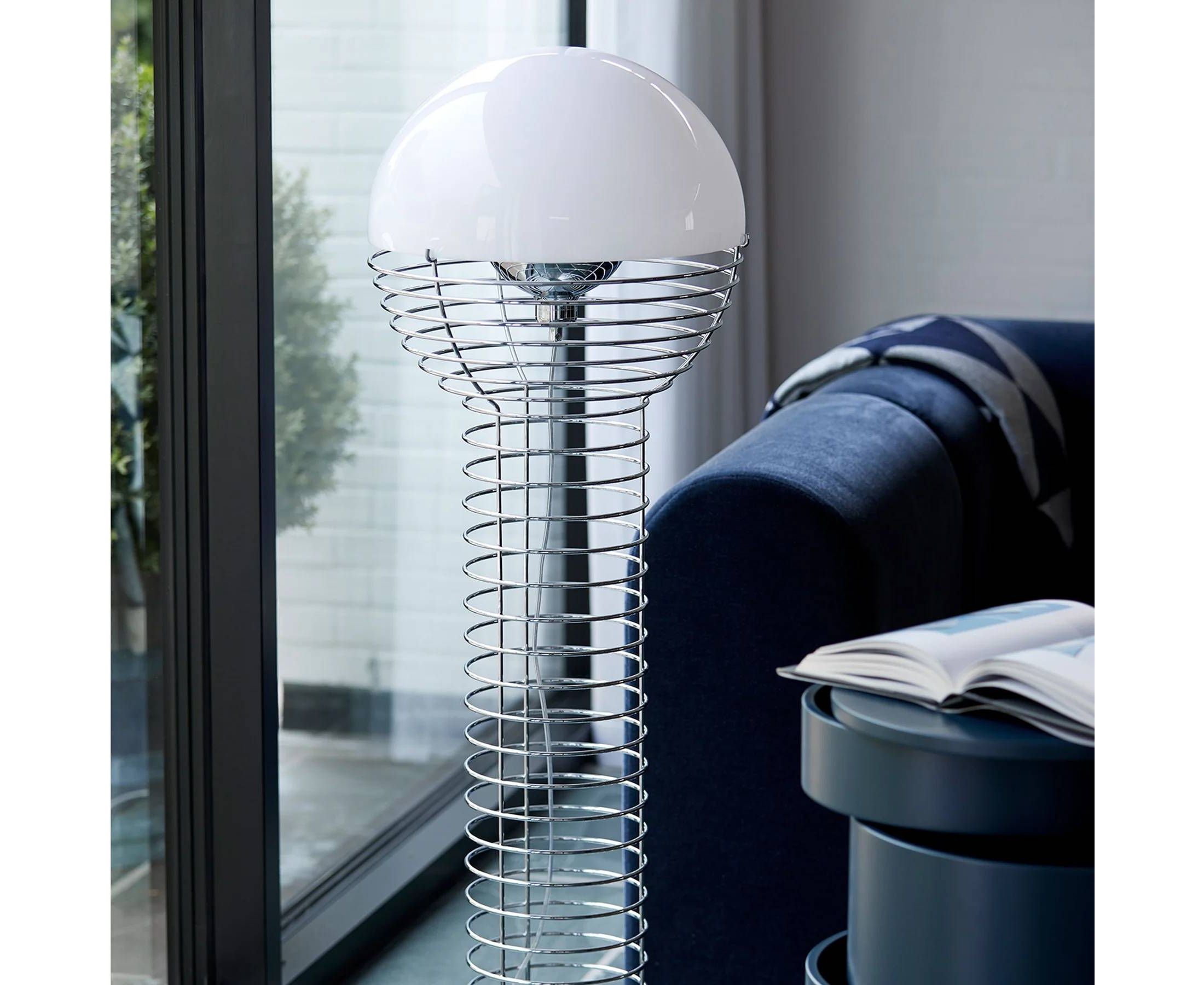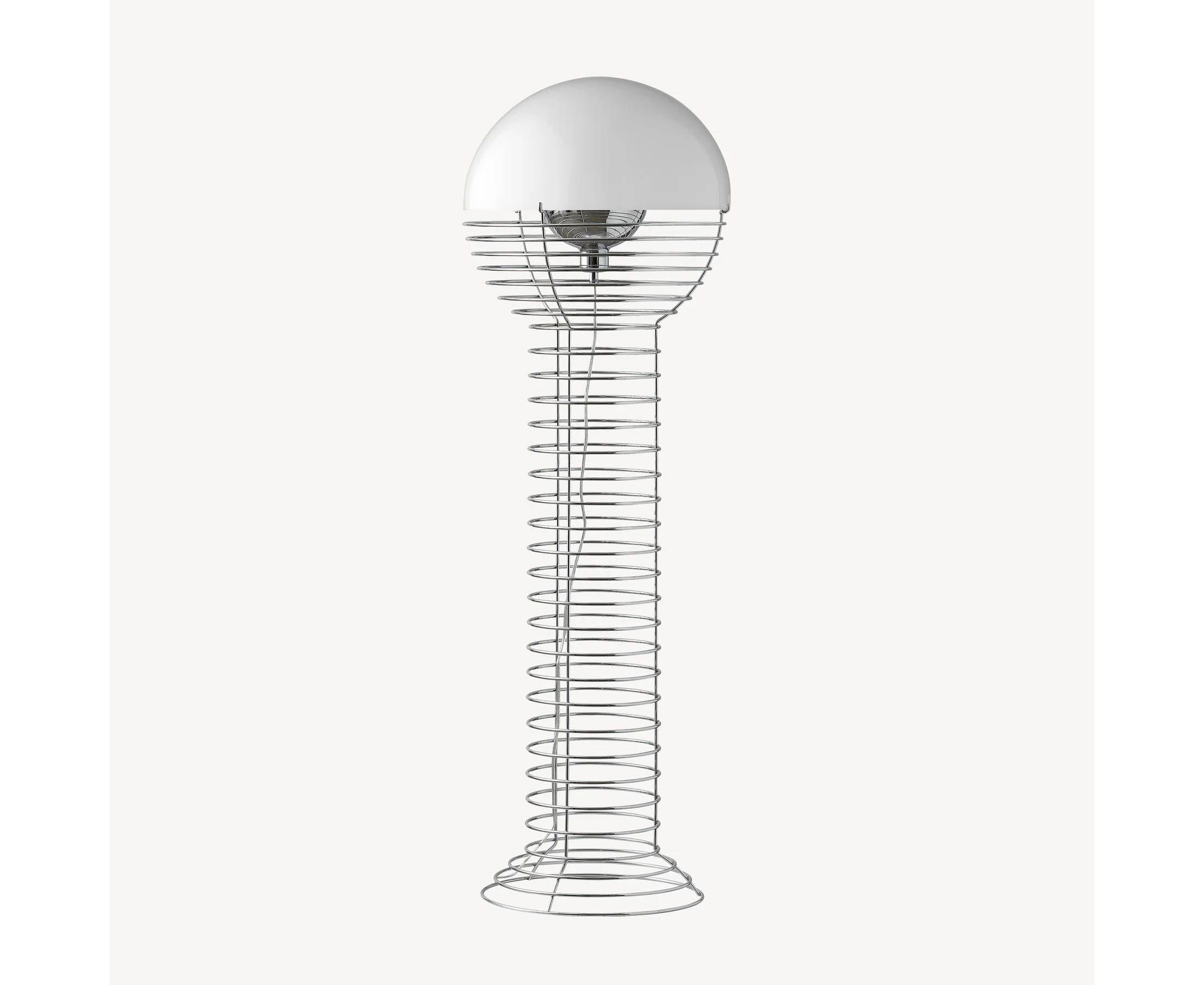 Декоративный проволочный торшер отличается каркасом из хромированной стальной проволоки, который расширяется вверху, поддерживая белый полусферический пластиковый абажур. Лампочка помещена в небольшой, также полусферический металлический отражатель, который направляет свет внутрь абажура. Каркас придает дизайну характерный, но в то же время очень легкий и ненавязчивый внешний вид, а белый абажур обеспечивает достаточное количество рассеянного света.