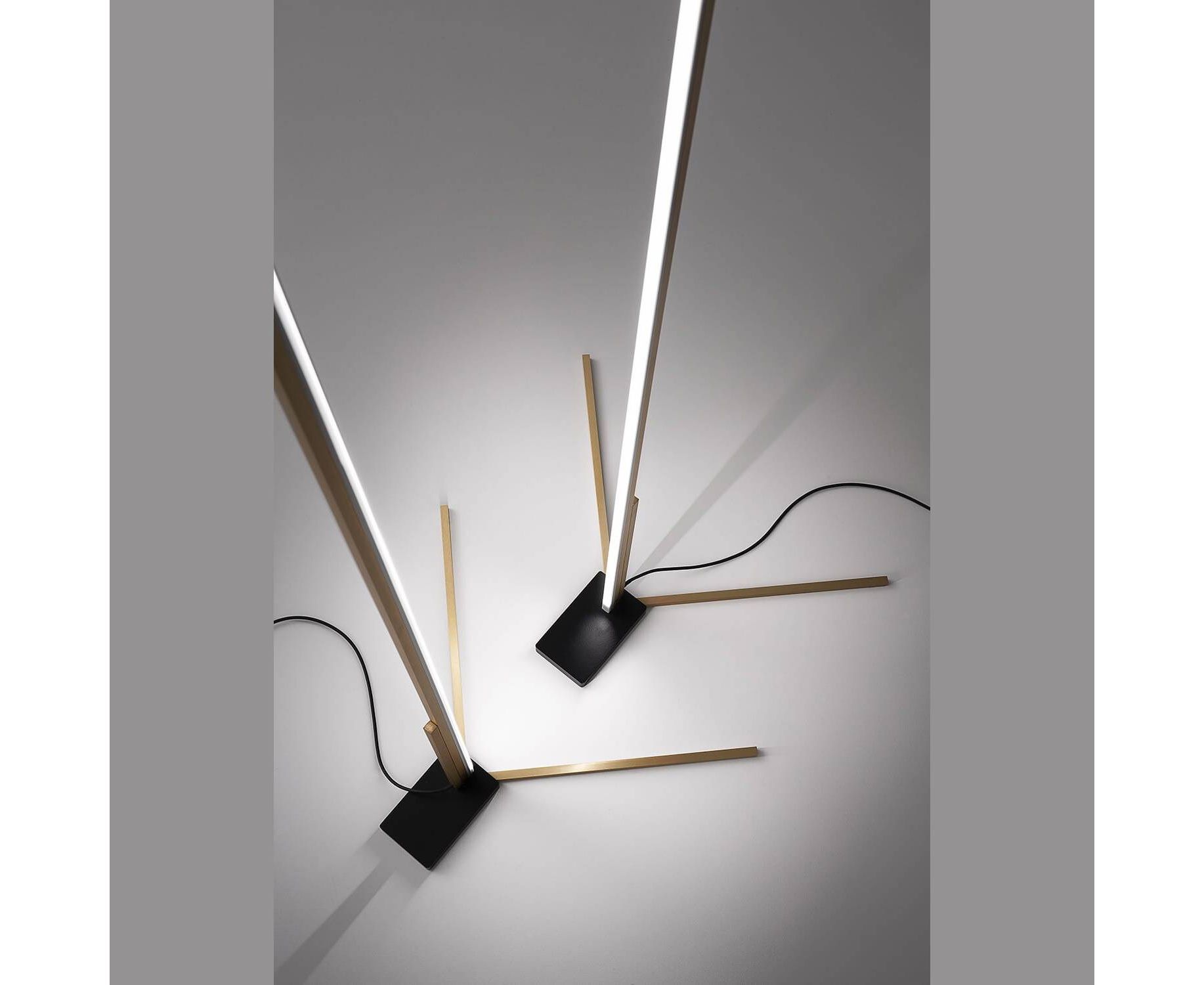 Напольный светильник с латунной/алюминиевой конструкцией. Отделывается латунью. Встроенный светодиодный модуль и опаловый диффузор.