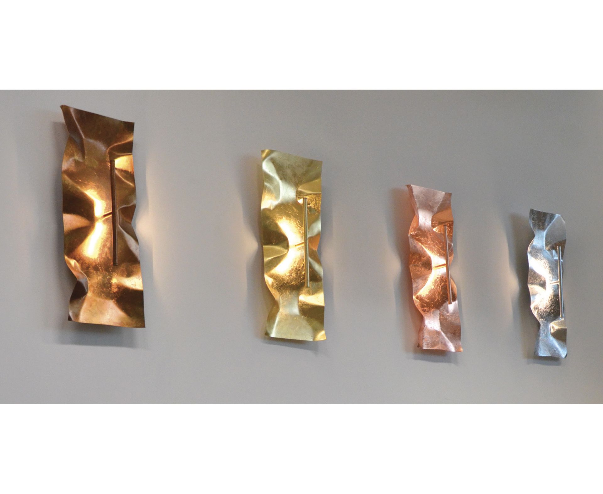 Сателлиты-Scultures в форме мятой стали ручной ковки, цвет-ледяной, общий вид монохроматичен сусальным золотом, серебром и полным белым блеском с отражающим светом.