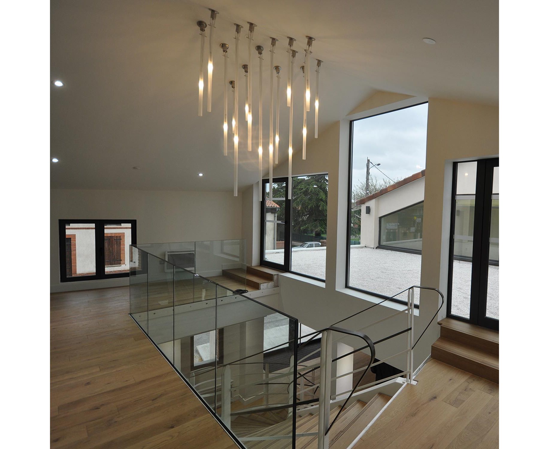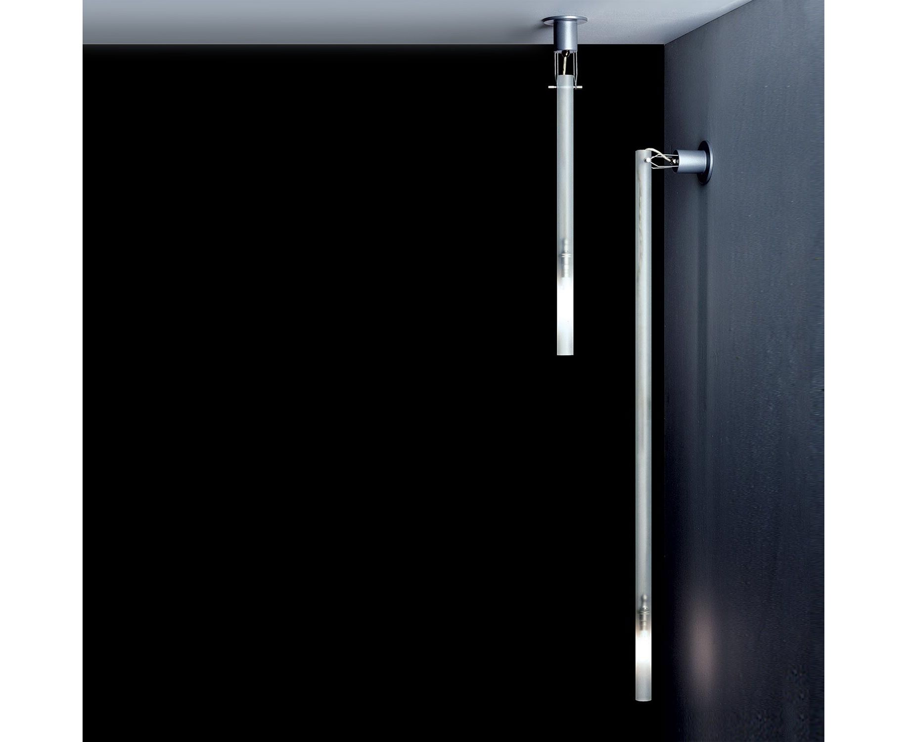 Подвесные или настенные / потолочные светильники с металлической структурой из сатинированного никеля, соединенной с матовым стеклянным цилиндром. Доступны разные длины. Доступны светодиодные и галогенные версии.