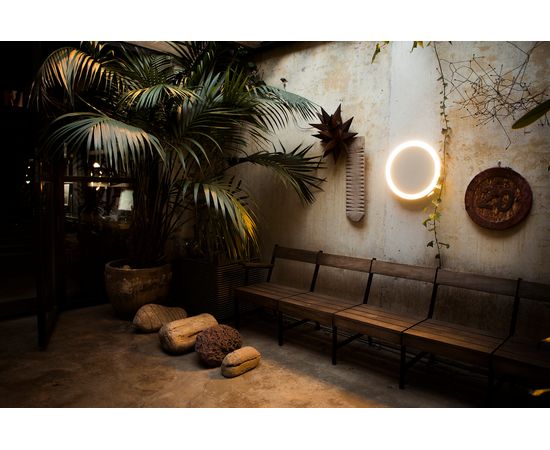 Непрозрачный центральный диск содержит светодиодный источник света, защищенный полупрозрачным цилиндрическим диффузором, создающим безбликовый ореол света. Его воздухонепроницаемость делает его пригодным для использования на открытом воздухе, обеспечивая его чистоту и сияние. Изначально Amigo был разработан для штаб-квартиры бренда в Беллохе (Барселона).