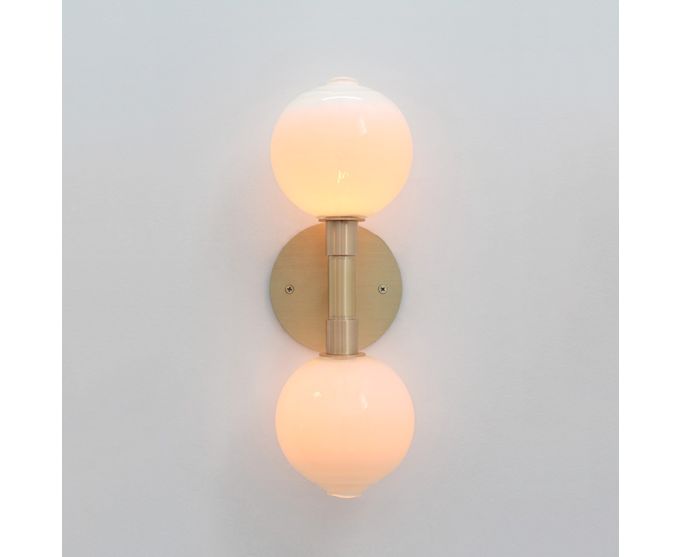 SkLO stem - это минимальные светильники, состоящие из одинарных или двойных освещенных сфер из выдувного чешского стекла, подвешенных на жесткой латунной ножке. Бра / потолочные светильники - это настенные или потолочные светильники в одинарной или двойной конфигурации. Сферы диаметром 11см. Сферы доступны в пяти цветах стекла. Сферические стеклянные диффузоры имеют фирменные двойные окаймленные огнем горелки SkLO, которые показывают, где стекло разбито из трубы воздуходувки, что делает каждый из них уникальным.