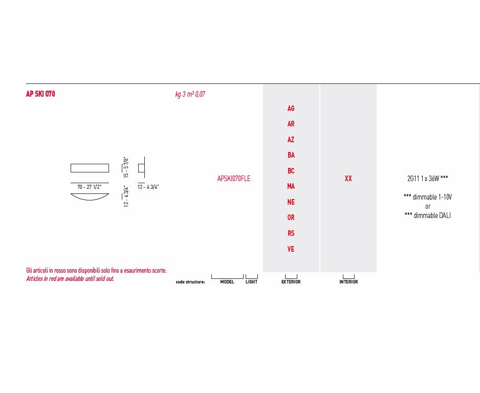 доступны отделки: AG серебряный (APSKI070FLEAGXX), AR оранжевый (APSKI070FLEARXX), AZ голубой (APSKI070FLEAZXX), OR золотой (APSKI070FLEORXX), BC белый (APSKI070FLEBCXX), MA коричневый (APSKI070FLEMAXX), NE матовый черный (APSKI070FLENEXX), RS огненно-кра