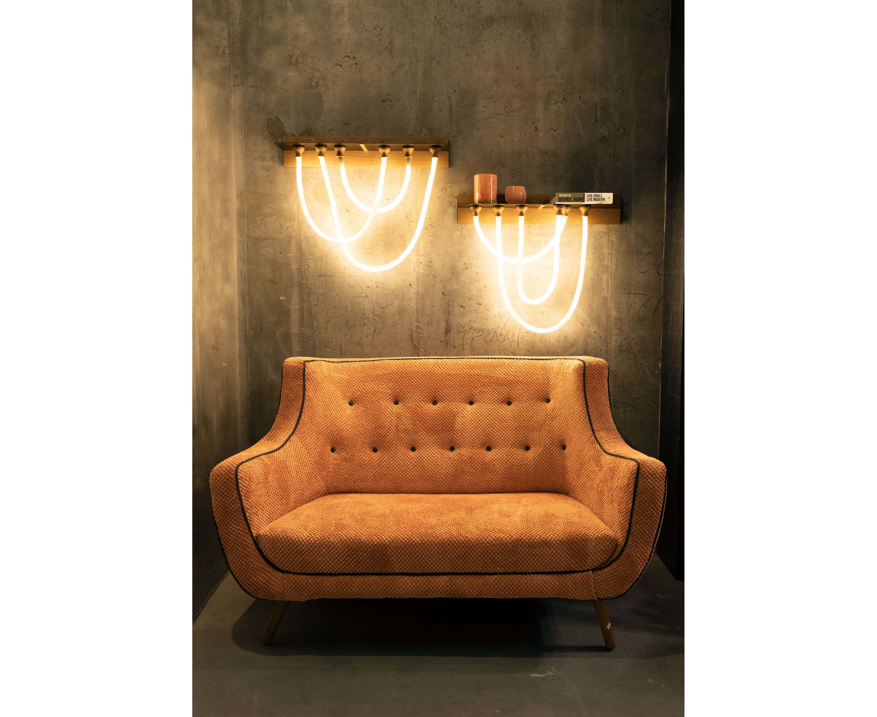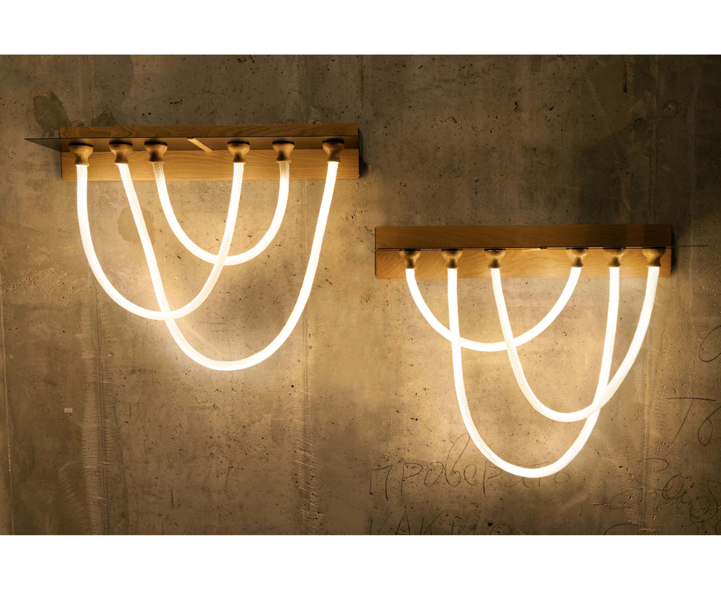 Click Light - это элегантный настенный светильник, подходящий для спален, жилых помещений и прихожих, а также коммерческих помещений, таких как рестораны и отели. Его материальность аккуратно сочетает в себе мягкое свечение текстильных канатов, гладкость полированного металла и теплую землистость дерева. Наряду с полкой настенный светильник Click Light предлагает игривую индивидуальность; веревки могут быть отделены от полки и реорганизованы творчески и легко.
