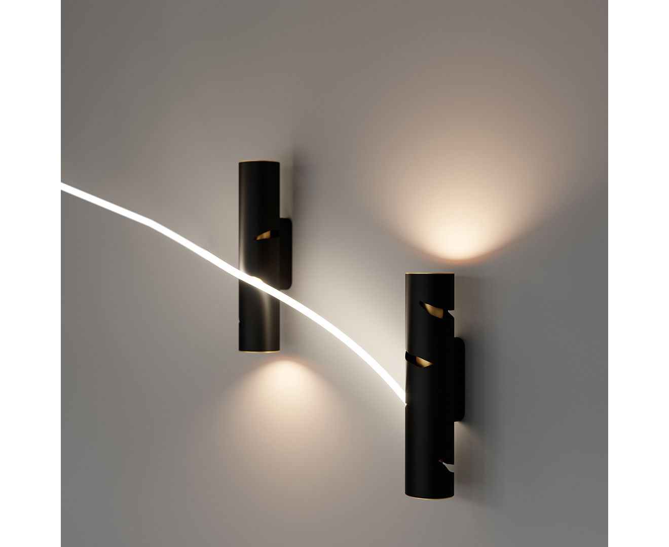 Он обладает полной гибкостью: начиная со свободы в количестве и расположении цилиндров, расширение состава может увеличиваться, чтобы соответствовать потребностям пространства. Цилиндры также могут стать соединительными элементами для нескольких световых линий, которые могут быть воспроизведены на основе 5-метрового модуля. Рассеянный свет, который генерирует светодиодная лента, может быть объединен с большим количеством пунктуальных излучений, вставленных в цилиндры, для создания световых ландшафтов, соответствующих функциональным потребностям.