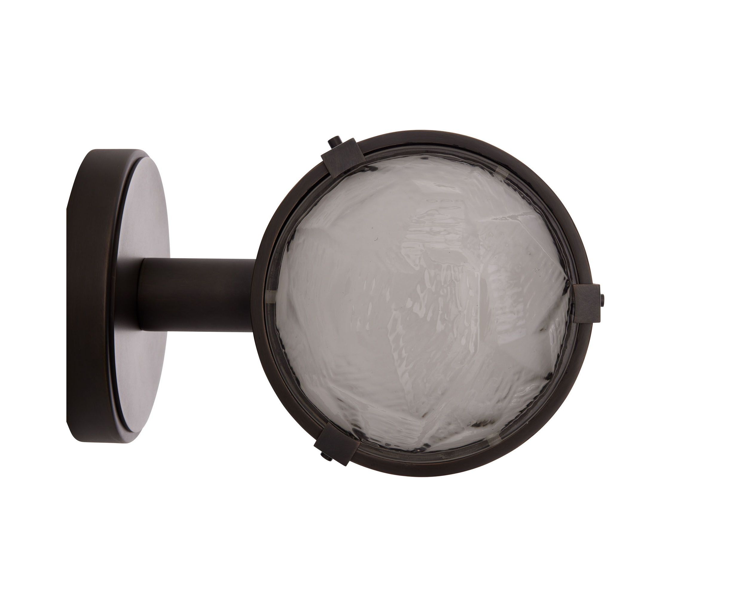Это универсальное бра может быть установлено вертикально или горизонтально, освещая с боков или вверх и вниз. Формованное прозрачное стекло создает освещение с двух сторон стальной рамы из английской бронзы.
