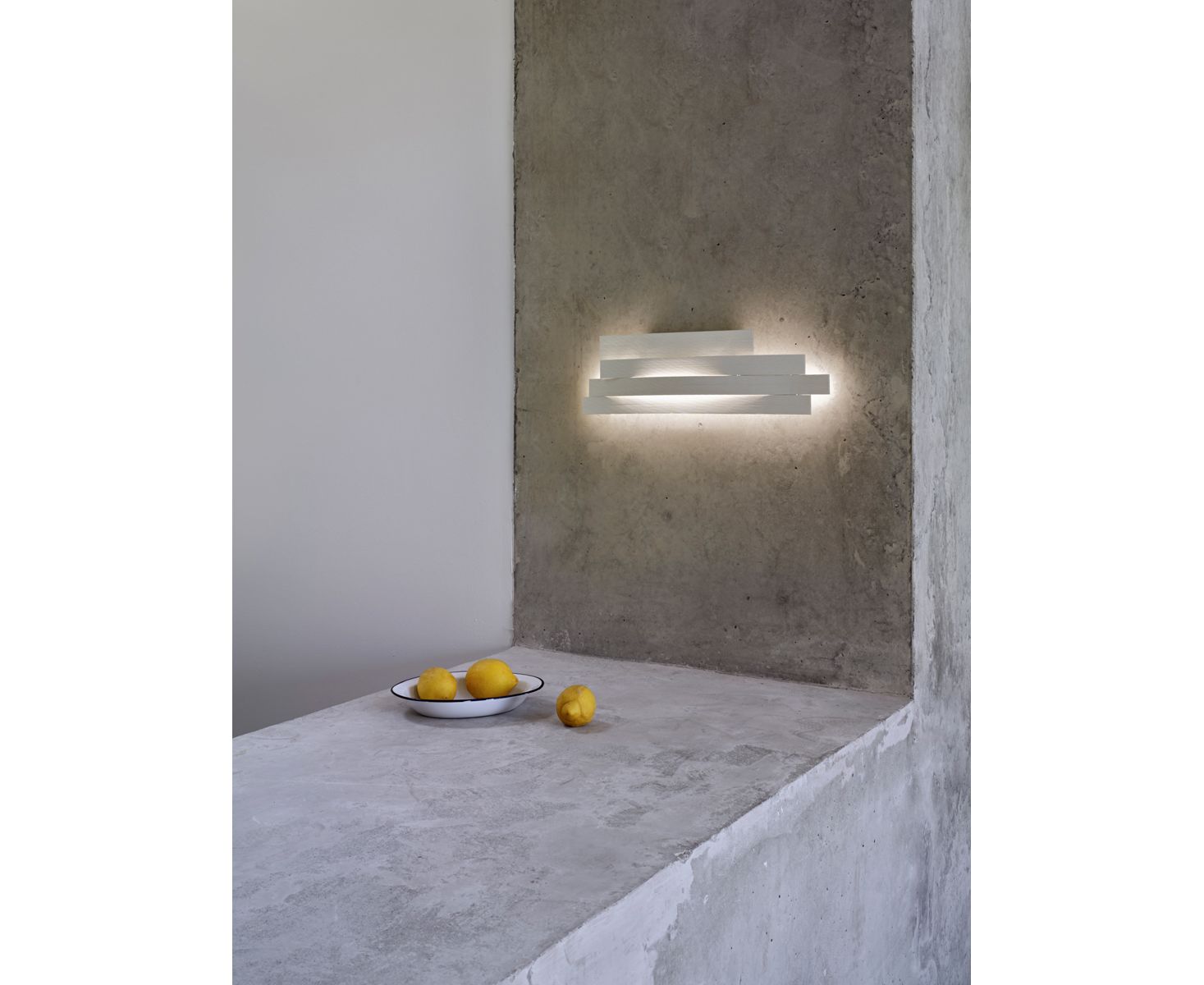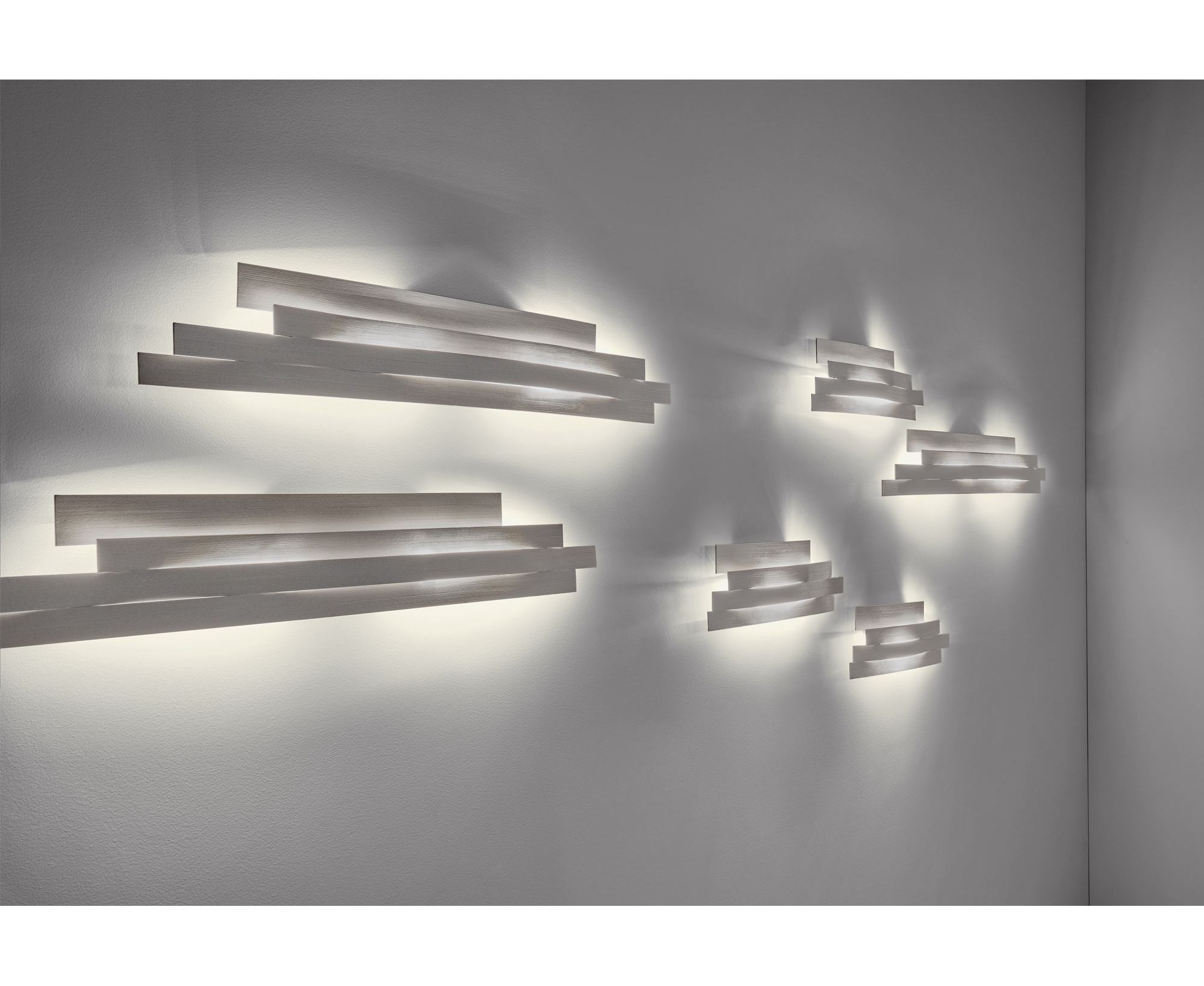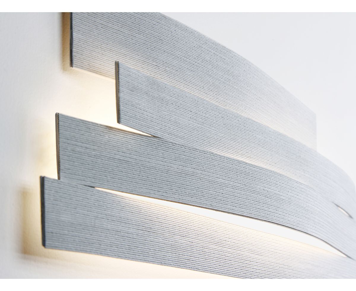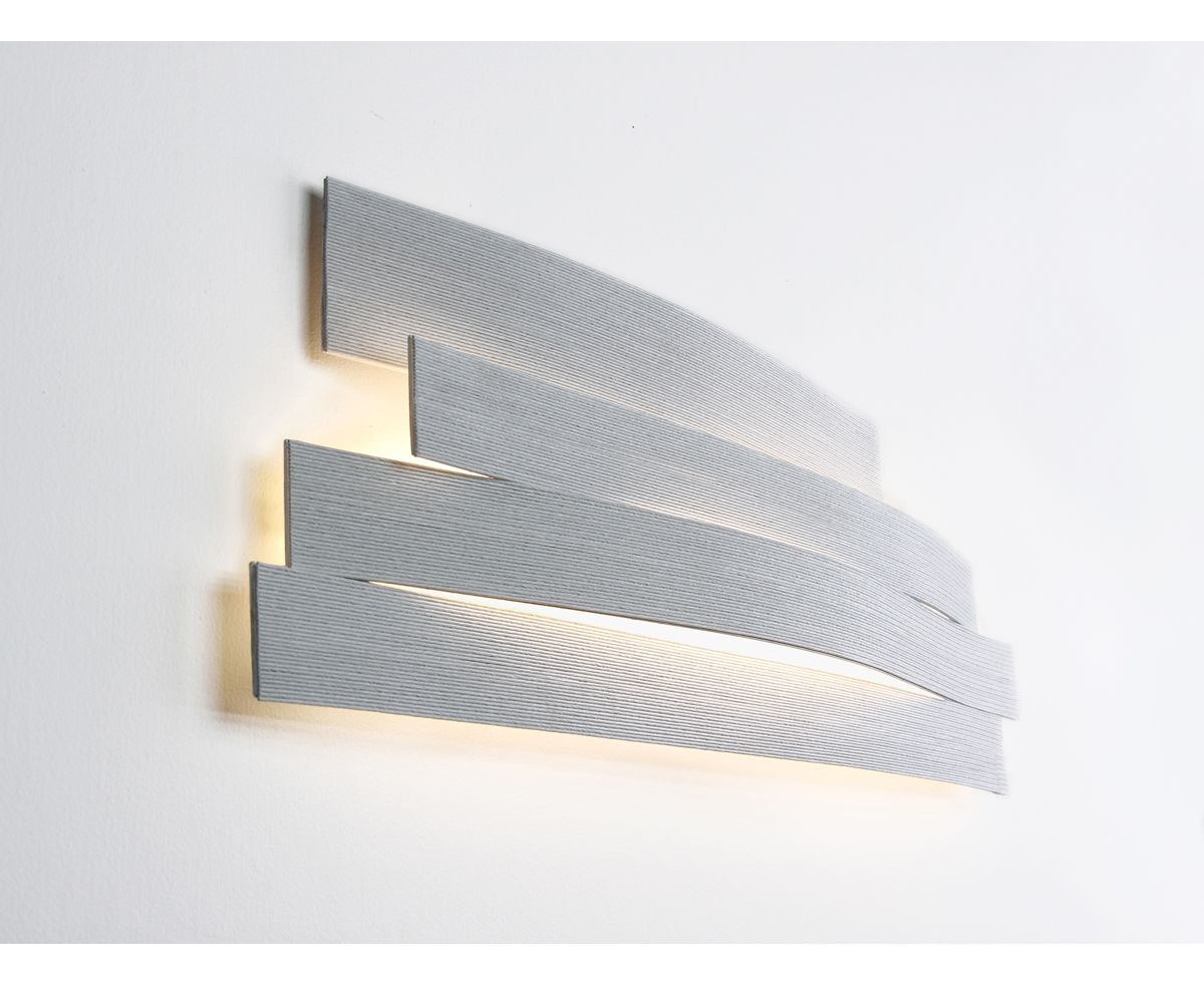 Эта коллекция настенных светильников изготавливается из полос прессованной целлюлозы, полученной путем органической переработки. Материал, используемый в Японии для упаковочных целей с 16-го века, благодаря своей высокой стойкости идеально подходит для создания изогнутых линий различной длины, из которых состоит лампа. Использование светодиодных технологий способствует повышению устойчивости этого объекта, который, подобно мягким морским волнам, омывает стены тонкой яркостью, которая пронизывает их полосы.