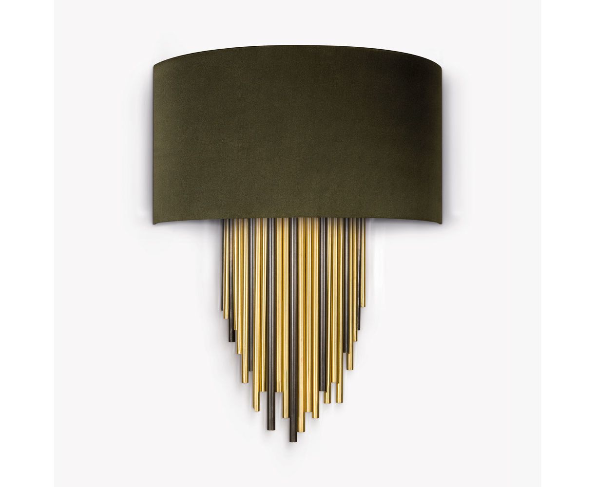Эта поразительная конструкция настенного светильника Empire State, изготовленная из цельной латунной трубки в шахматном порядке, дополнена абажуром-полумесяцем и доступна в различных металлических вариантах.