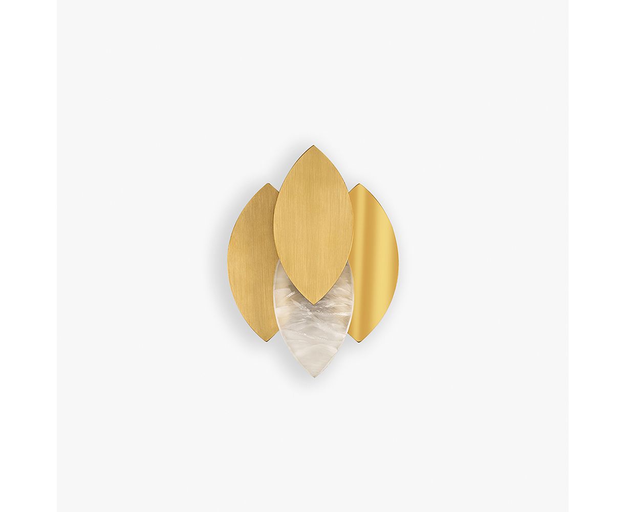 Согласно греческой легенде, лотос приносит плоды, которые оставляют его потребителя в задумчивости и довольных размышлениях. Это также долго было символом мира и чистоты во всем мире. Такие ассоциации наделили его божественной энергией и потусторонним качеством, которому подражали дизайнеры. Подобные щиту лепестки этого дизайна отделены друг от друга, позволяя мягкому сиянию обрамлять каждый из них. Медные пластины акцентированы вырезанными вручную лепестками люцита, которые мягко преломляют свет. Это сочетание источает красоту, грацию и гламур.