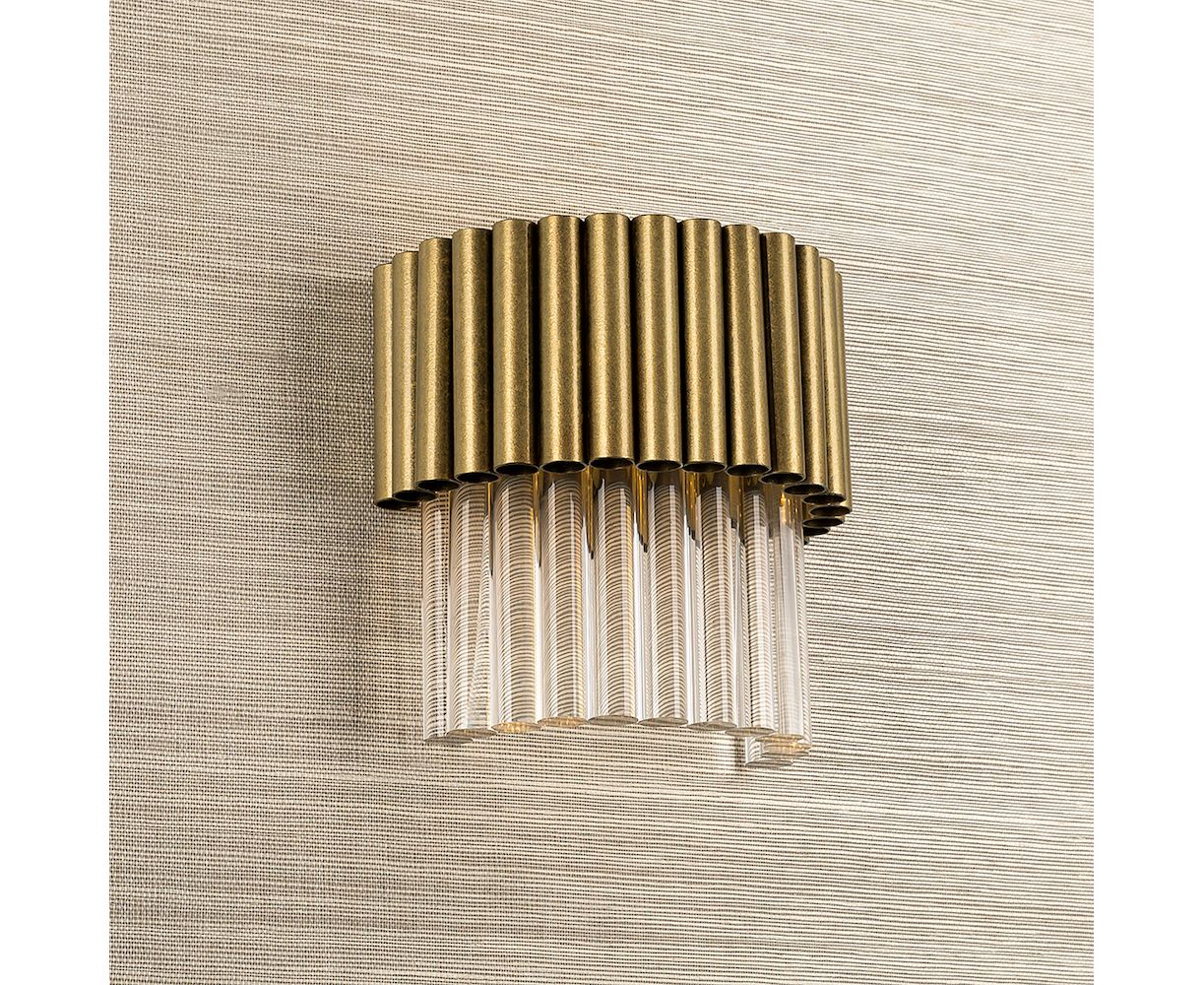 Новый стильный настенный светильник, вдохновленный бруталистическими дизайнами 1970-х годов, который доступен в новых потертых отделках. Этот дизайн сделан из серии случайных медных труб и стержней Lucite, которые производят уникальный образец современной настенной скульптуры с достаточным световым эффектом. Этот настенный светильник соответствует новой люстре.