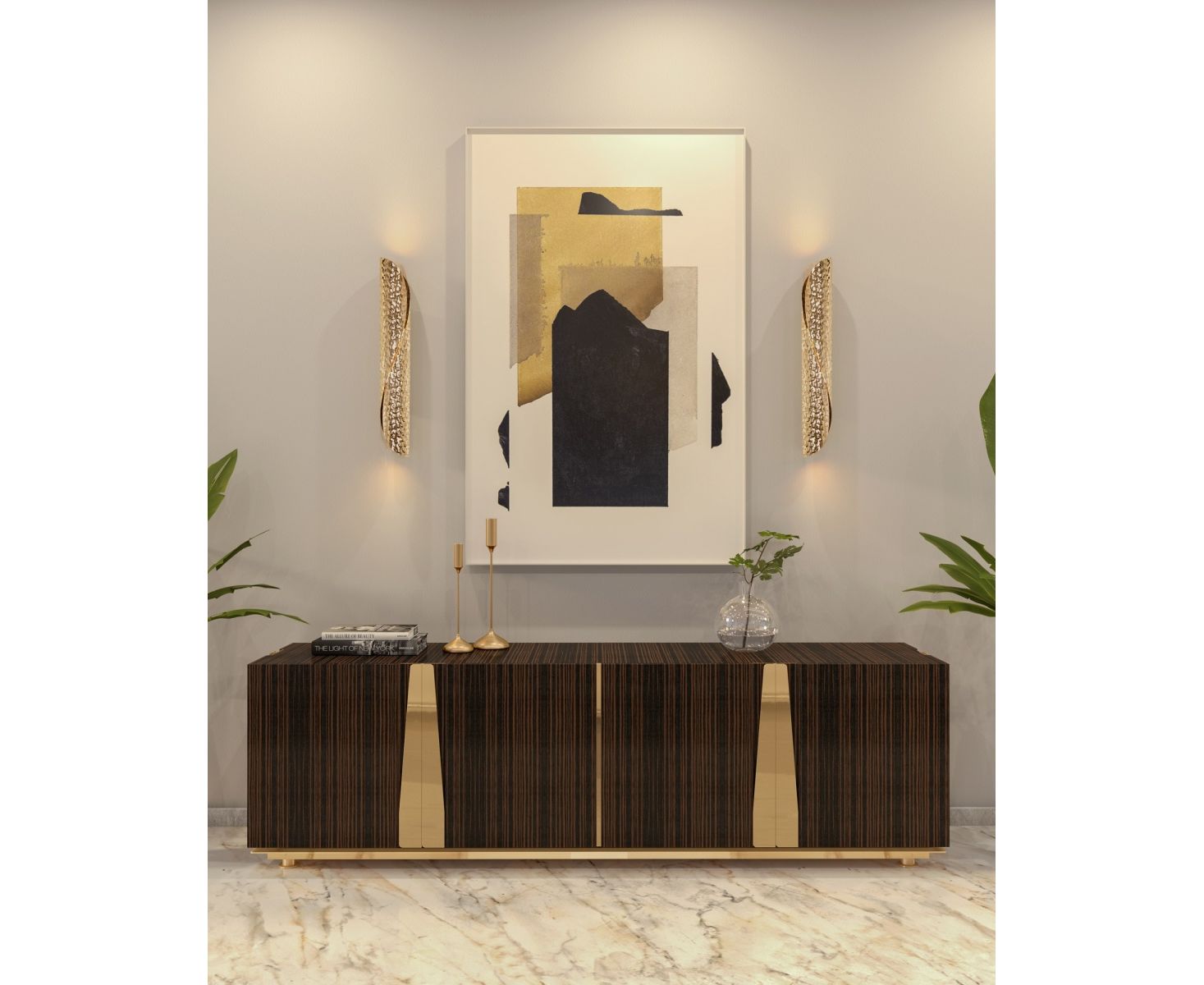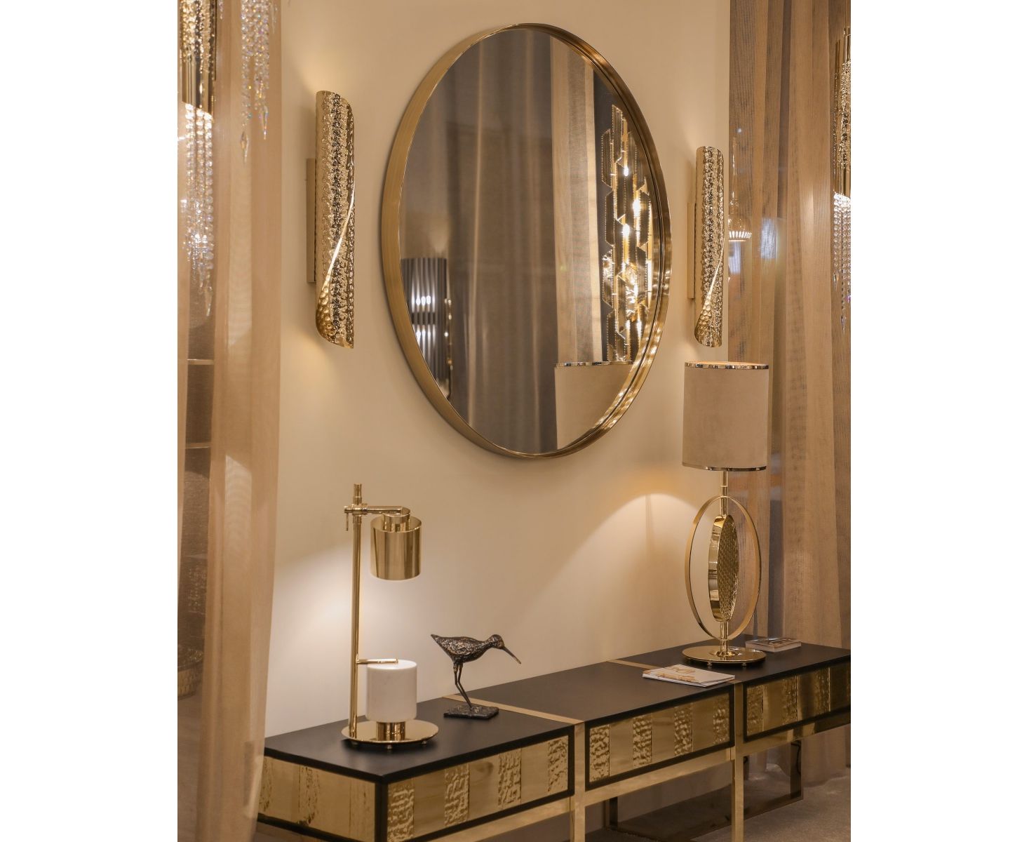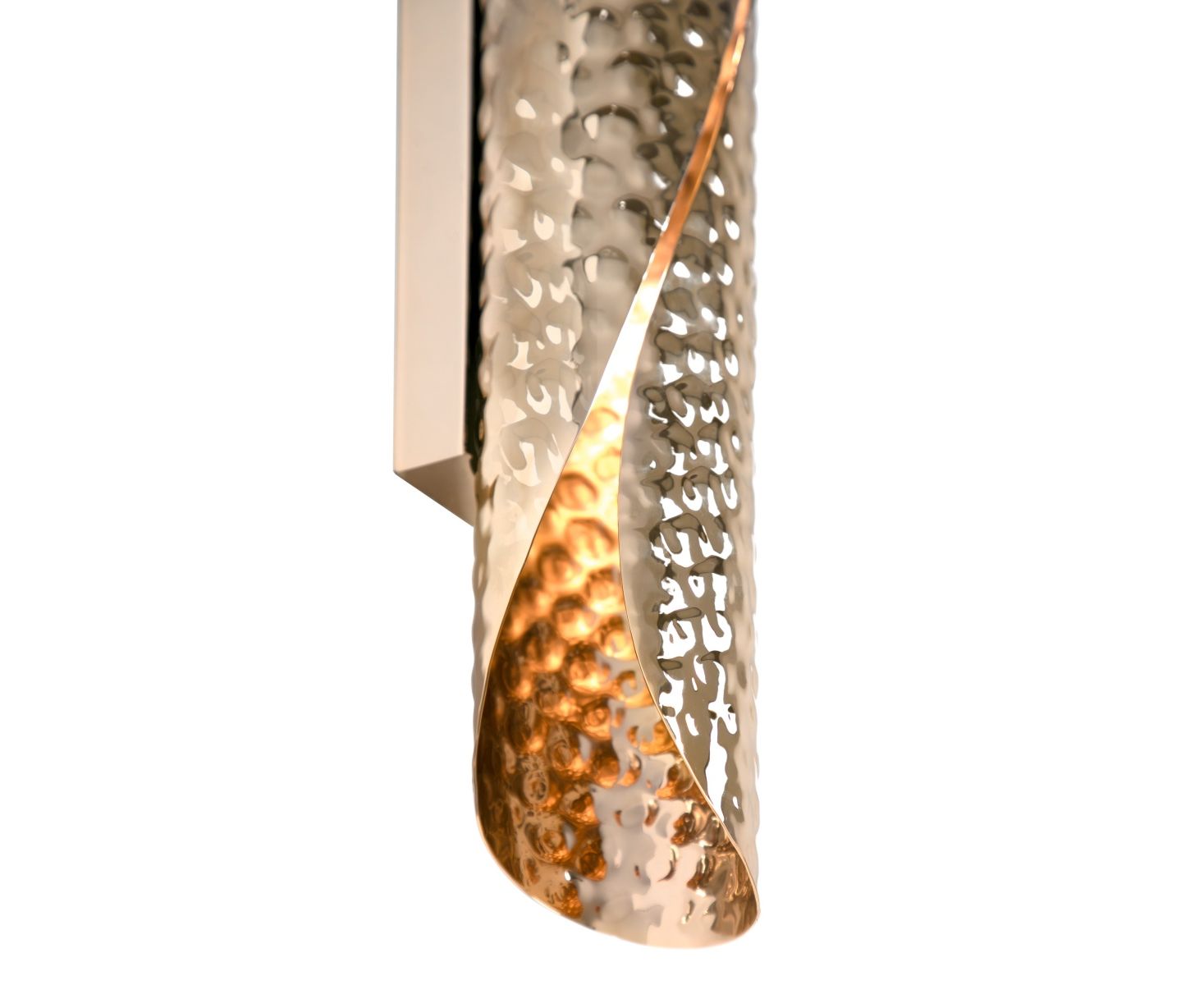 Разработанный, чтобы быть захватывающим и блестящим основным моментом в проекте дизайна интерьера, он сочетает в себе современную простоту с элегантной и роскошной изюминкой. Украшение настенного освещения придает внутреннему пространству потрясающий золотой блеск, так как его теплый свет распространяется нежным, деликатным образом.