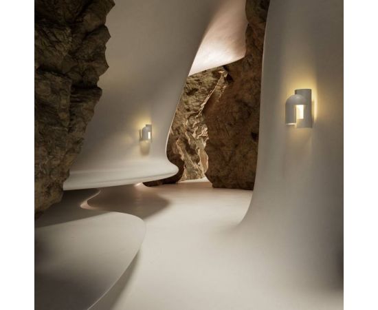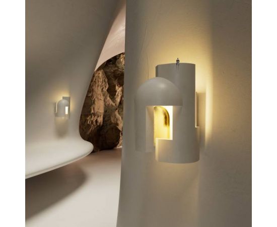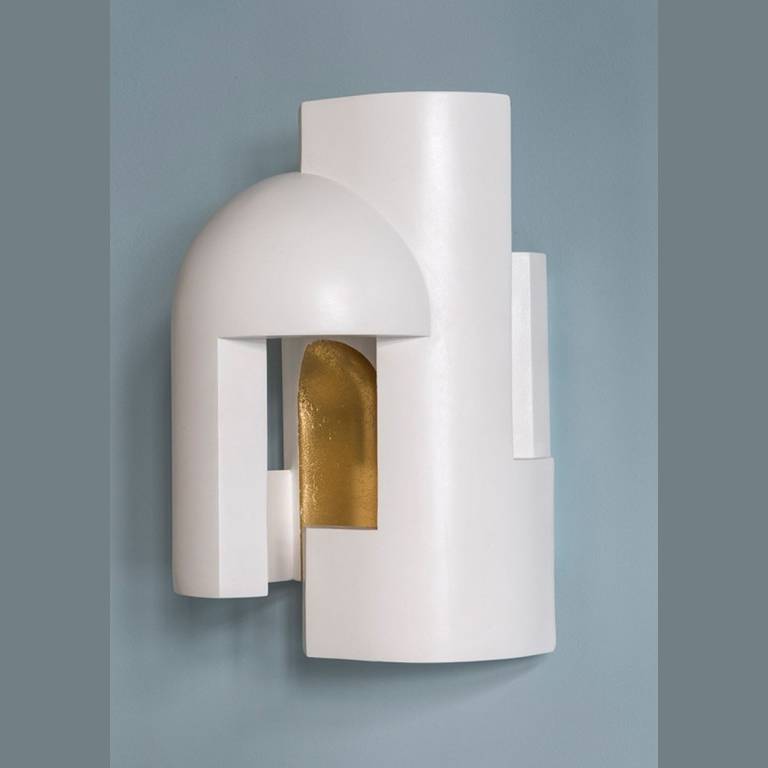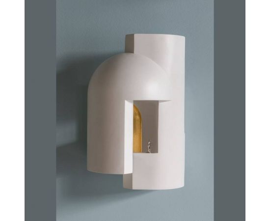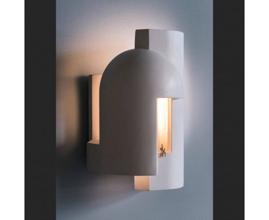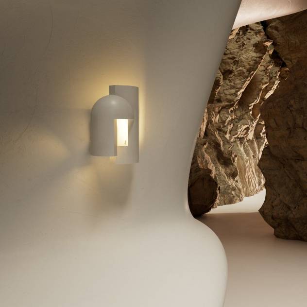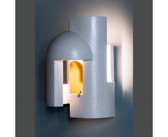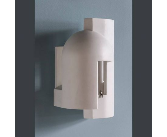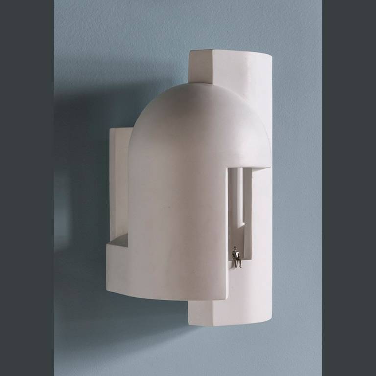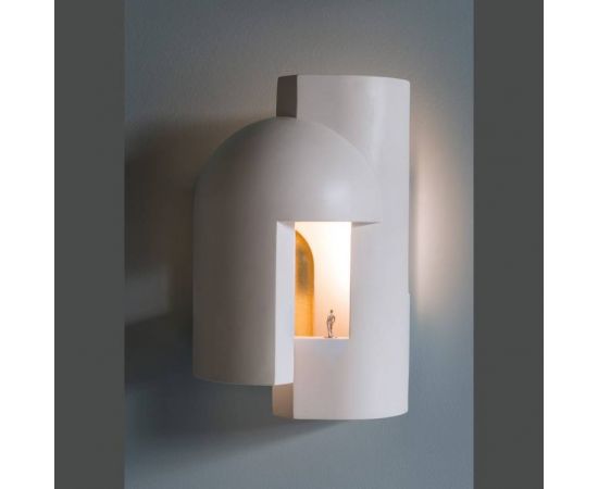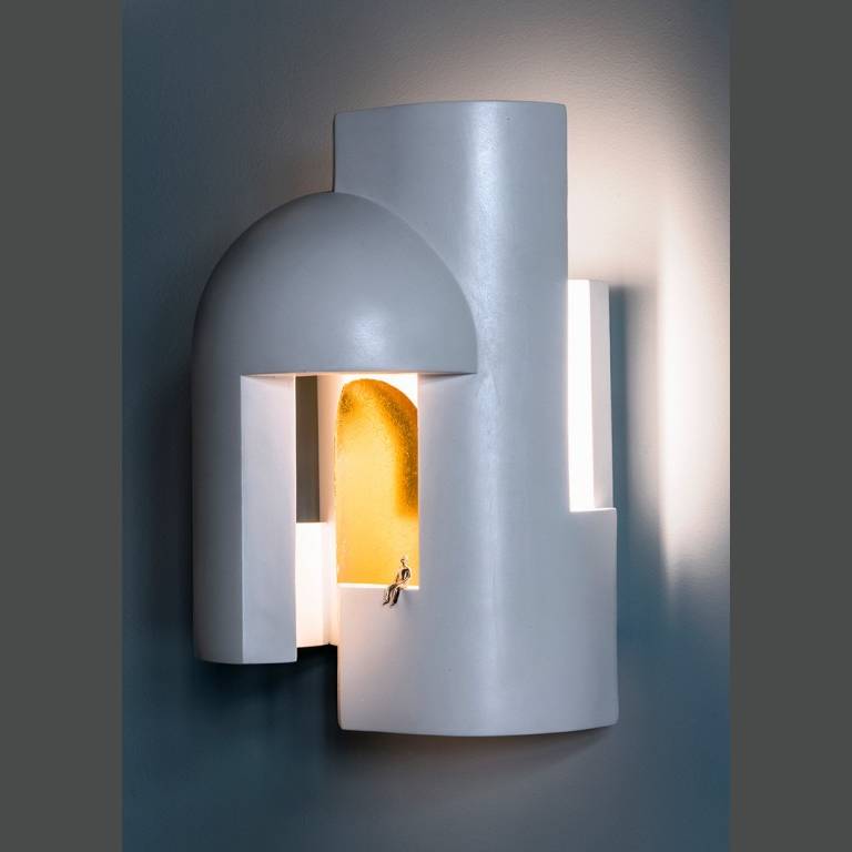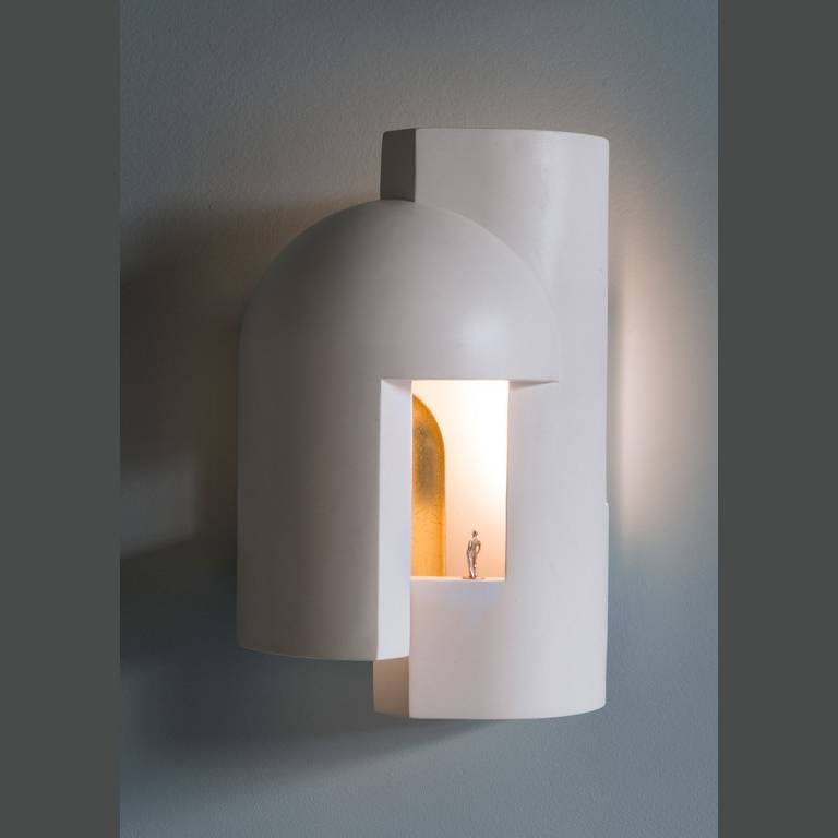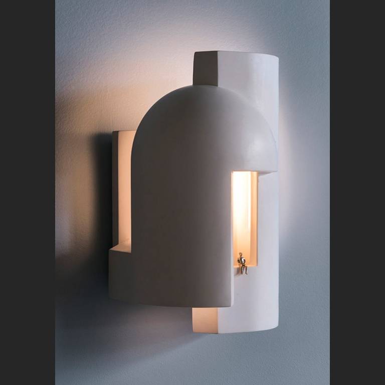 Гипсовая лампа, предназначенная в качестве настенного светильника и предназначенная для того, чтобы ее внимательно рассматривали, как будто вы входите в темный переулок в сумерках и внезапно вас пронзает сюрреалистический луч света.
