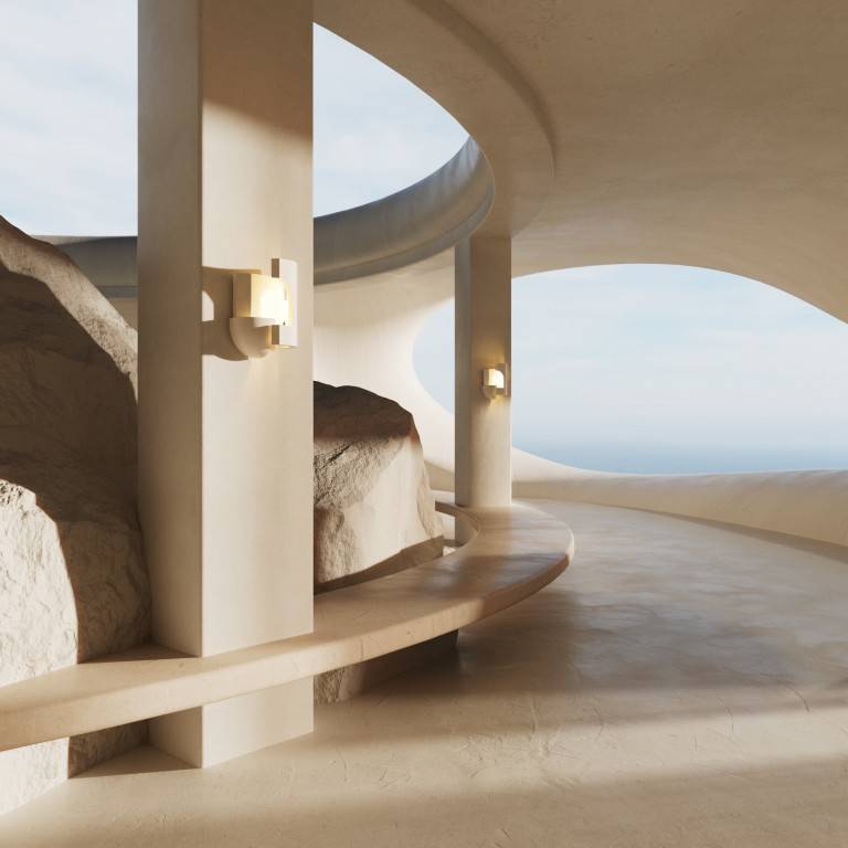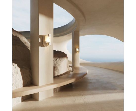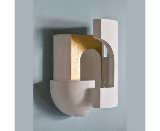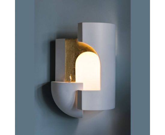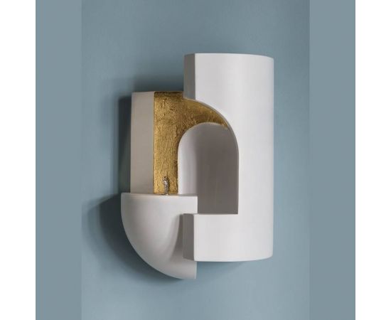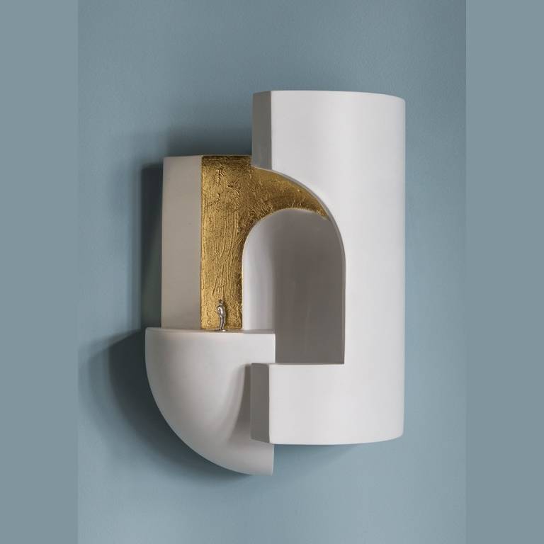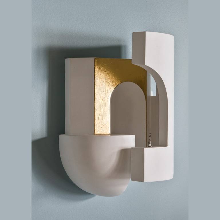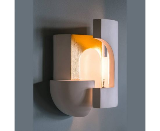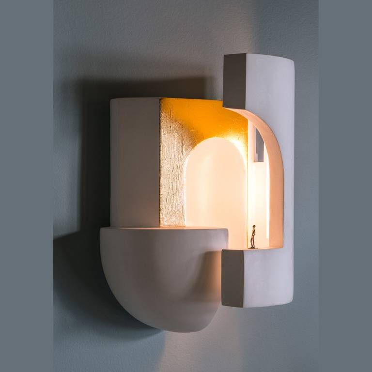 Гипсовая лампа, предназначенная в качестве настенного светильника и предназначенная для того, чтобы ее внимательно рассматривали, как будто вы входите в темный переулок в сумерках и внезапно вас пронзает сюрреалистический луч света.