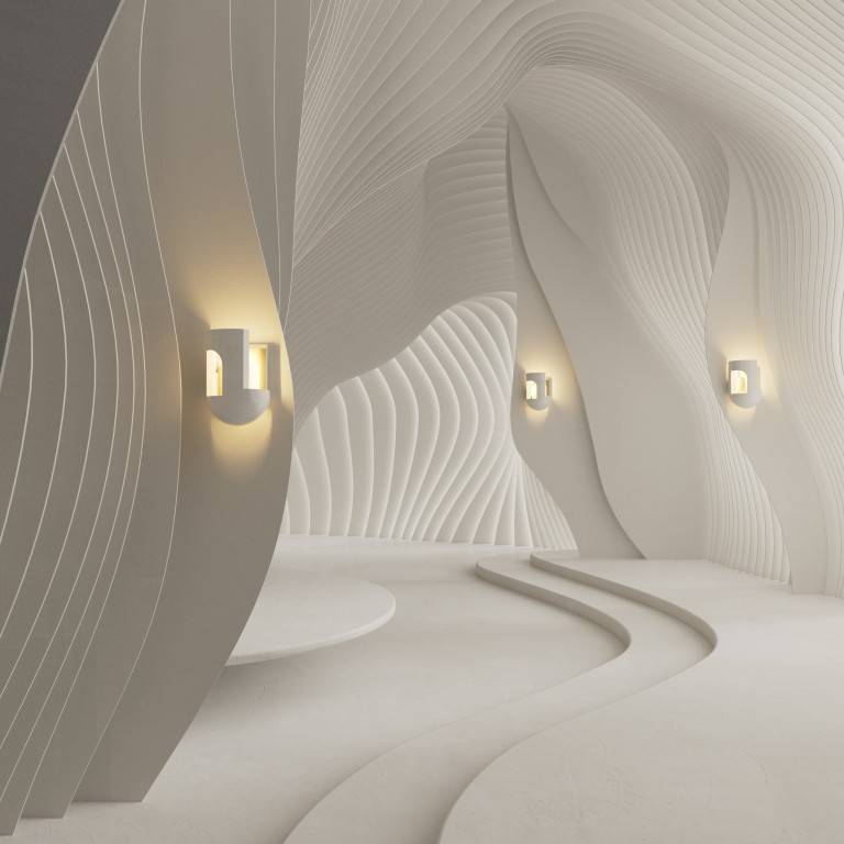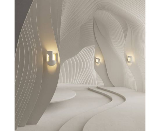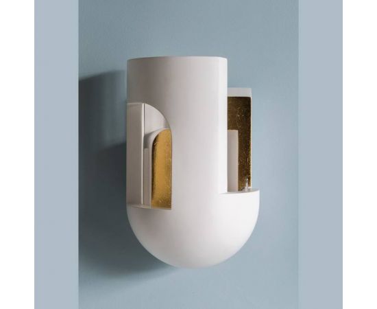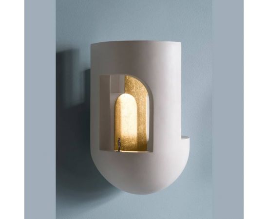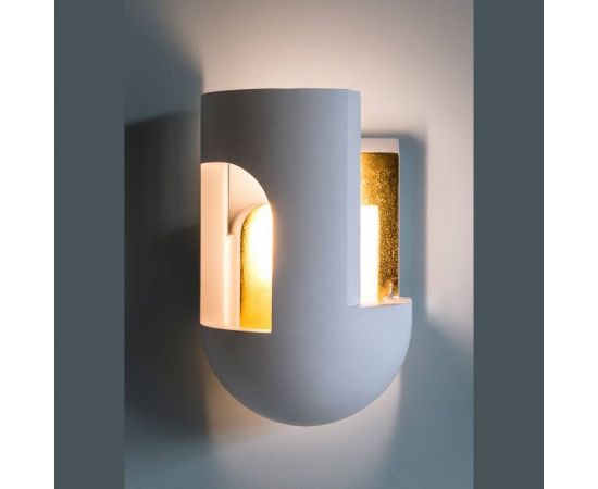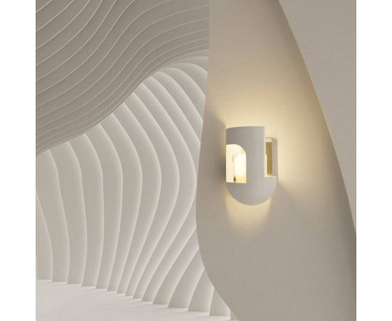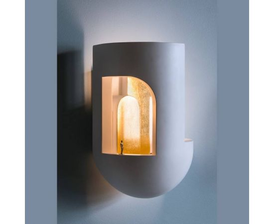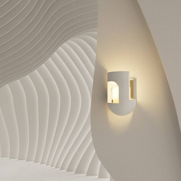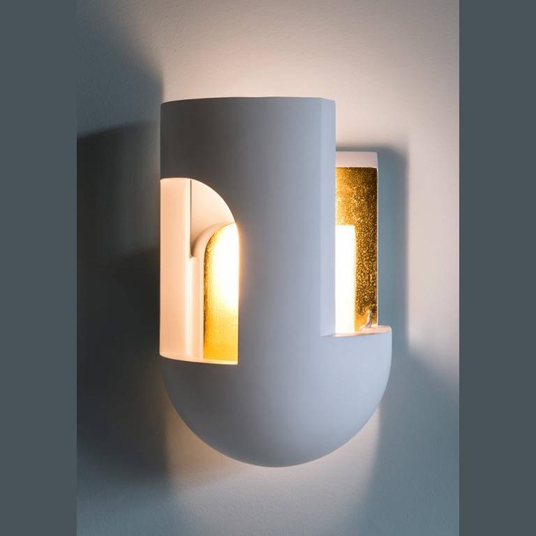 Гипсовая лампа, предназначенная в качестве настенного светильника и предназначенная для того, чтобы ее внимательно рассматривали, как будто вы входите в темный переулок в сумерках и внезапно вас пронзает сюрреалистический луч света.