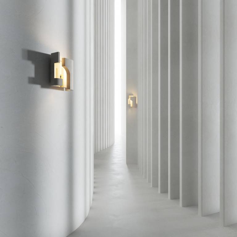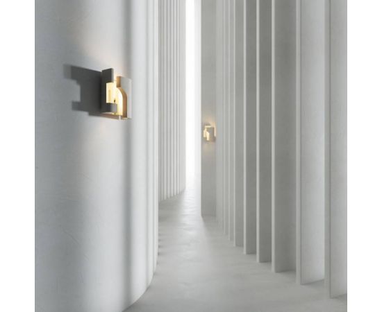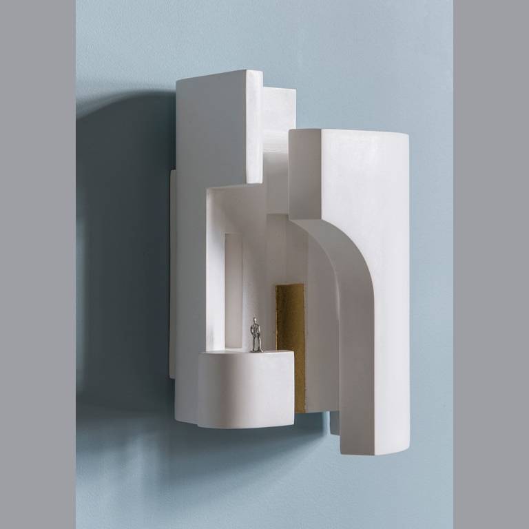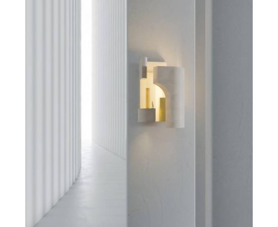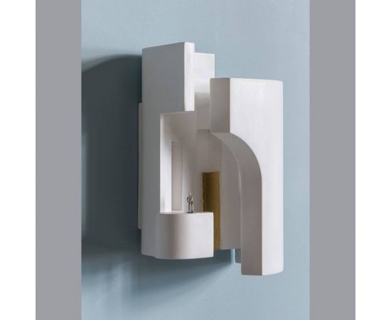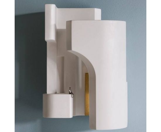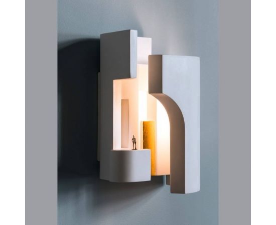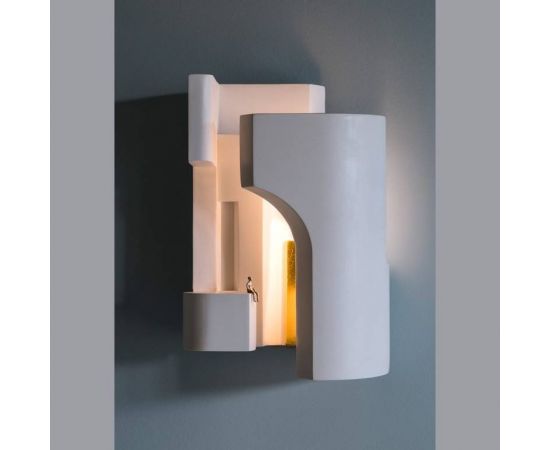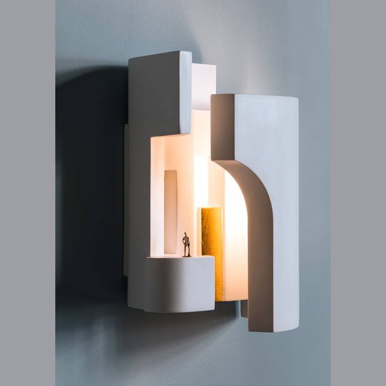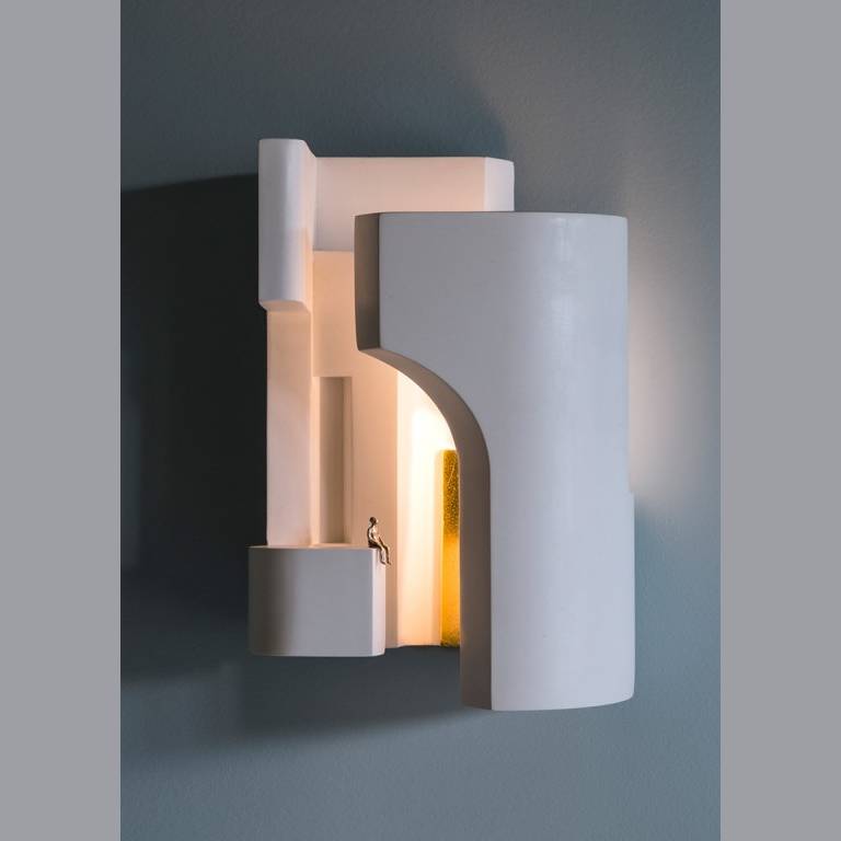 Гипсовая лампа, предназначенная в качестве настенного светильника и предназначенная для того, чтобы ее внимательно рассматривали, как будто вы входите в темный переулок в сумерках и внезапно вас пронзает сюрреалистический луч света.