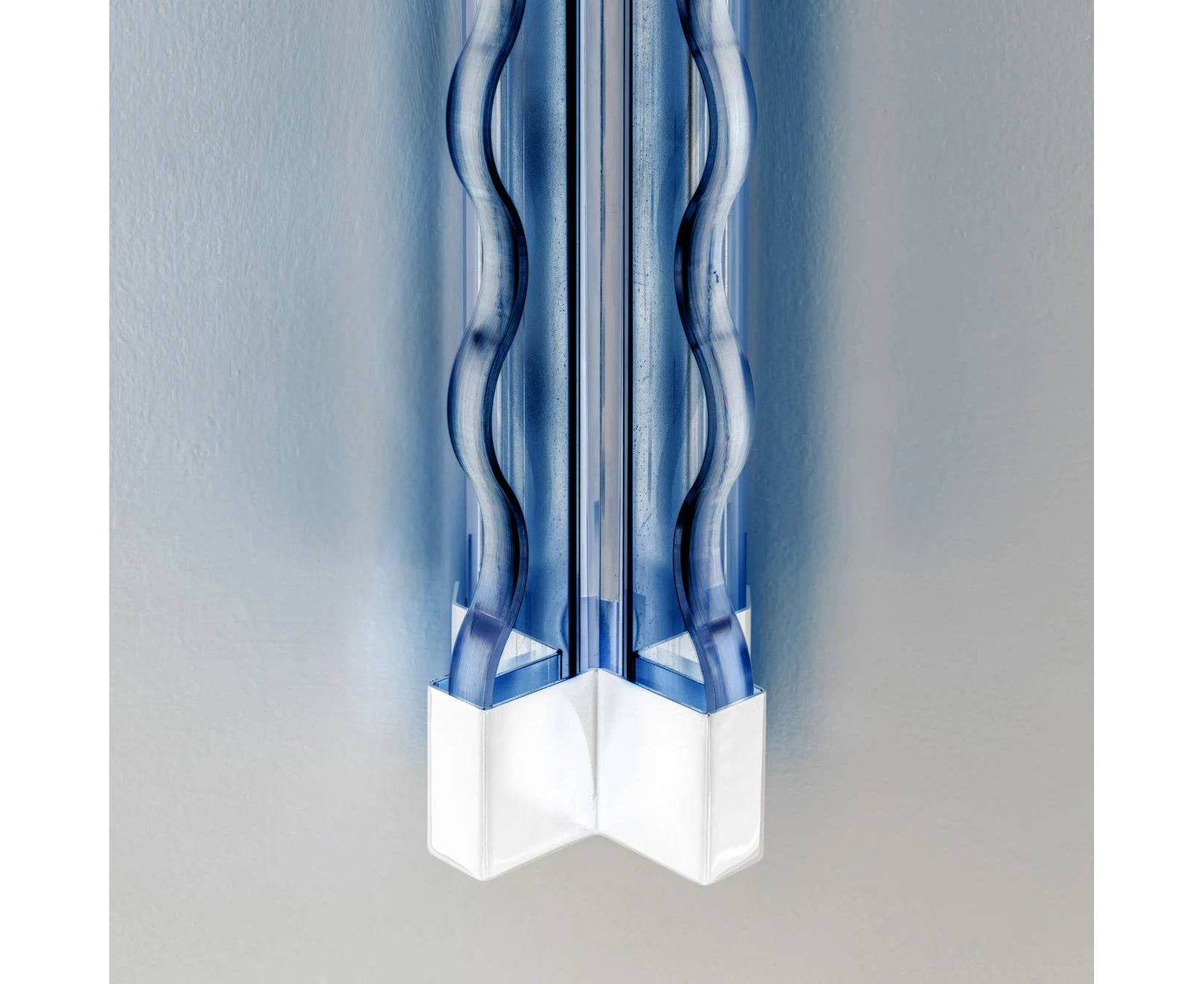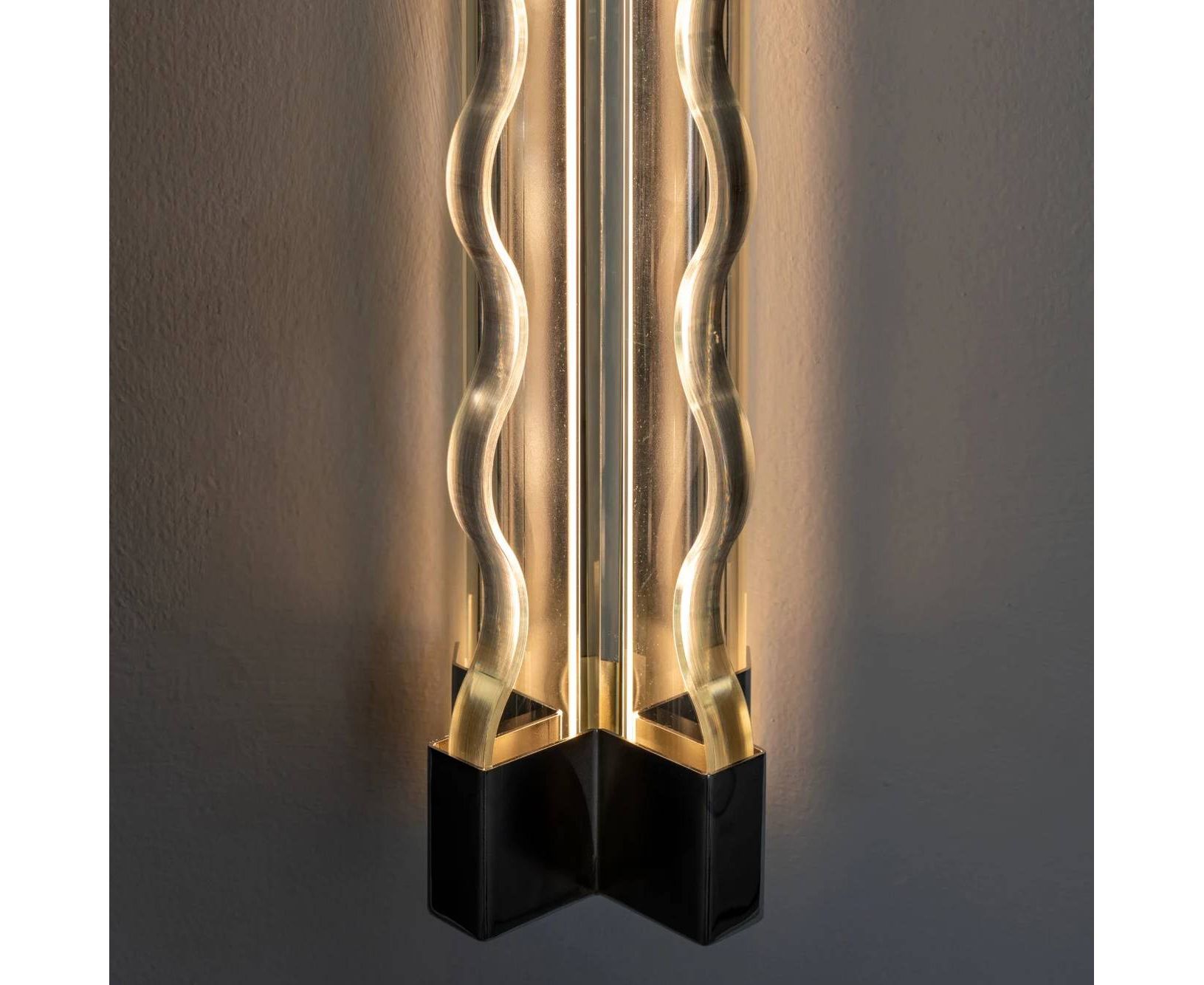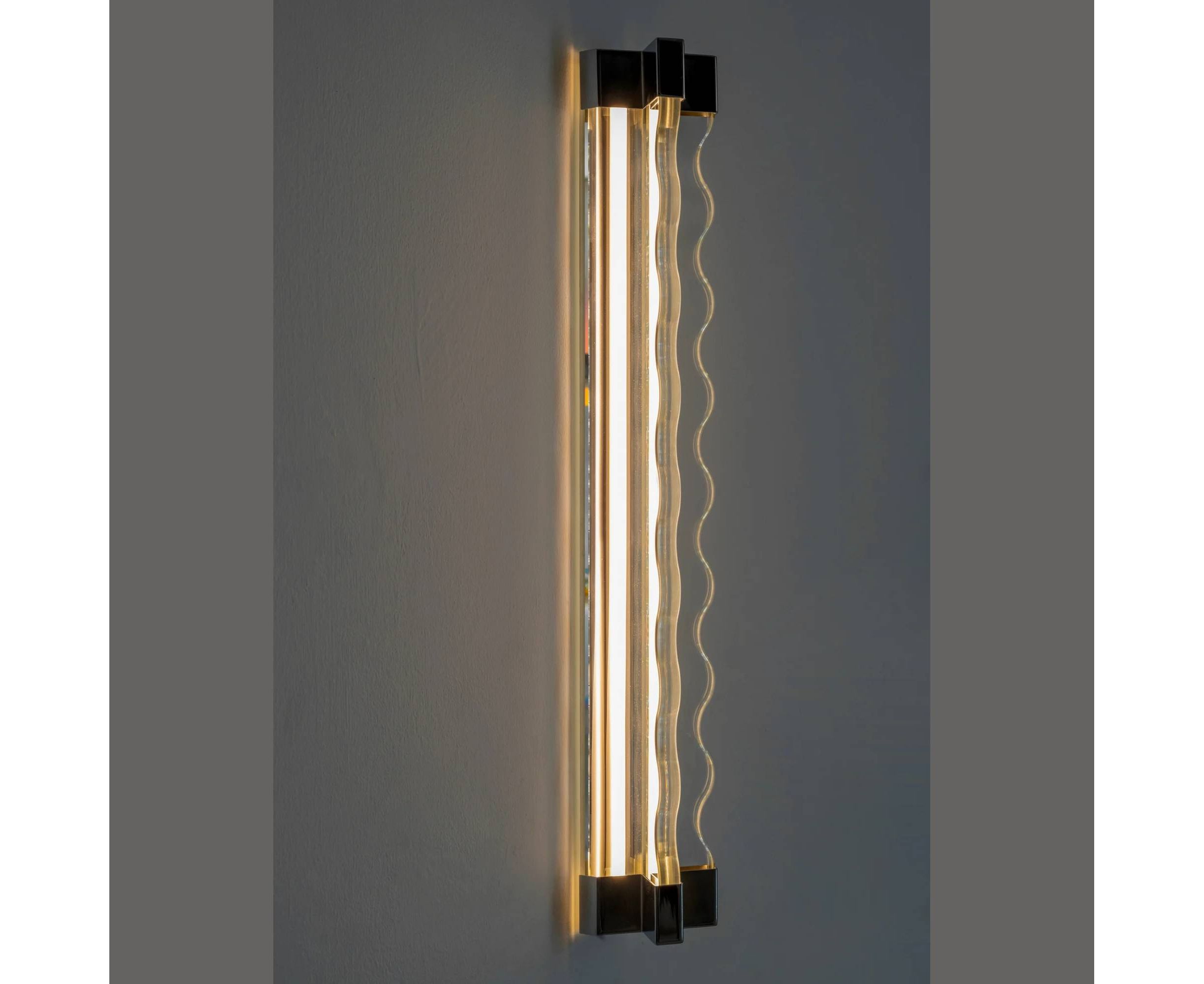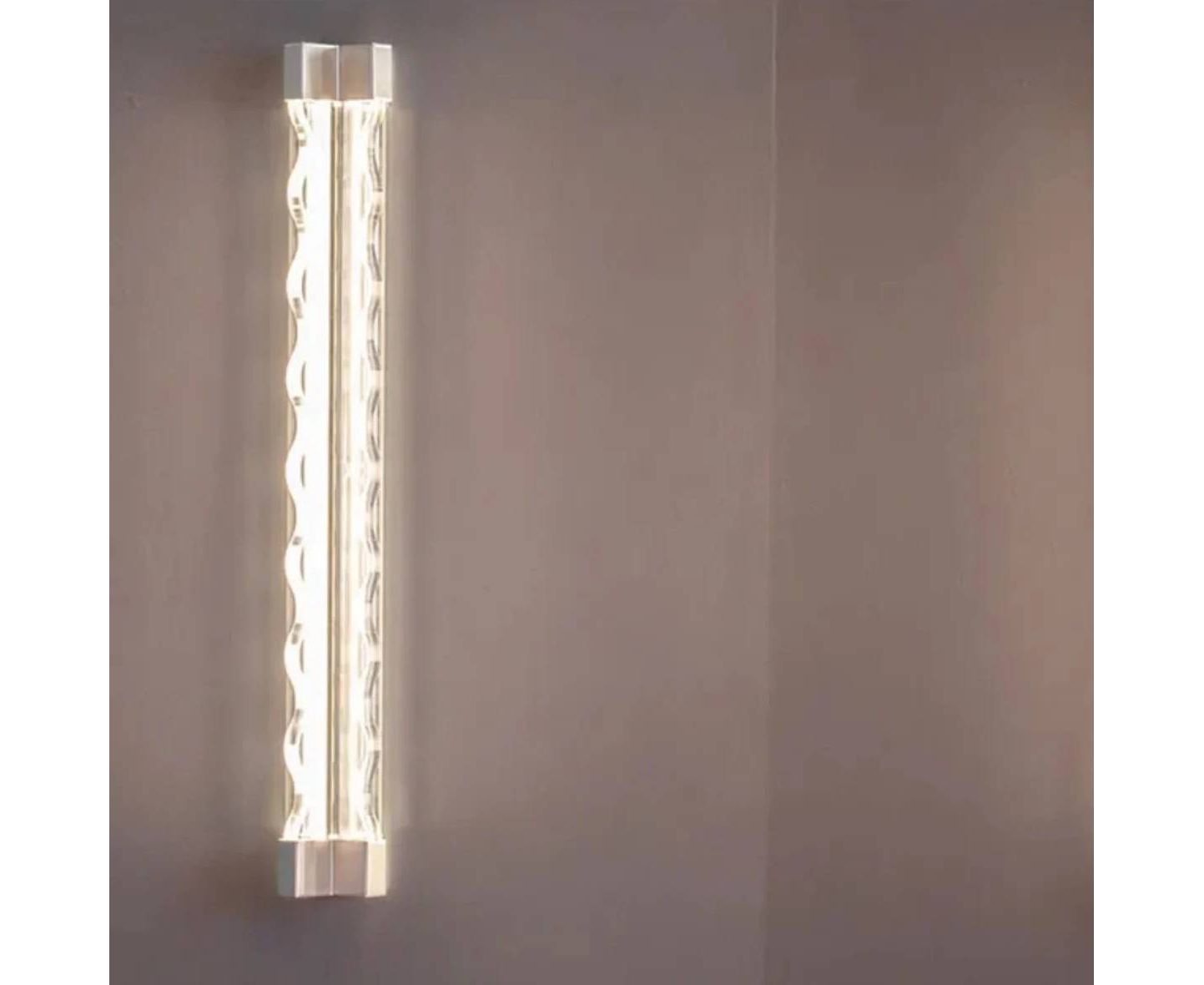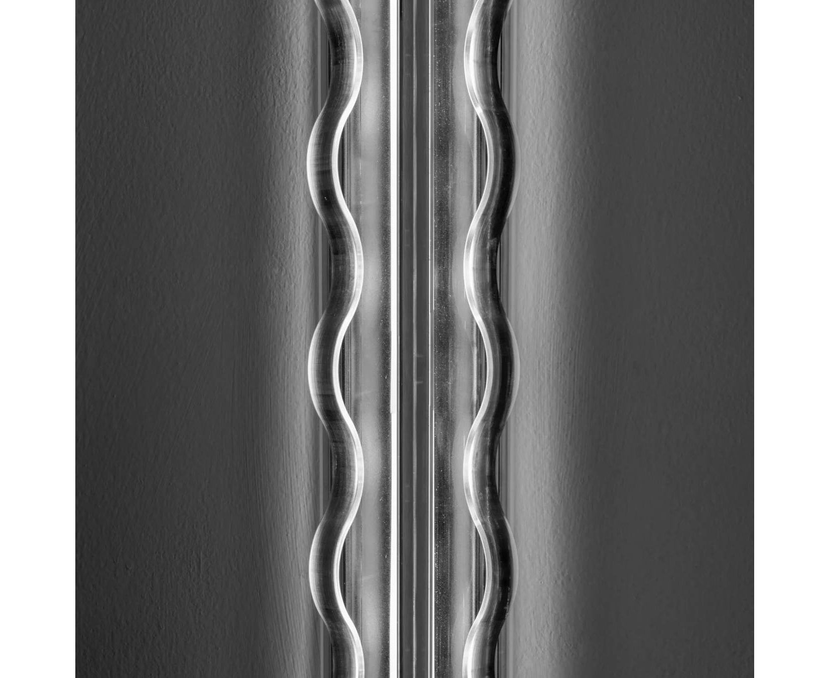 Настенный светильник FRENESI от FontanaArte выполнен в виде струящегося потока воды, волны сквозь которую пробивается мягкий свет. Доступен в настенной версии длинной 65 см. Изготовлен из стекла толщиной 19 мм.